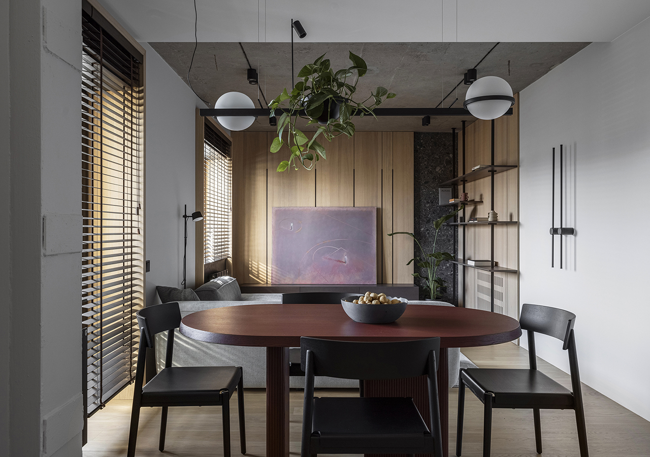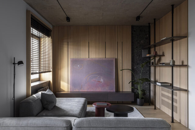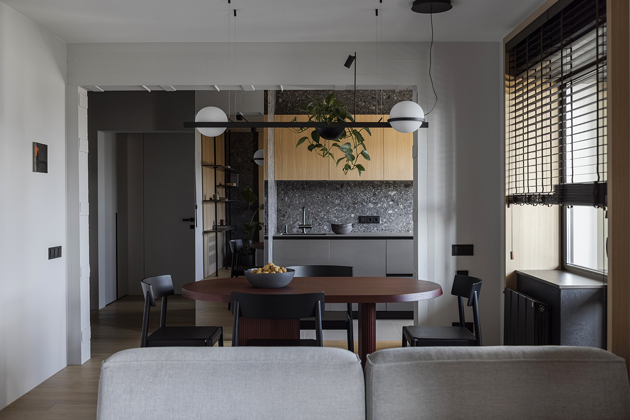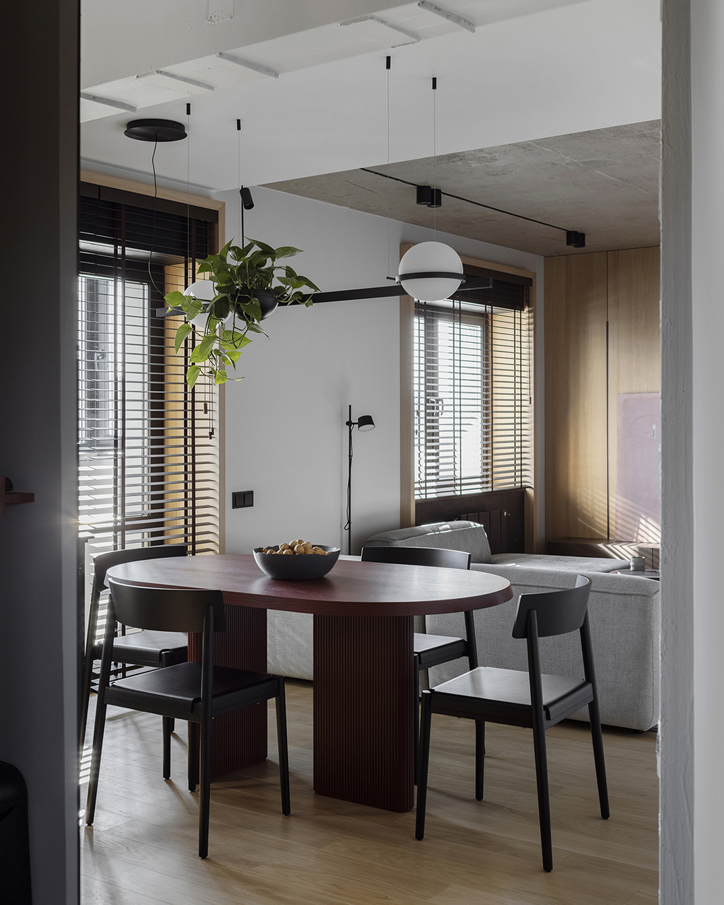 Квартира находится в старом жилом фонде (дом 1986-го года постройки), что создало ряд сложностей в процессе ремонта. Был выполнен большой комплекс демонтажных работ. Демонтированы старая стяжка и штукатурка, заменены окна, балконные рамы, радиаторы отопления и другие коммуникации. Высота потолков в квартире довольно небольшая и составляет около 2,6 метра. В зоне гостиной было принято решение расчистить существующий бетонный потолок. Для визуального увеличения высоты пространства мы использовали в интерьере большое количество вертикальных линий. Также, чтобы визуально сделать окна выше, мы решили обрамить их деревянными порталами большей высоты, чем сами окна. Внутренние части порталов (над и под окнами) задекорировали штукатуркой черного цвета, что визуально сделало окна выше и наряднее.