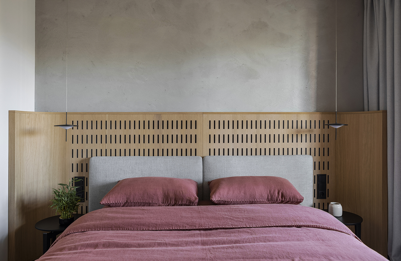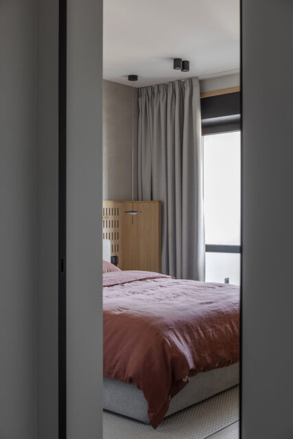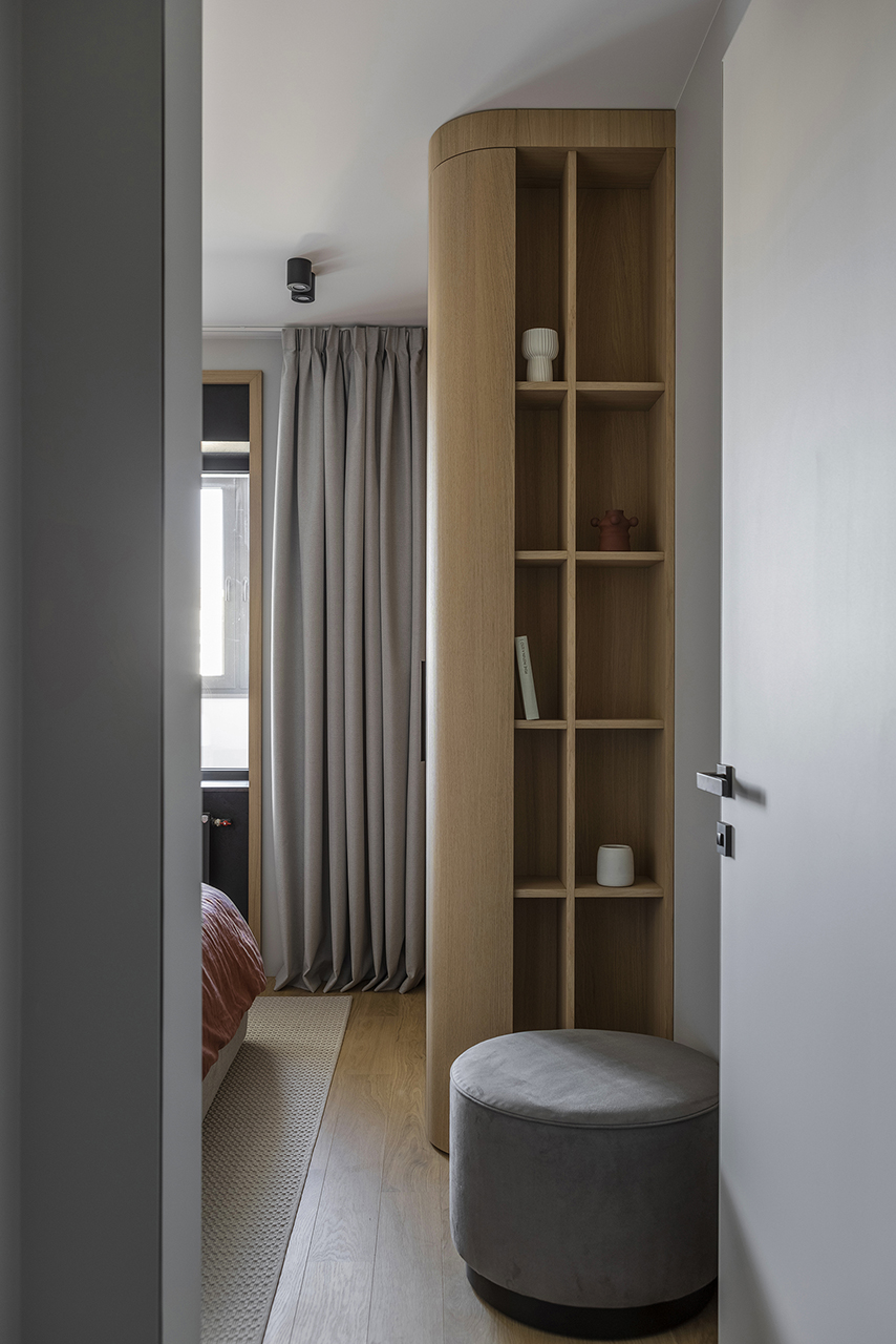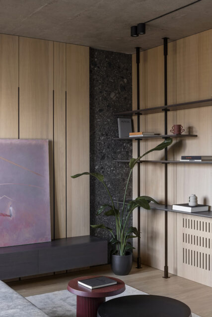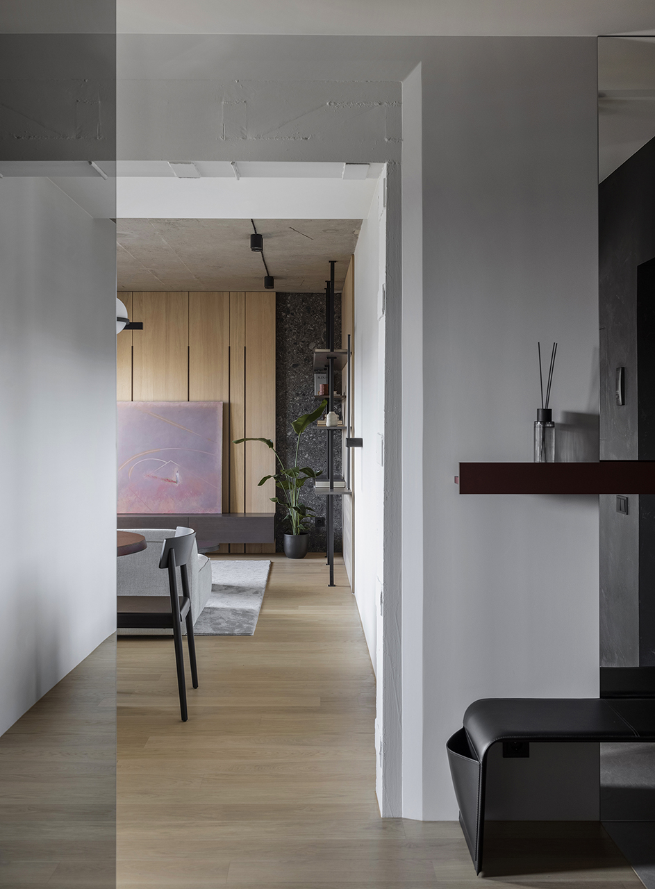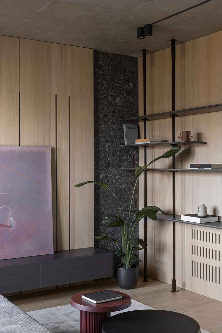 Квартира находится в старом жилом фонде (дом 1986-го года постройки), что создало ряд сложностей в процессе ремонта. Был выполнен большой комплекс демонтажных работ. Демонтированы старая стяжка и штукатурка, заменены окна, балконные рамы, радиаторы отопления и другие коммуникации. Высота потолков в квартире довольно небольшая и составляет около 2,6 метра. В зоне гостиной было принято решение расчистить существующий бетонный потолок. Для визуального увеличения высоты пространства мы использовали в интерьере большое количество вертикальных линий. Также, чтобы визуально сделать окна выше, мы решили обрамить их деревянными порталами большей высоты, чем сами окна. Внутренние части порталов (над и под окнами) задекорировали штукатуркой черного цвета, что визуально сделало окна выше и наряднее.