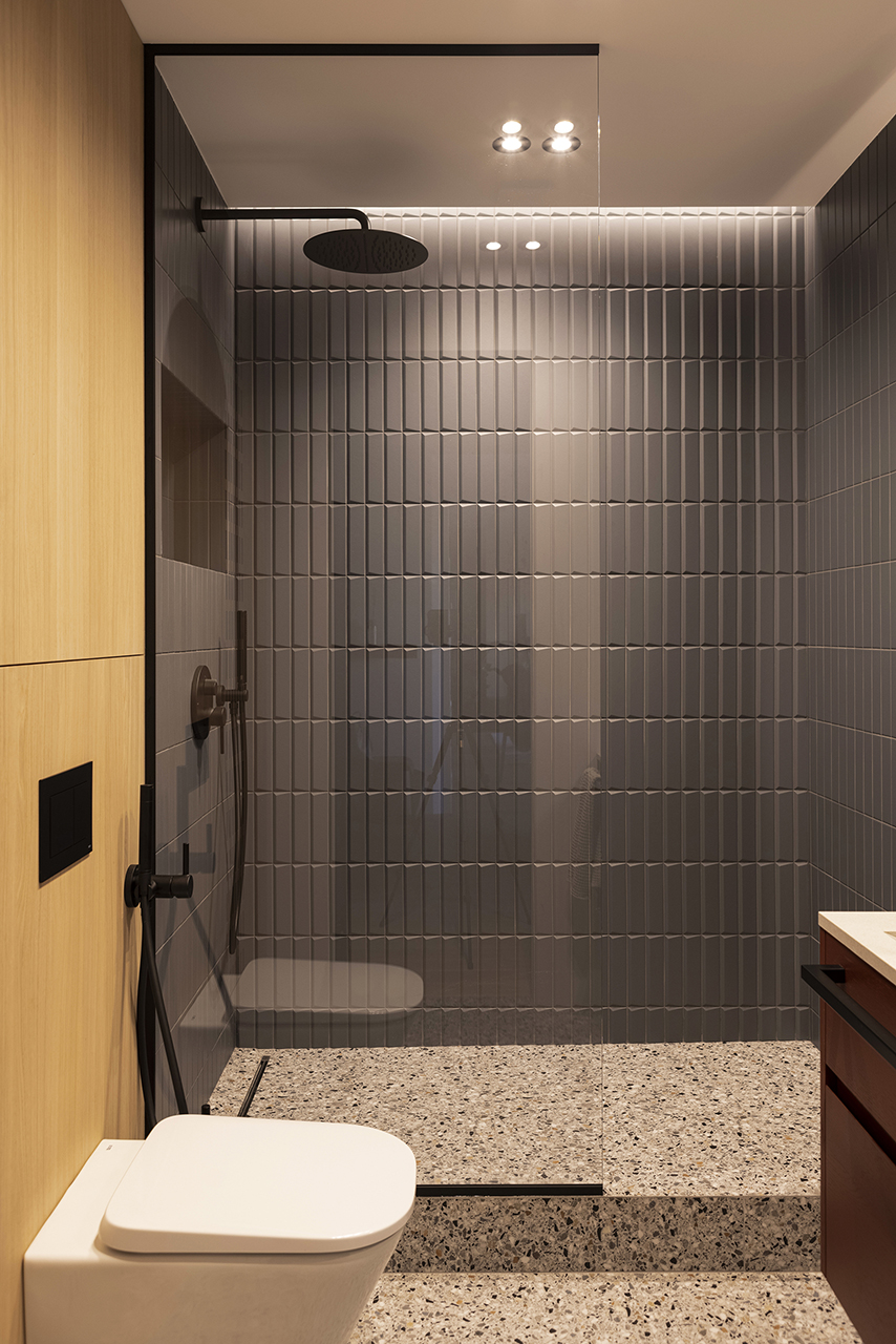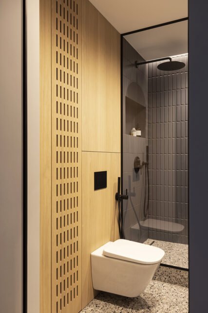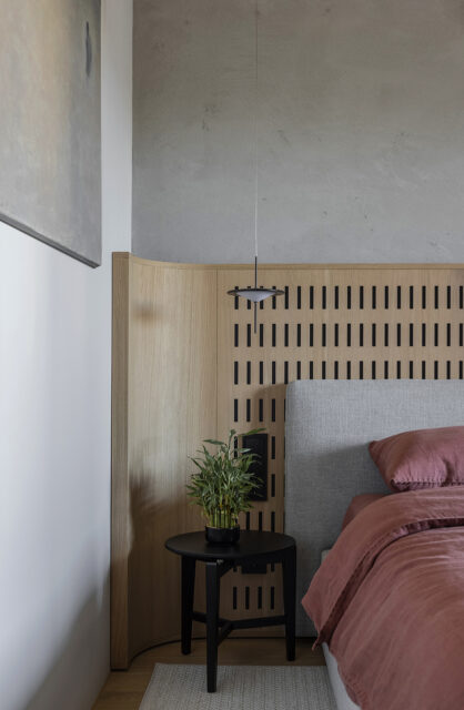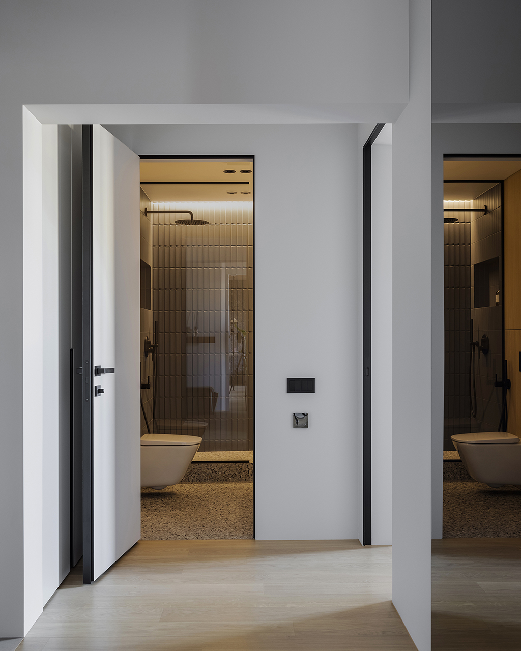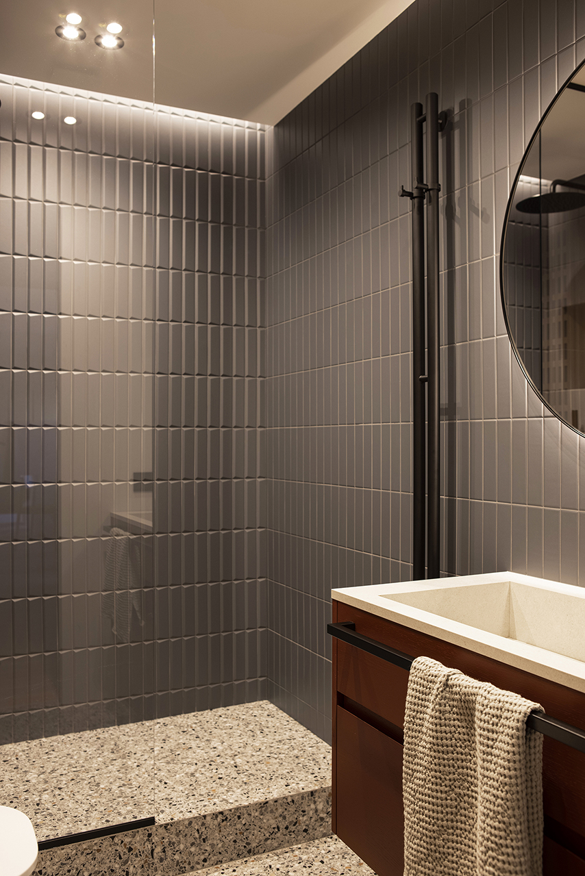 Квартира находится в старом жилом фонде (дом 1986-го года постройки), что создало ряд сложностей в процессе ремонта. Был выполнен большой комплекс демонтажных работ. Демонтированы старая стяжка и штукатурка, заменены окна, балконные рамы, радиаторы отопления и другие коммуникации. Высота потолков в квартире довольно небольшая и составляет около 2,6 метра. В зоне гостиной было принято решение расчистить существующий бетонный потолок. Для визуального увеличения высоты пространства мы использовали в интерьере большое количество вертикальных линий. Также, чтобы визуально сделать окна выше, мы решили обрамить их деревянными порталами большей высоты, чем сами окна. Внутренние части порталов (над и под окнами) задекорировали штукатуркой черного цвета, что визуально сделало окна выше и наряднее.