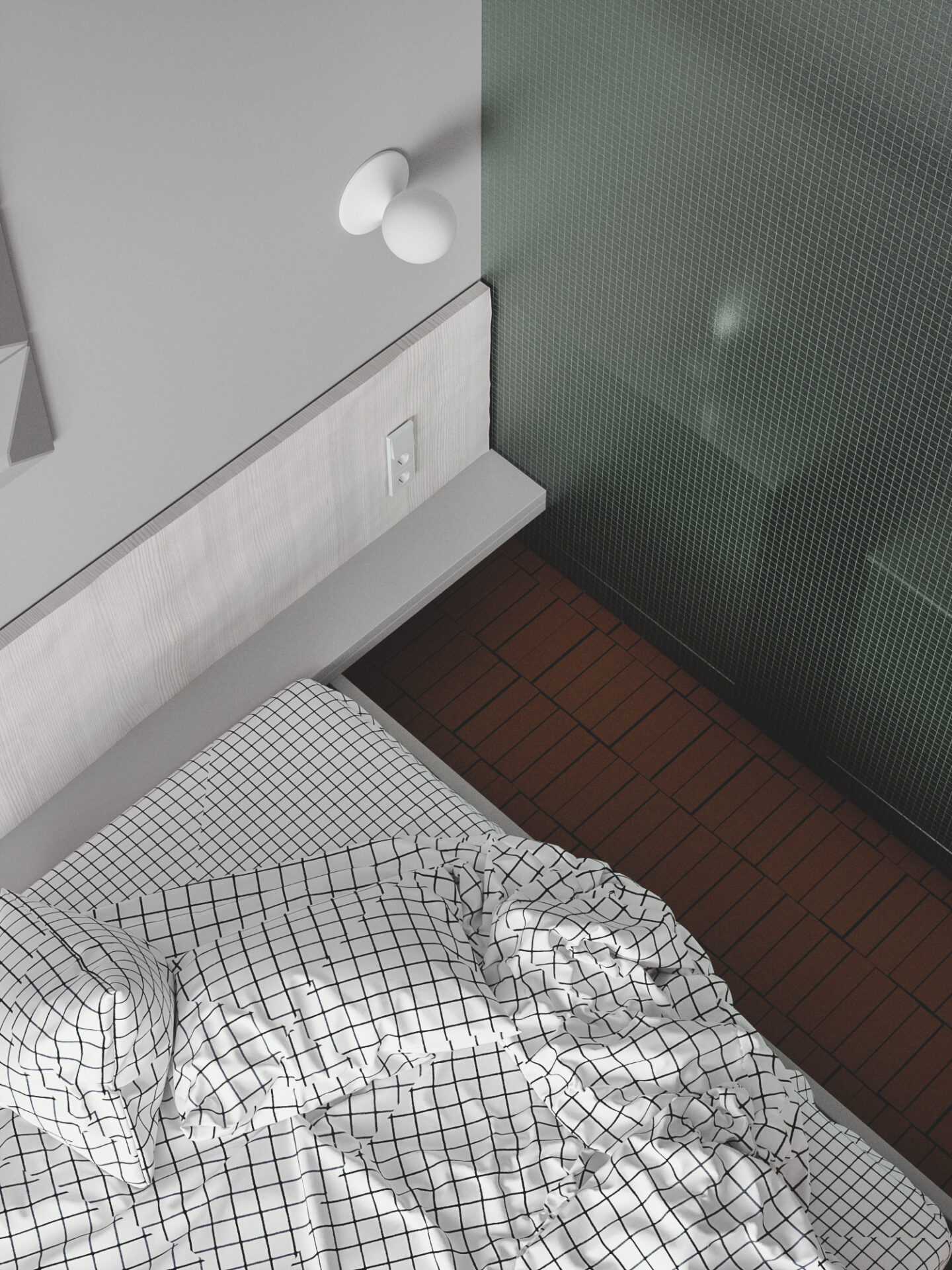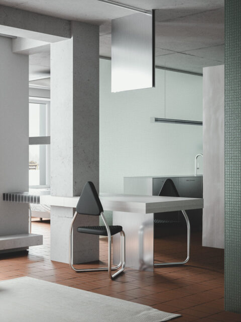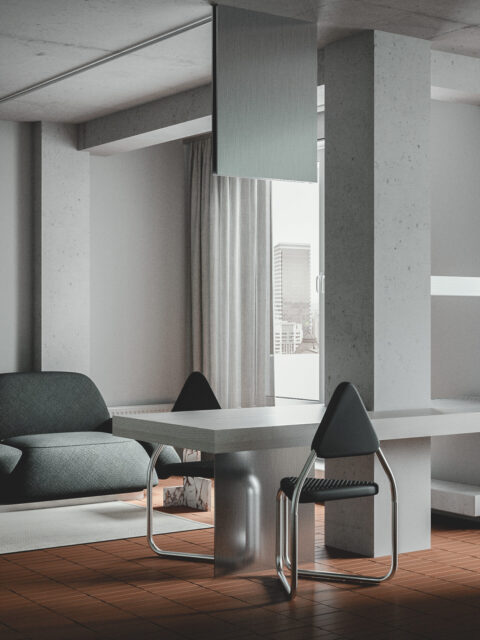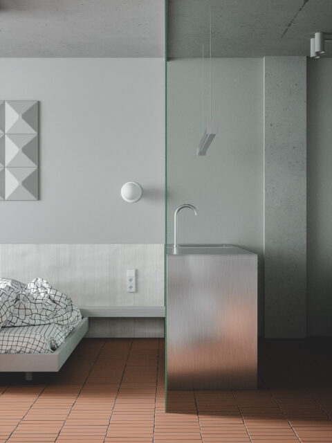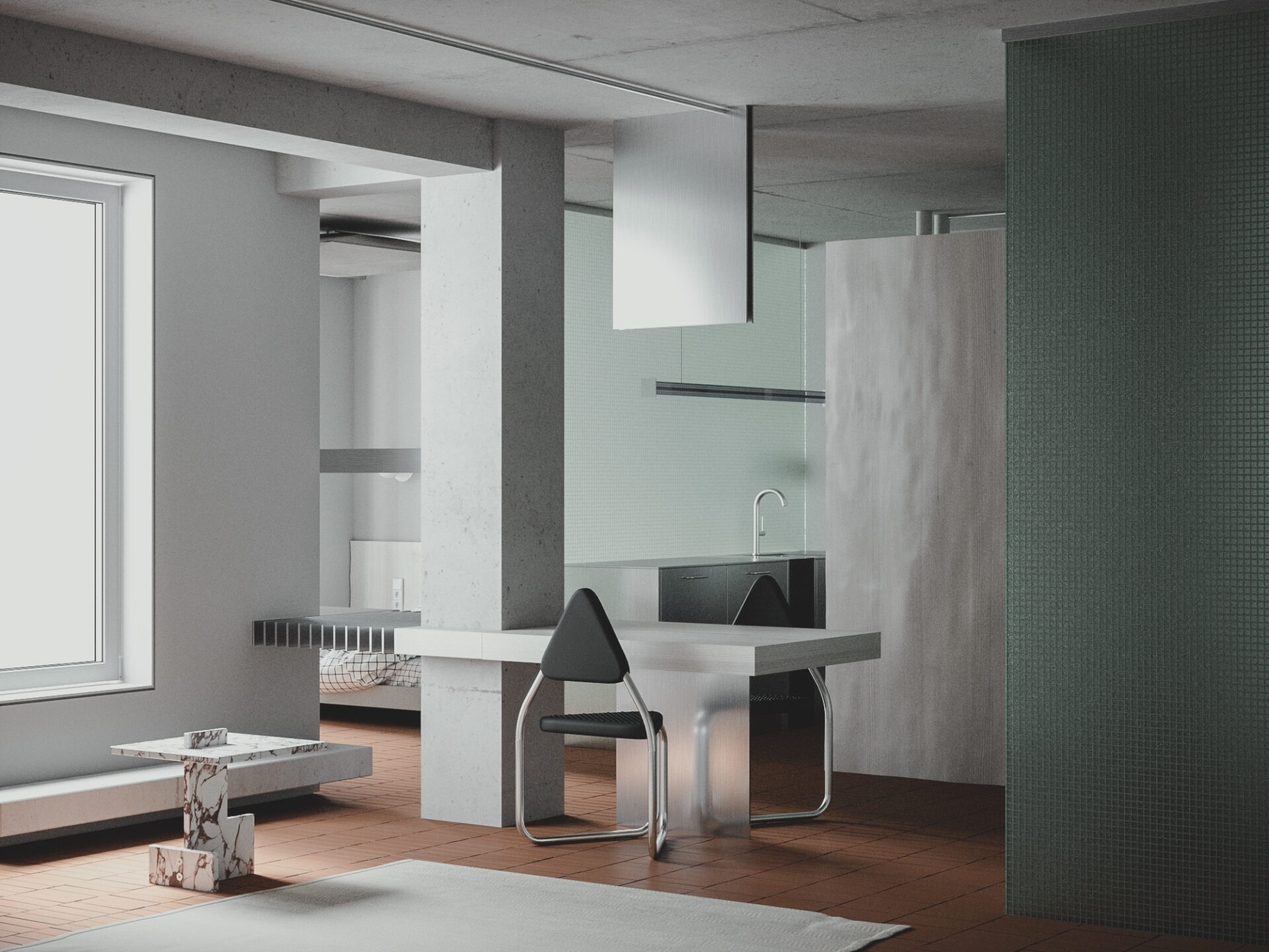 Проект интерьера апартаментов в современном жилом комплексе в Минске. Основной задачей было создать интерьер, который подойдёт как для краткосрочной аренды, так и для проживания заказчицы. В интерьере применены натуральные материалы и уникальные решения и предметы интерьера, разработанные специально для проекта. Так, на полу уложена недорогая клинкерная плитка беларуского производства. Потолок оставлен бетонным, только лессирован разведенной краской. Похожий прием был использован на стенах — штукатурка ротбанд оставлена в своем естественном виде и только подвергнется лессировке. Особенностью планировки является перенос спальни к кухне, а так же полное отсутствие дверей, даже в санузел. Так же в проекте не использовались глухие перегородки, все помещения разделены перегородками из армированного стекла или мебельными конструкциями. Основной род занятий заказчицы металлообработка, поэтому в интерьере использовано большое количество авторских изделий из нержавеющей стали. Проект находится в активной стадии реализации.