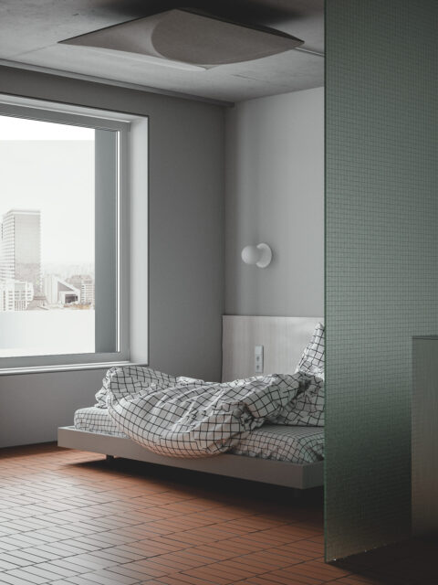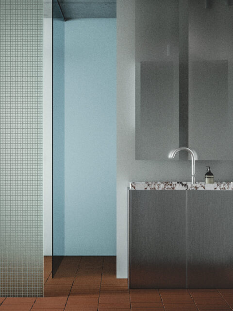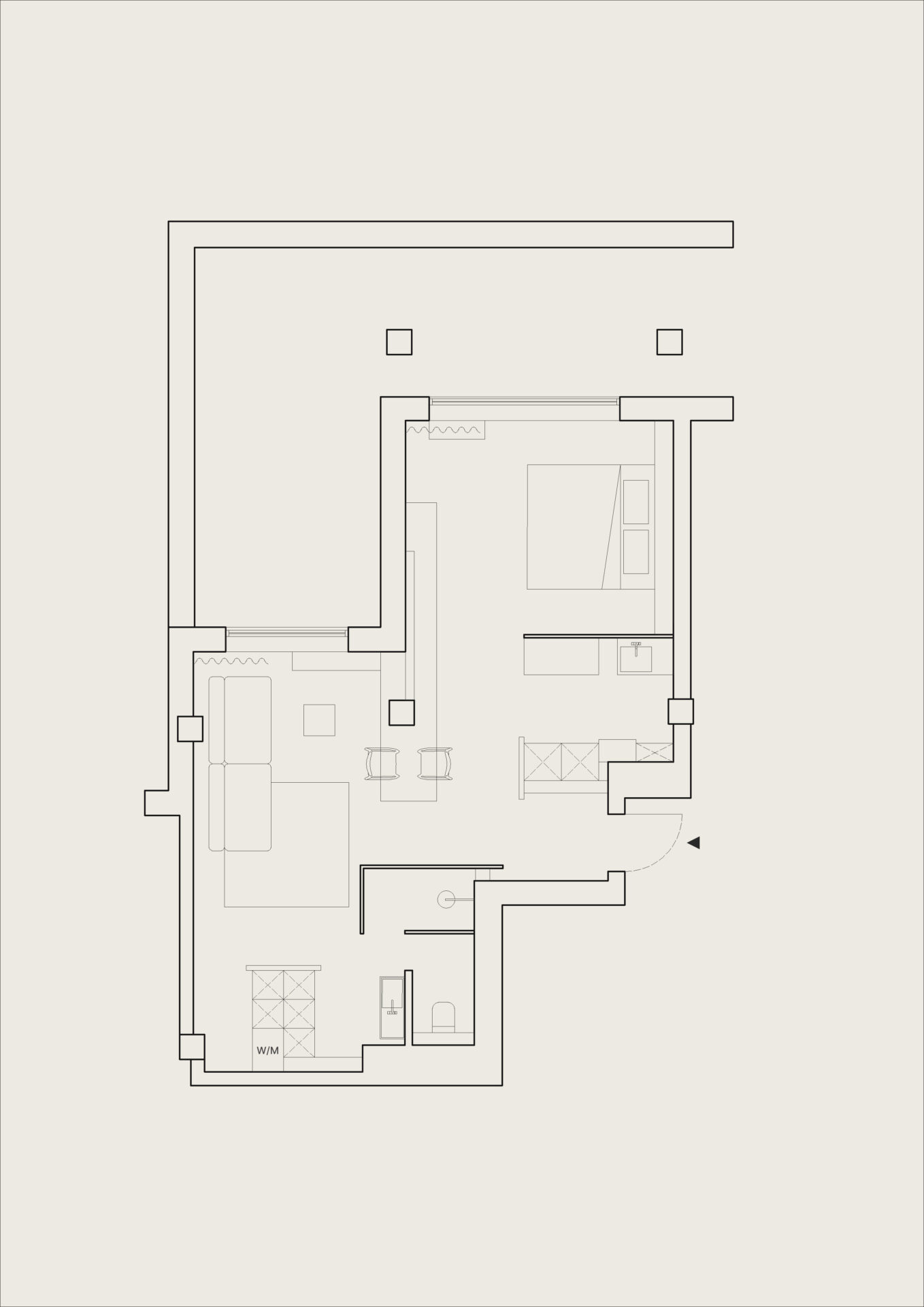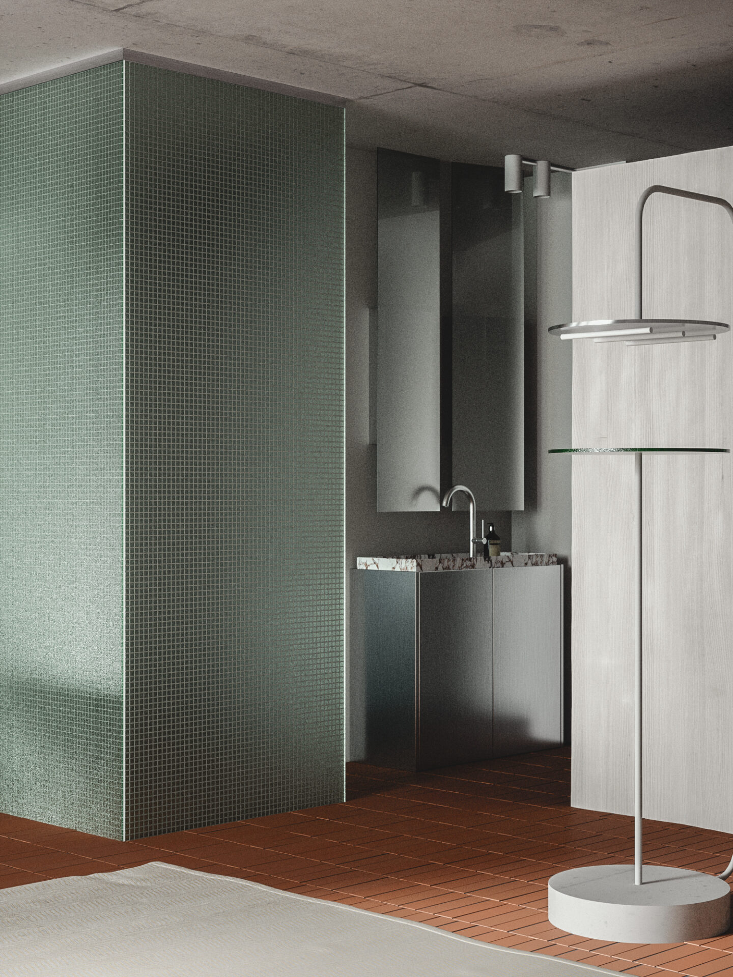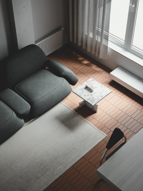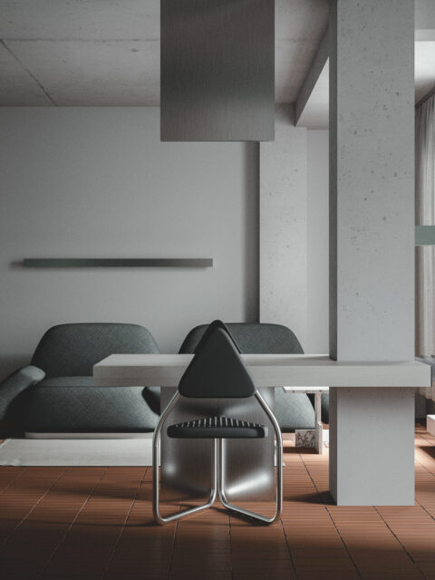 Проект интерьера апартаментов в современном жилом комплексе в Минске. Основной задачей было создать интерьер, который подойдёт как для краткосрочной аренды, так и для проживания заказчицы. В интерьере применены натуральные материалы и уникальные решения и предметы интерьера, разработанные специально для проекта. Так, на полу уложена недорогая клинкерная плитка беларуского производства. Потолок оставлен бетонным, только лессирован разведенной краской. Похожий прием был использован на стенах — штукатурка ротбанд оставлена в своем естественном виде и только подвергнется лессировке. Особенностью планировки является перенос спальни к кухне, а так же полное отсутствие дверей, даже в санузел. Так же в проекте не использовались глухие перегородки, все помещения разделены перегородками из армированного стекла или мебельными конструкциями. Основной род занятий заказчицы металлообработка, поэтому в интерьере использовано большое количество авторских изделий из нержавеющей стали. Проект находится в активной стадии реализации.