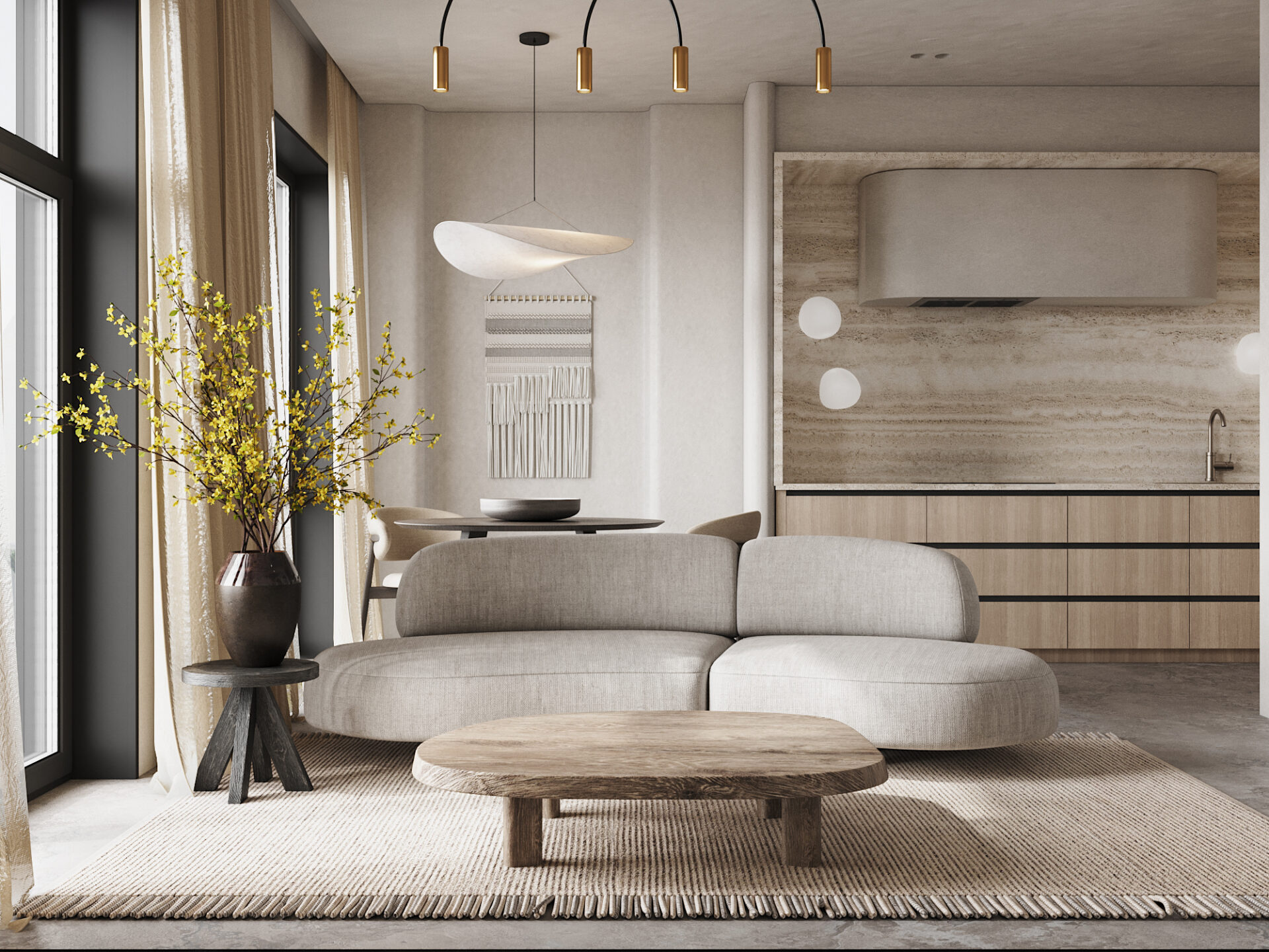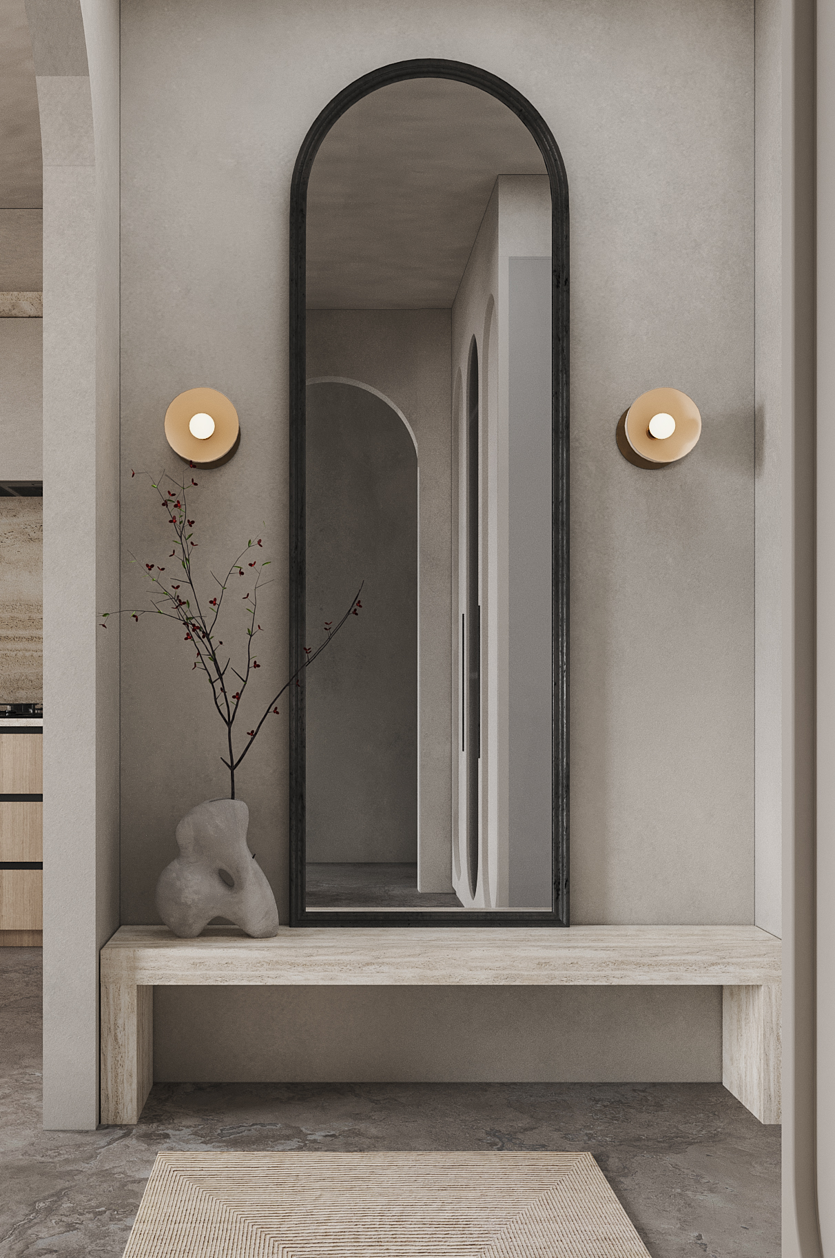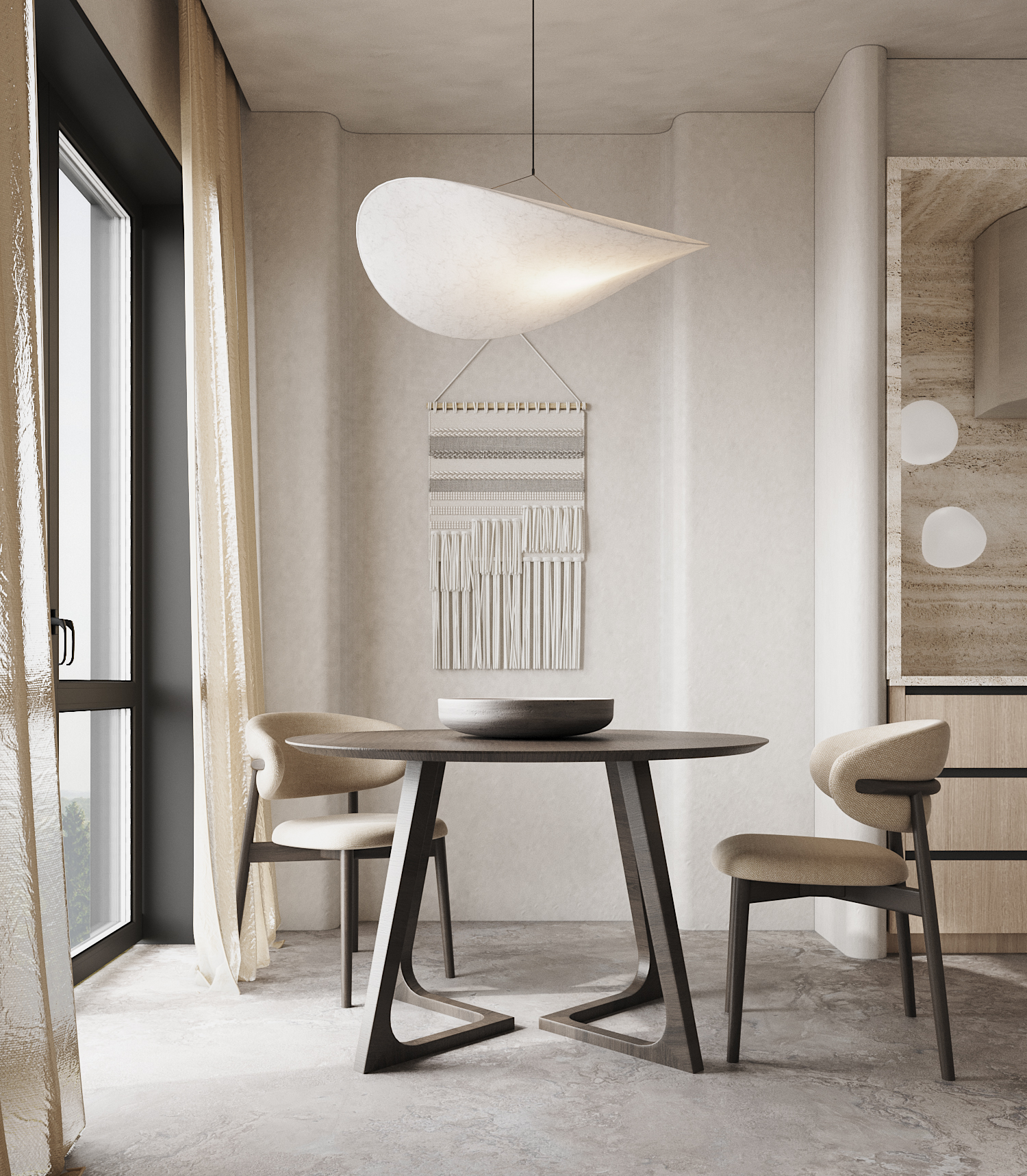 Цветовая гамма всей квартиры спокойная, теплая, обволакивающая. Большое внимание уделено деталям в интерьере, натуральным материалам, сочетанию различных текстур и фактур, тактильности. Использованы круглые формы, арочные проемы и закругленные углы, которые на подсознательном уровне ассоциируются с мягкостью, гибкостью, гармонией. В округлостях нет конфликта, одни линии плавно перетекают в другие, а значит и на психологическом уровне все ровно и спокойно.