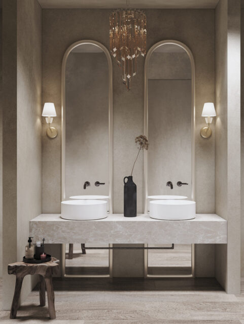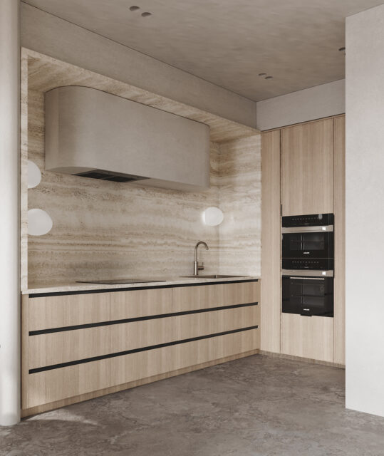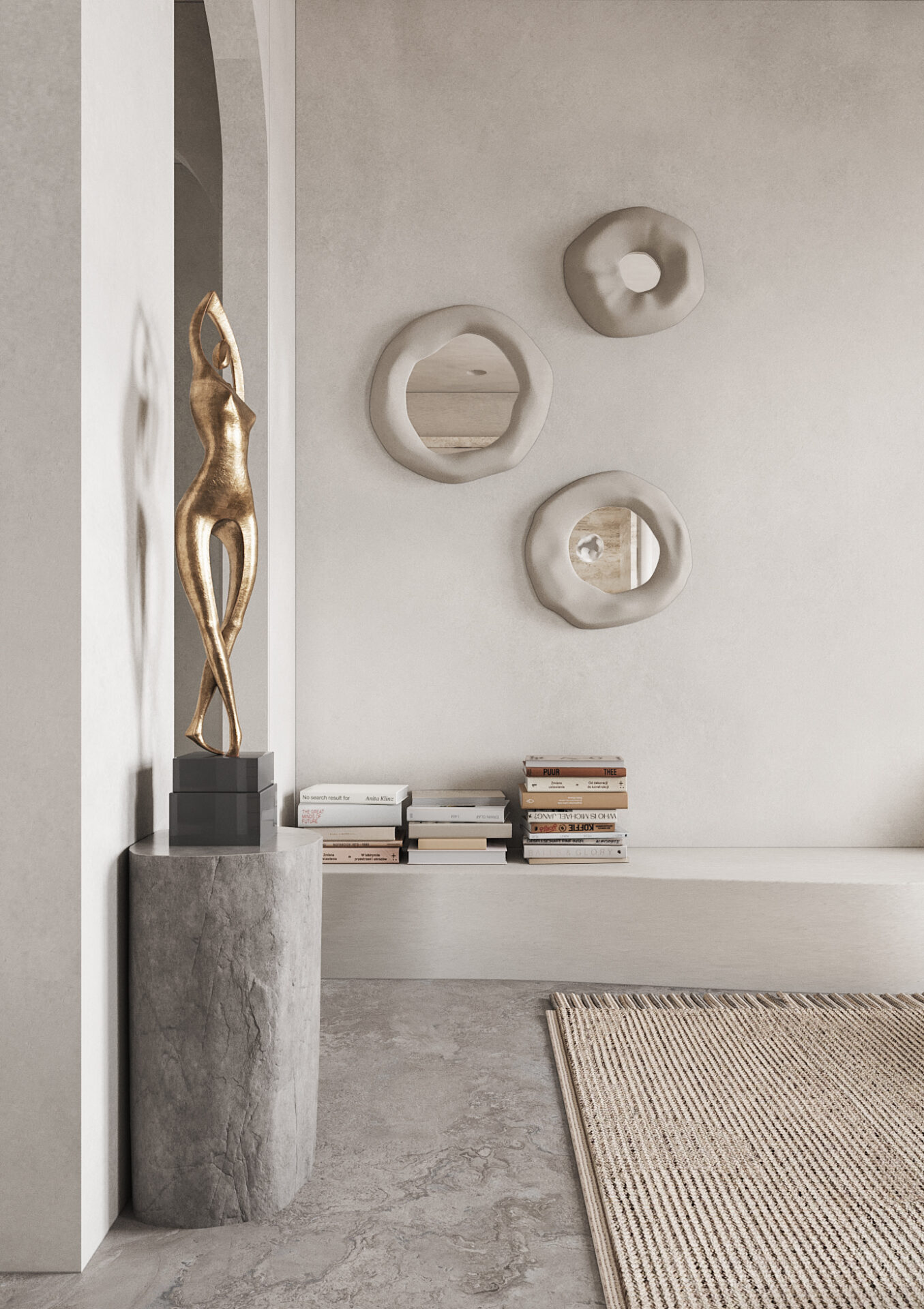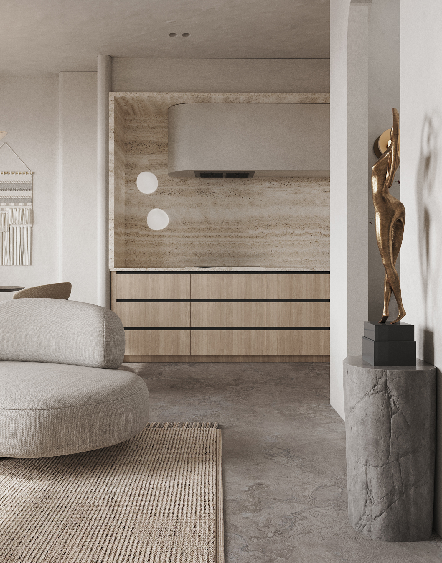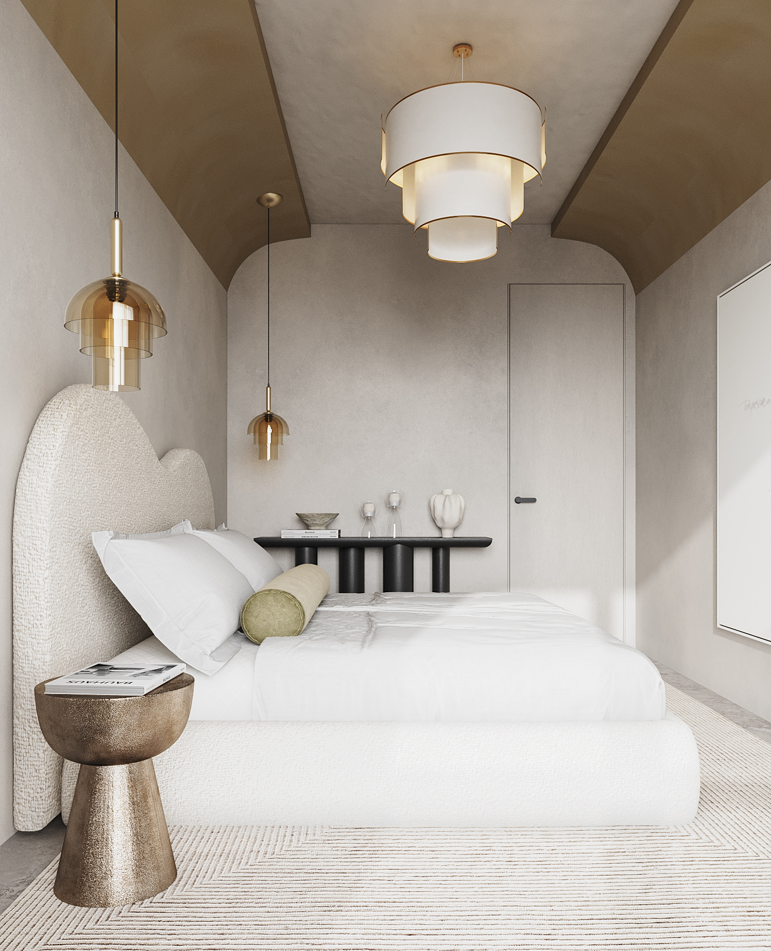 Цветовая гамма всей квартиры спокойная, теплая, обволакивающая. Большое внимание уделено деталям в интерьере, натуральным материалам, сочетанию различных текстур и фактур, тактильности. Использованы круглые формы, арочные проемы и закругленные углы, которые на подсознательном уровне ассоциируются с мягкостью, гибкостью, гармонией. В округлостях нет конфликта, одни линии плавно перетекают в другие, а значит и на психологическом уровне все ровно и спокойно.