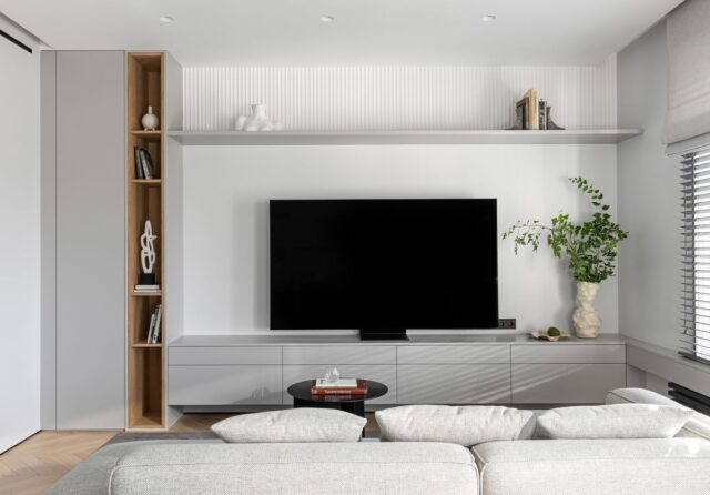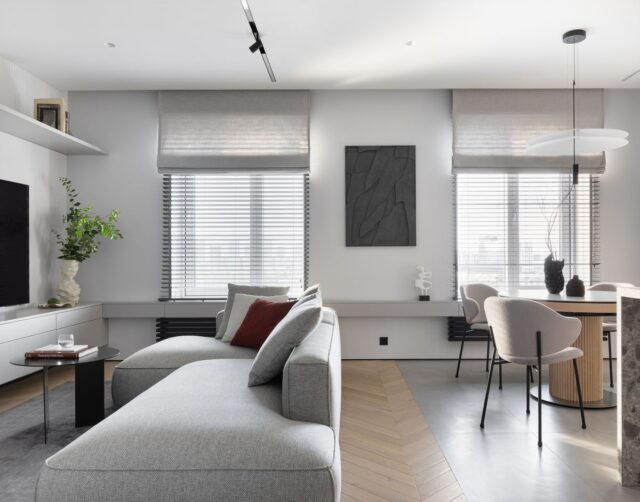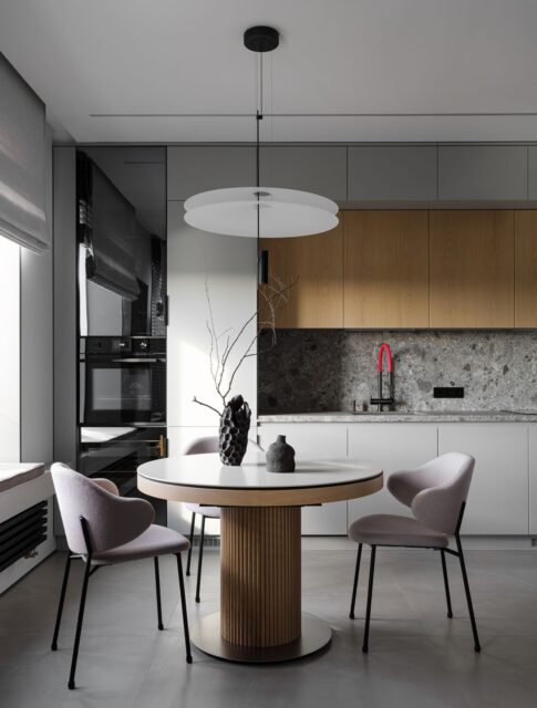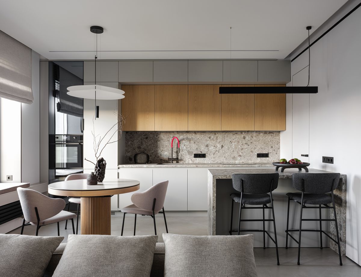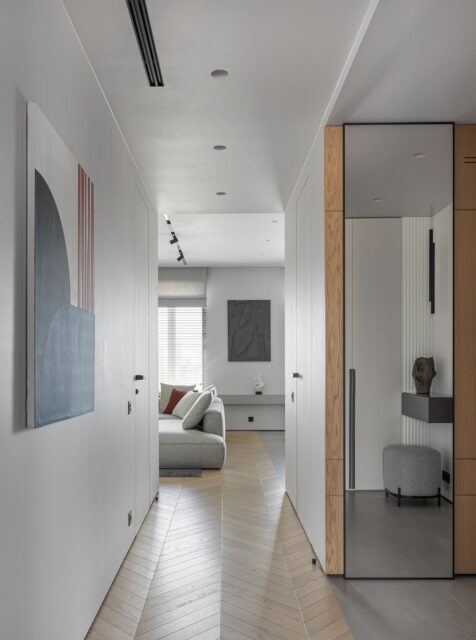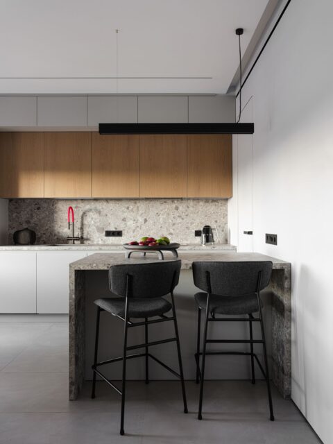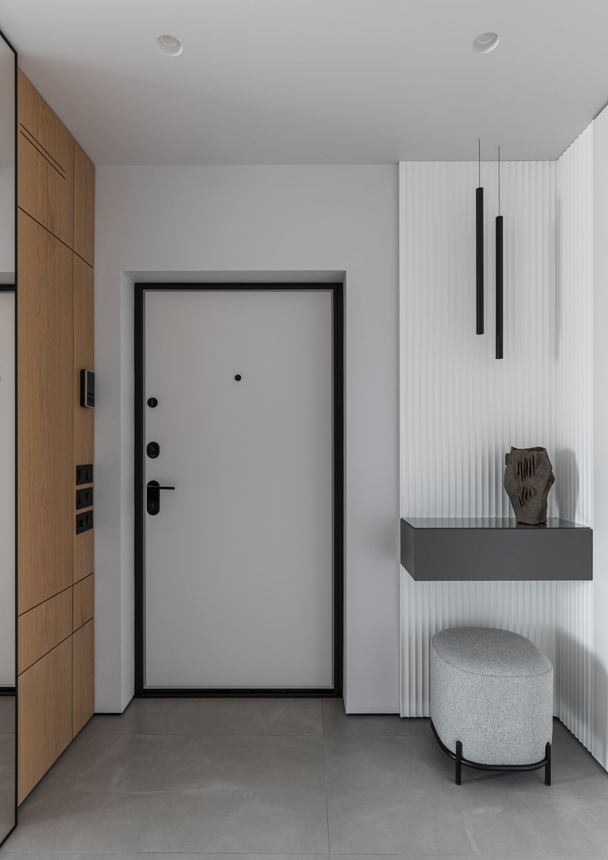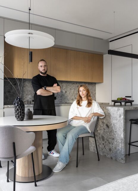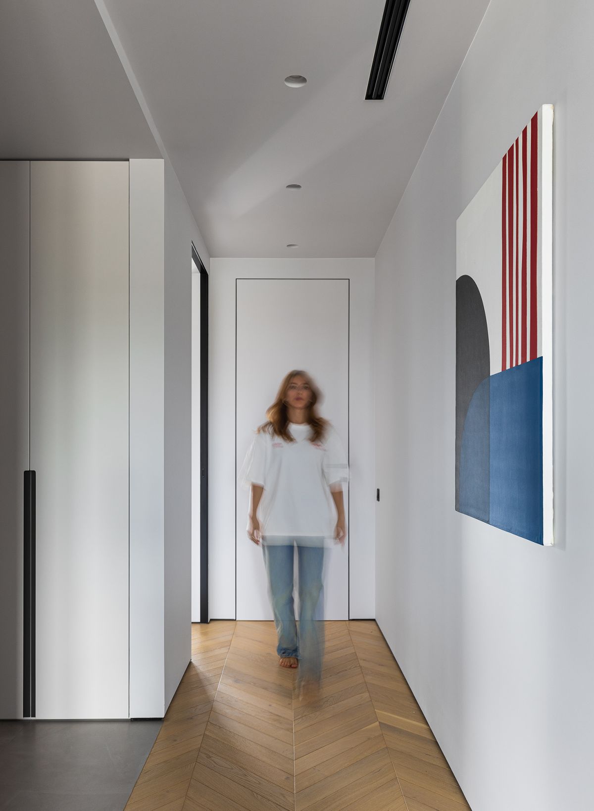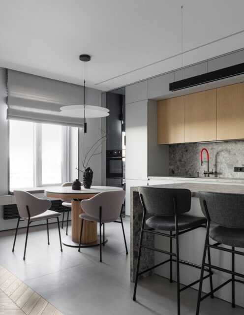 Квартира для молодой пары с ребенком в ЖК Now должна была быть легкой, воздушной, при этом рациональной. Интерьер представляет собой минималистичное пространство с ограниченной палитрой материалов, со сложносочиненными стыковками элементов и поверхностей, а также неочевидными акцентами вроде красного смесителя на кухне.