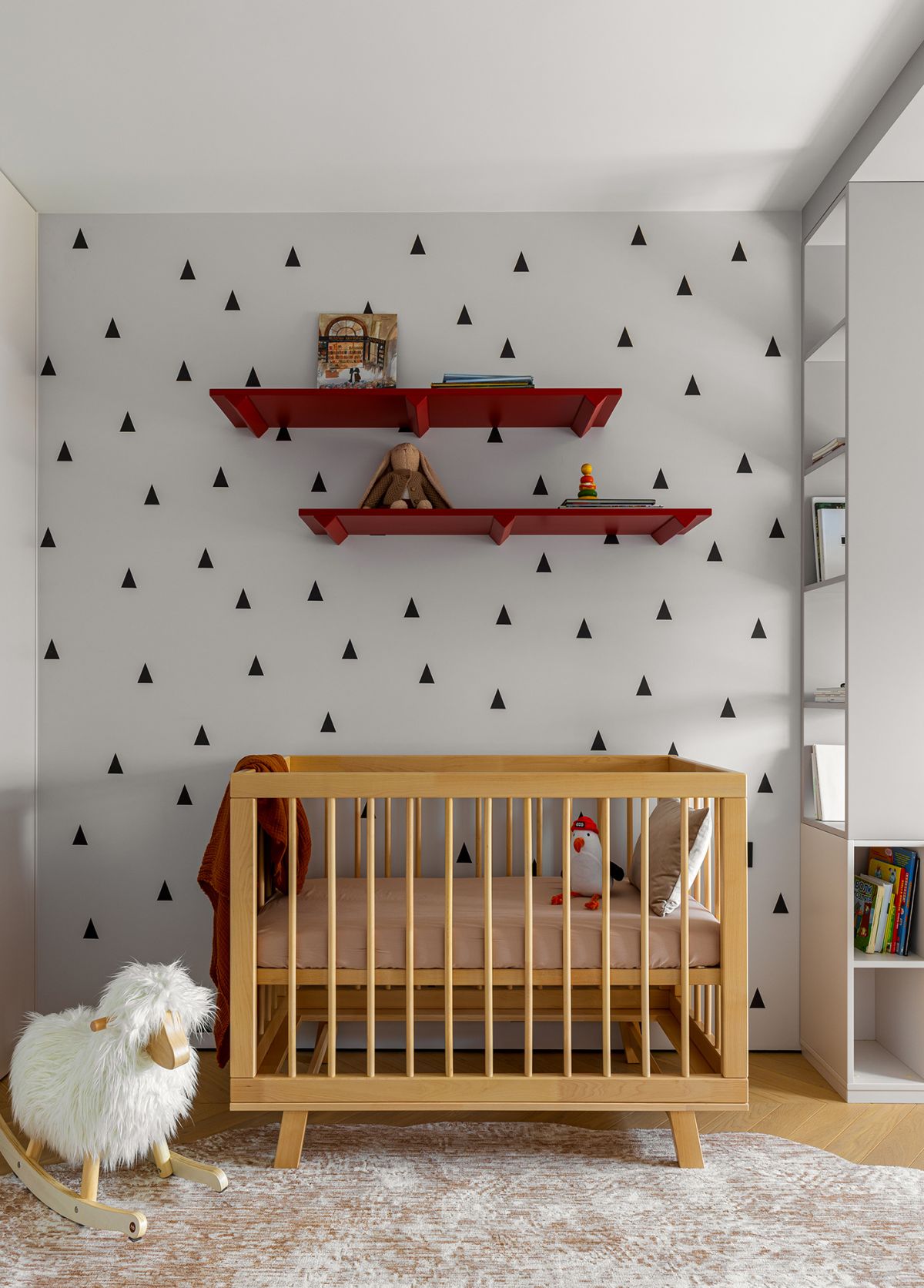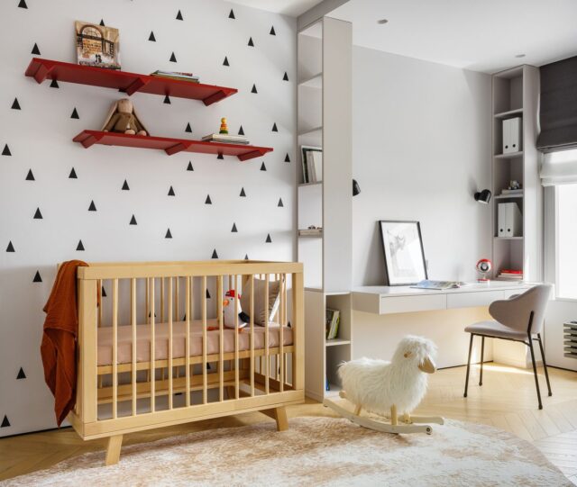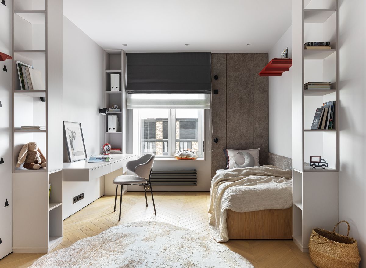 Детская выполнена лаконичной, с небольшими графическими и цветовыми акцентами. Она строго зонирована за счет стеллажей, и рассчитана на возможную реконструкцию в случае появления второго ребенка.