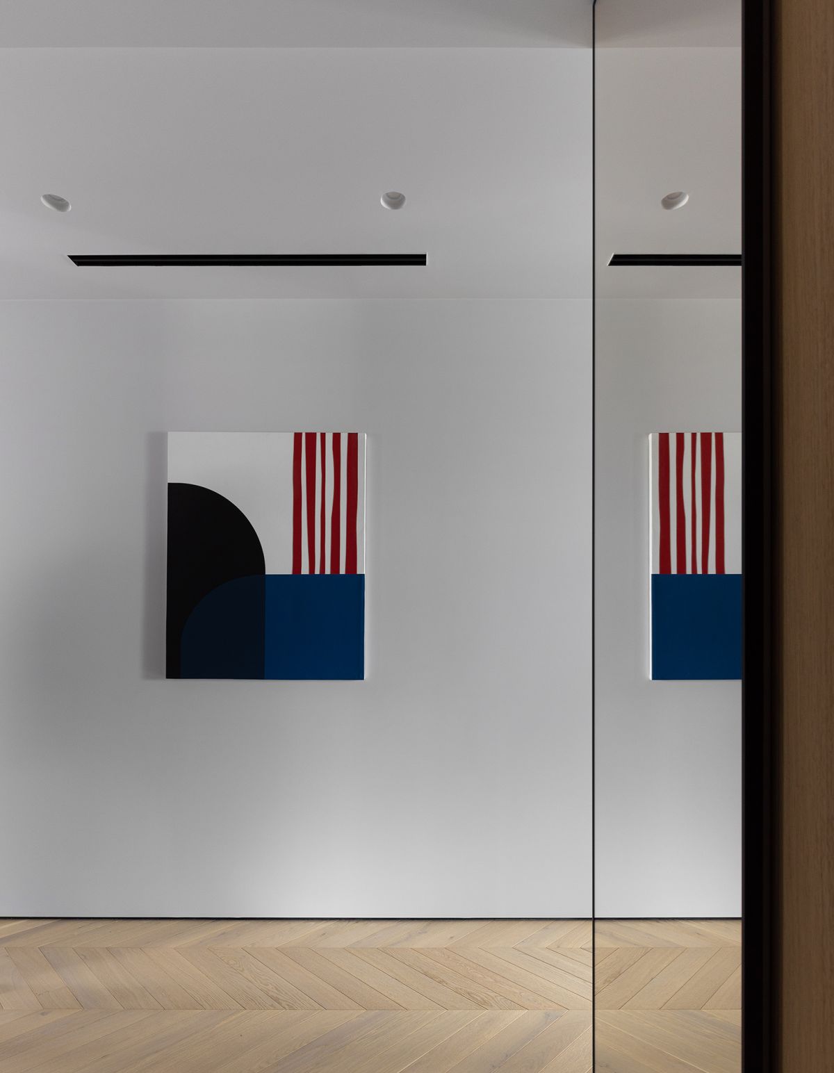 Интерьер спальни можно назвать объемной интерпретацией картины, которую заказчики приобрели в музее Эрарту в Санкт-Петербурге. Они очень хотели разместить ее в интерьере спальни, однако по размеру и внутреннему масштабу картина была мелковата. Чтобы увеличить ее значимость, мы создали на стене композицию из элементов, так или иначе пересекающихся с цветовой гаммой картины, распространив ее таким образом на всю зону изголовья. Палитра материалов логичным образом проявилась и во всей комнате, которая по сути стала пространственной интерпретацией живописной работы.