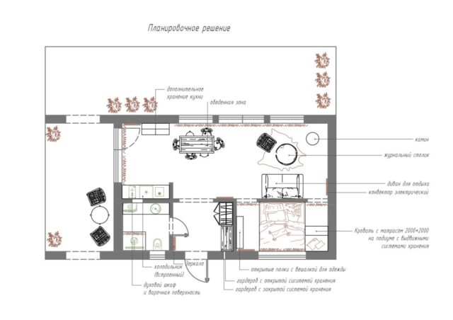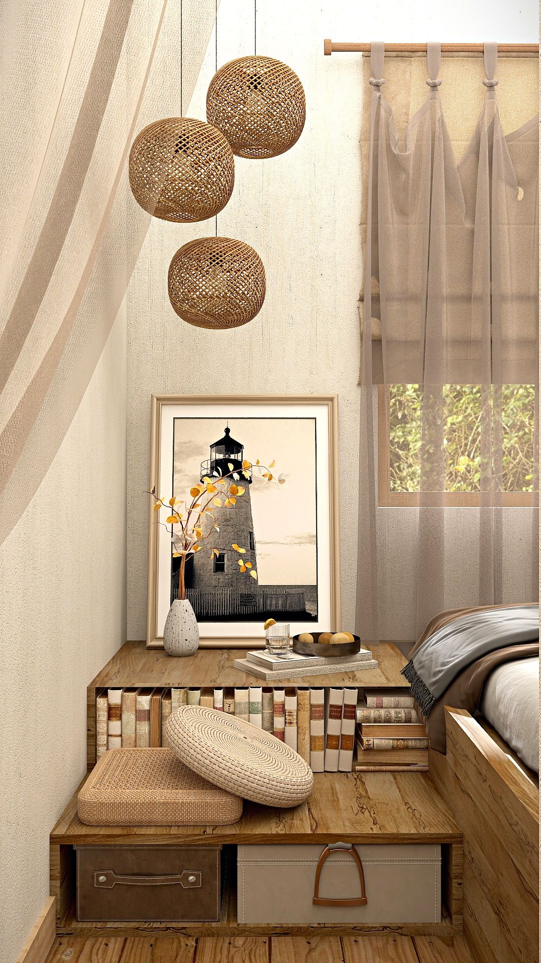 Атмосфера уюта рождается через многослойность простых элементов: шерстяные ковры, грубоватые пледы, мягкие подушки и приглушенную палитру природных оттенков — древесных серо-коричневых, молочно-белых, приглушенно-зеленых. Даже функциональные решения здесь незаметны: бытовые приборы спрятаны за фасадами из дерева, а трансформируемая мебель экономит пространство без ущерба эстетике.