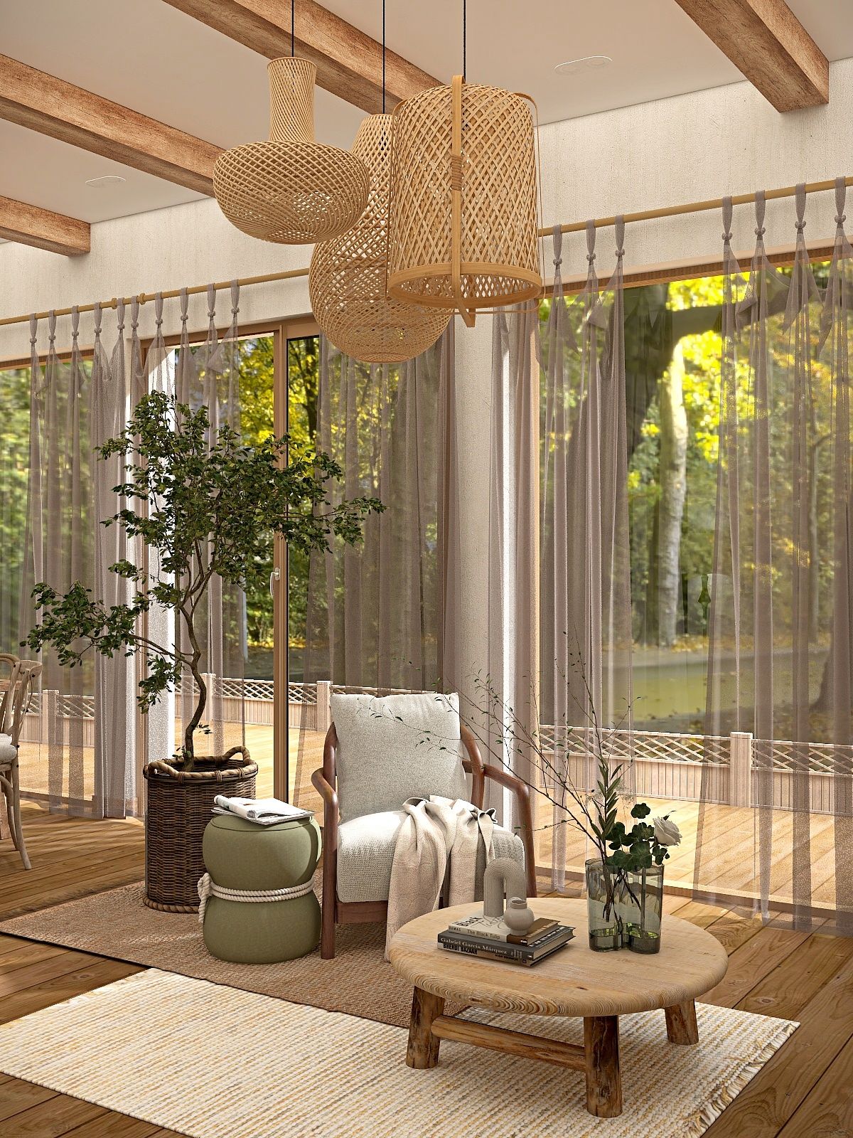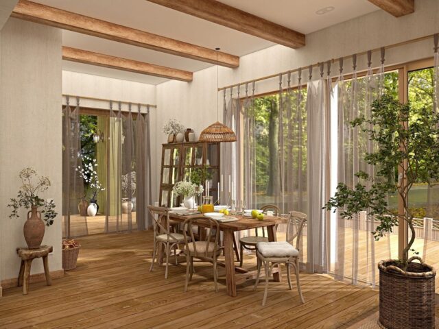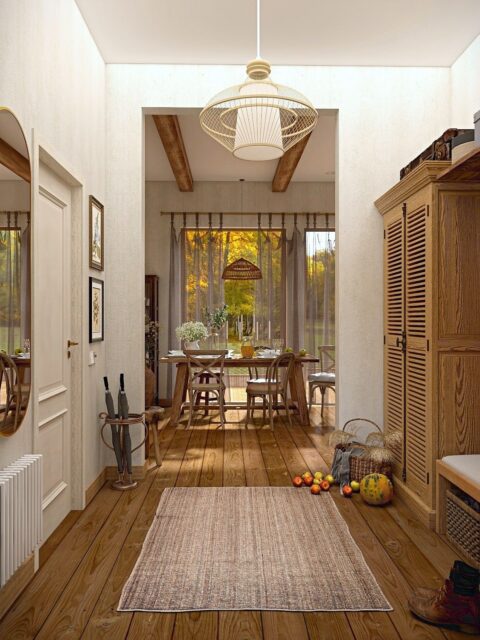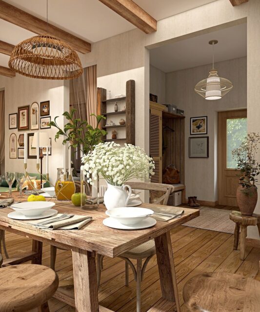 Основу составляют дерево, камень, лён и шерсть — материалы, которые стареют красиво, сохраняя память о времени. Столы из реставрированных дубовых балок, плетеная мебель, льняные шторы и керамика ручной работы подчеркивают связь с ремесленными традициями. Большие окна стирают границу между домом и ландшафтом, наполняя комнаты светом и видами на лес.