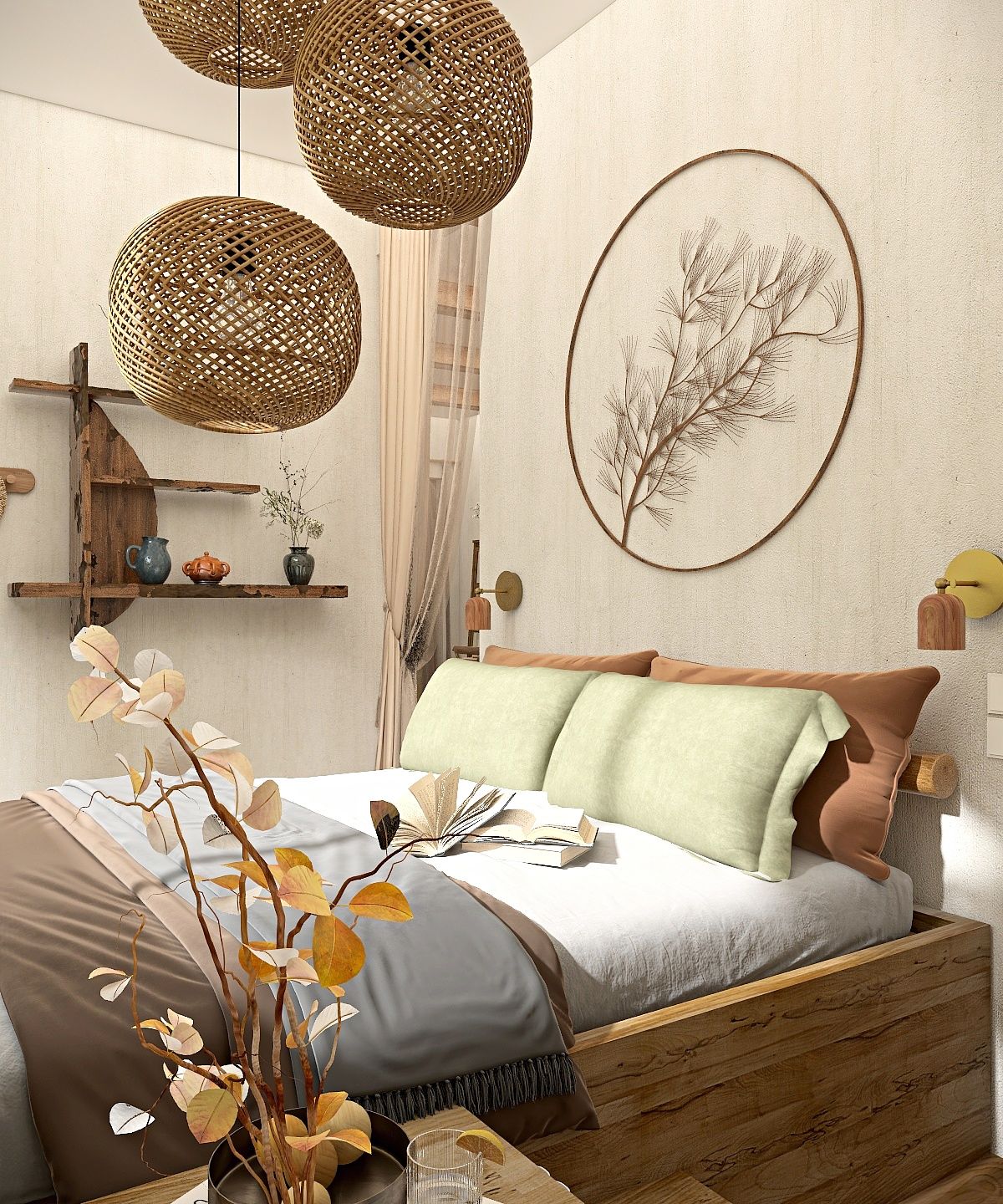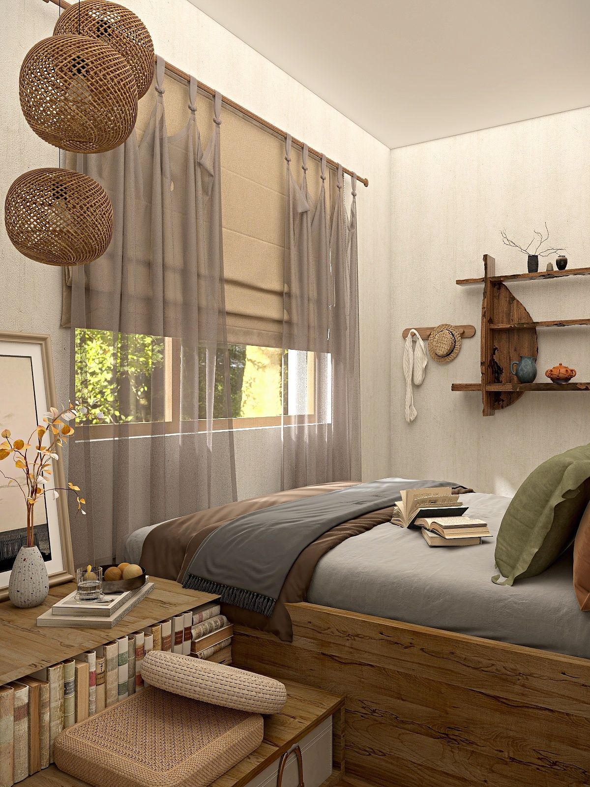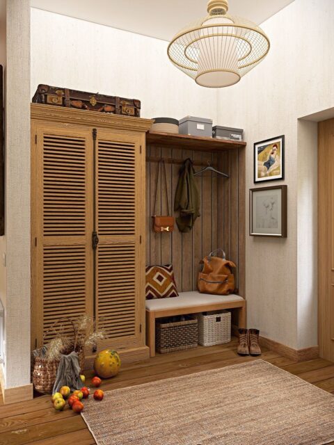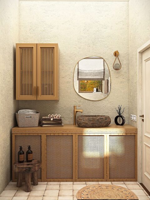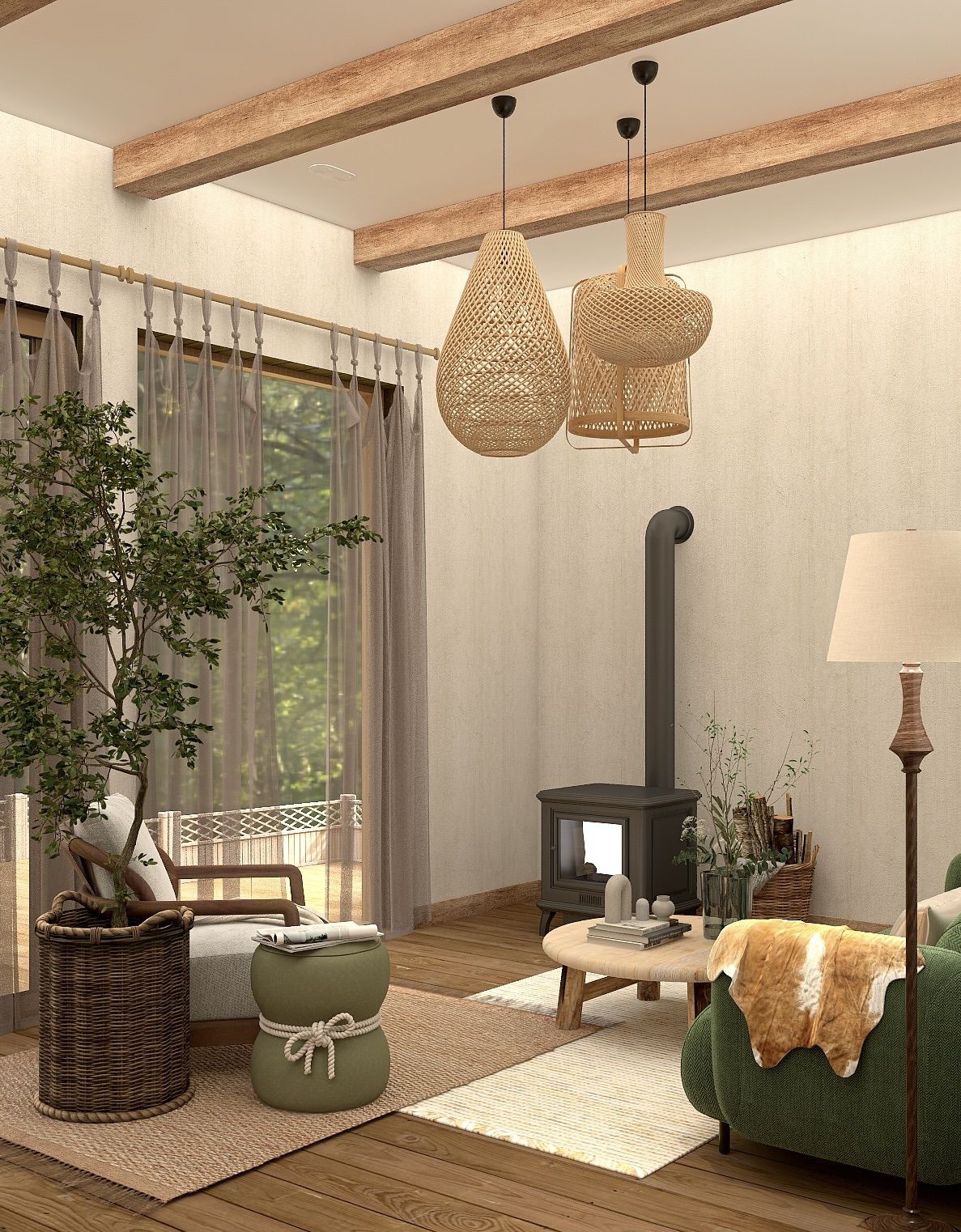 Проект избегает показной сложности. Трещины в дереве, неровности камня и штукатурки не маскируются, а становятся частью истории интерьера. Камин, плетеные корзины и винтажные аксессуары добавляют тепла, а использованные экоматериалы подчеркивают ответственность перед средой.