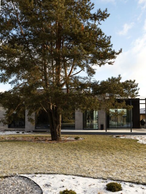 Из-за перепада ландшафта, дом как-бы состоит из двух частей- двух объемов. Нижний этаж- технический, здесь расположена входная группа, зона спа и различные технические помещения, второй этаж – жилая зона дома.