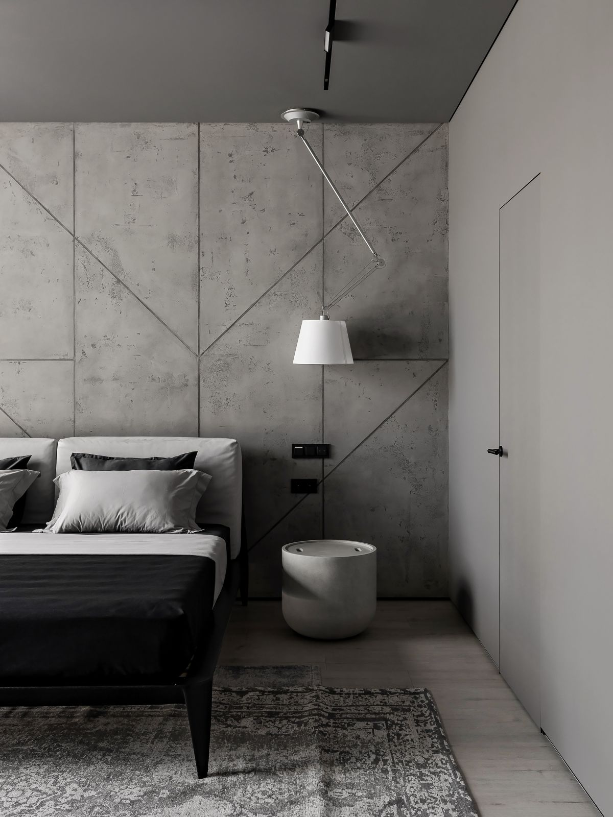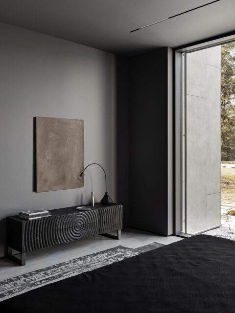 Спальню мы решили сделать более обволакивающей и выбрали невероятный цвет для стен и потолка SHARKSKIN – кожа акулы. Нейтральная цветовая гамма, природные оттенки и материалы, а также огромные панорамные окна с видом на окружающий ландшафт гармонично сложились в единую композицию, создавая атмосферу уюта и спокойствия. Каждый уголок интерьера продуман до мелочей, чтобы обеспечить комфорт и функциональность, а также вдохновить на отдых и расслабление.