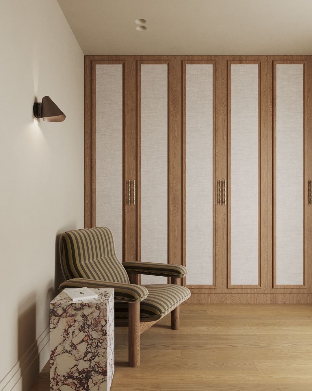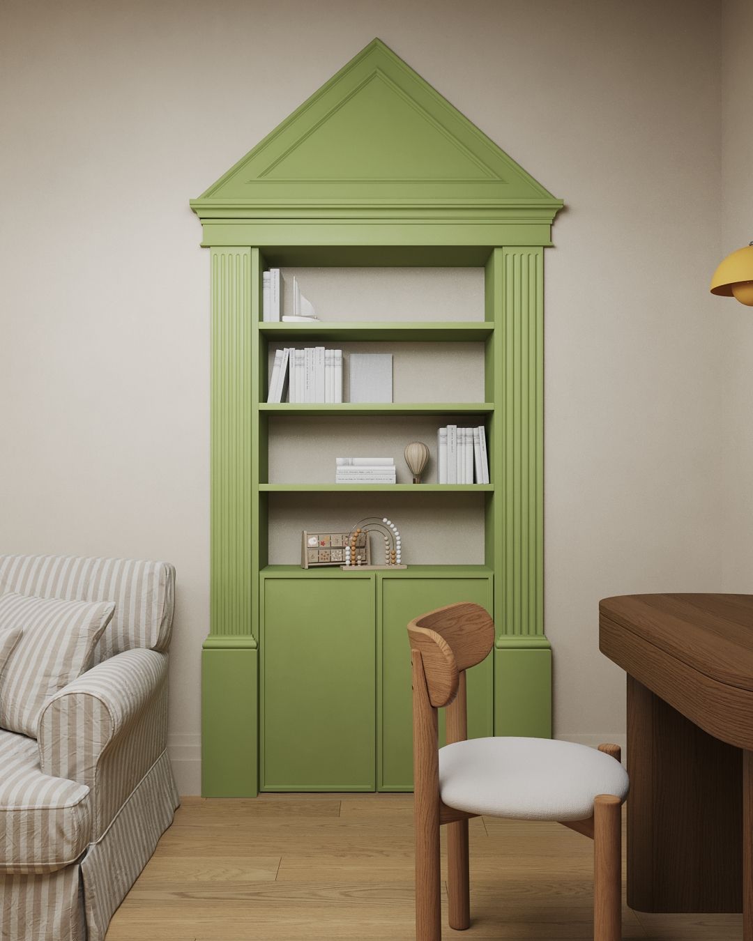 Фасады шкафа в кабинете были дополнены текстилем, что добавило легкости. Этот элемент дизайна не только улучшает визуальное восприятие, но и создает комфортную обстановку для продуктивной работы.