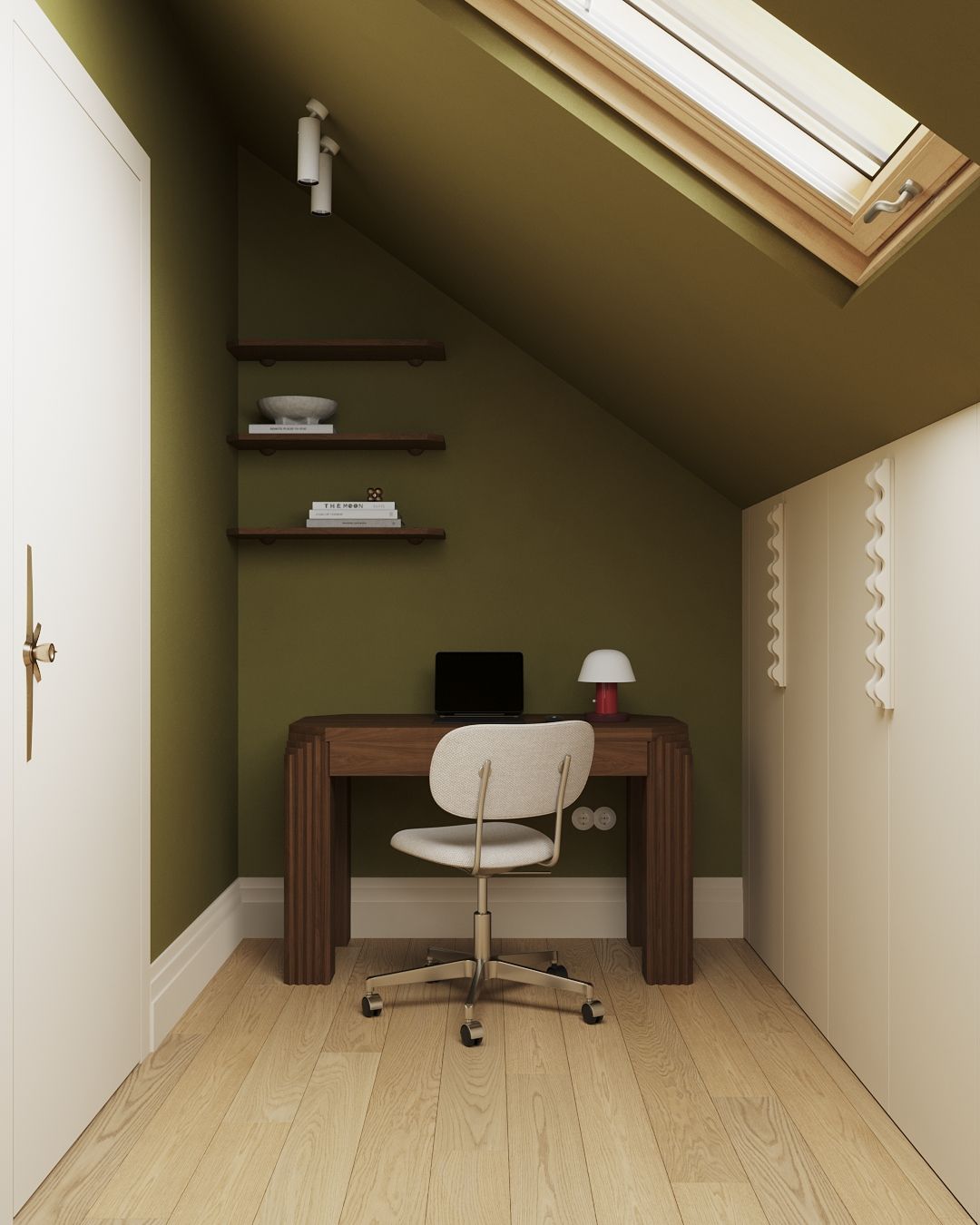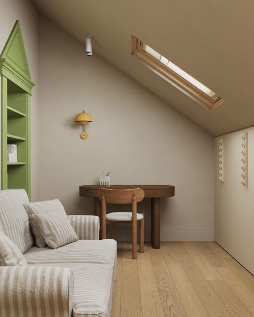 Одним из ключевых изменений в проекте стало разделение открытого пространства на втором этаже, что позволило создать две отдельные жилые зоны: спальню и детскую. Это решение обеспечило необходимую приватность для каждого члена семьи. Спальня родителей была спроектирована с учетом рабочего места для хозяйки квартиры, что позволяет эффективно совмещать работу и отдых.