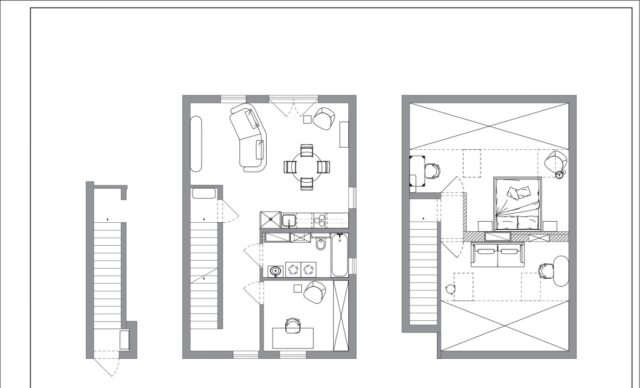 На первом этаже расположены кухня-гостиная и кабинет. Открытая планировка кухни и гостиной создает атмосферу уюта, что идеально подходит для семейных встреч и общения. Винтажная мебель, использованная в проекте, придаёт уникальности интерьеру.