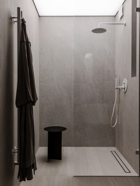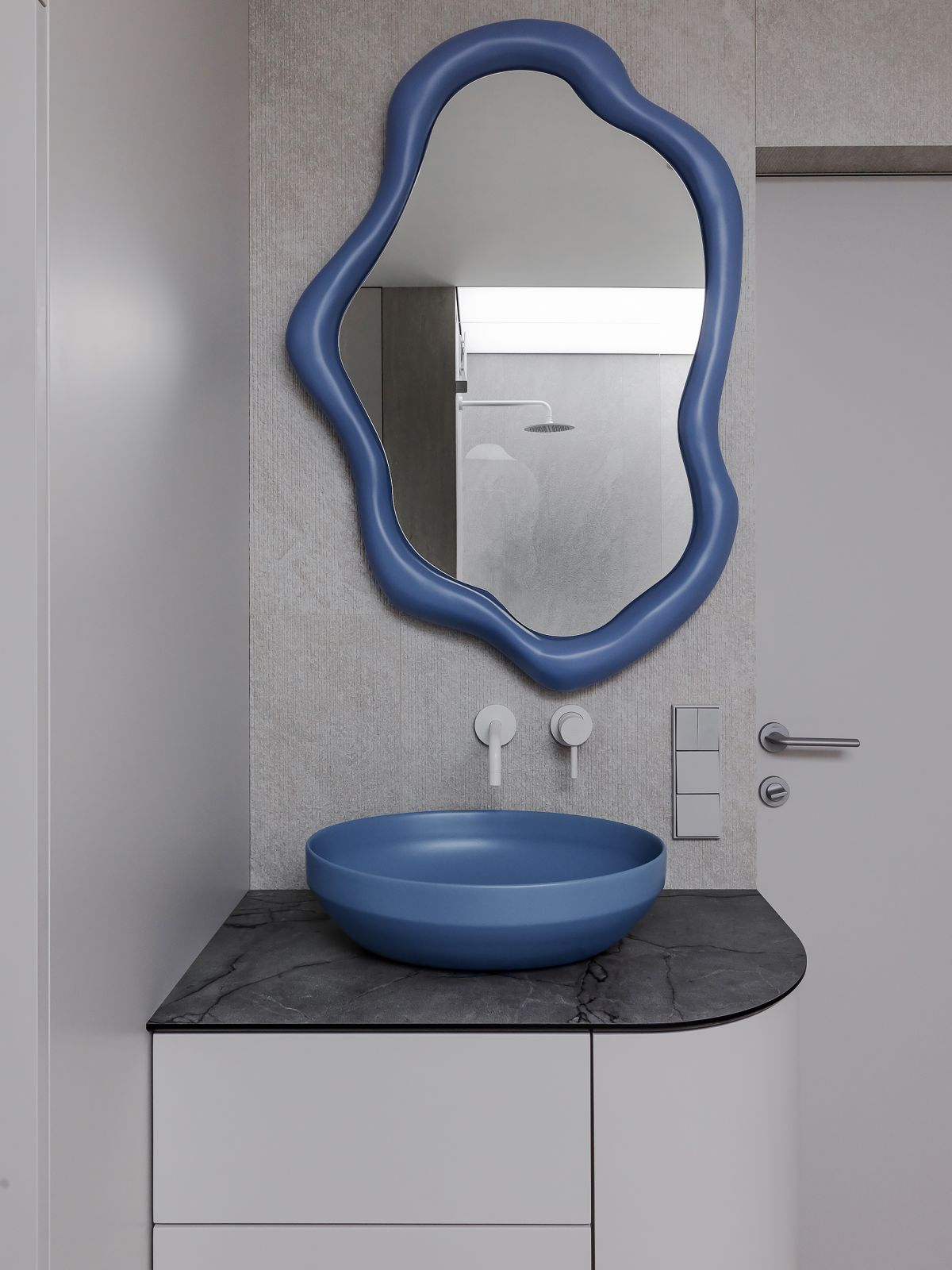 В санузле у нас использовано комбо из фактурной и гладкой итальянской плитки в холодных серых тонах. Главными акцентами стали цветная сантехника и зеркало ассиметричной формы, которое продолжает отсылки к стилю Мемфис.