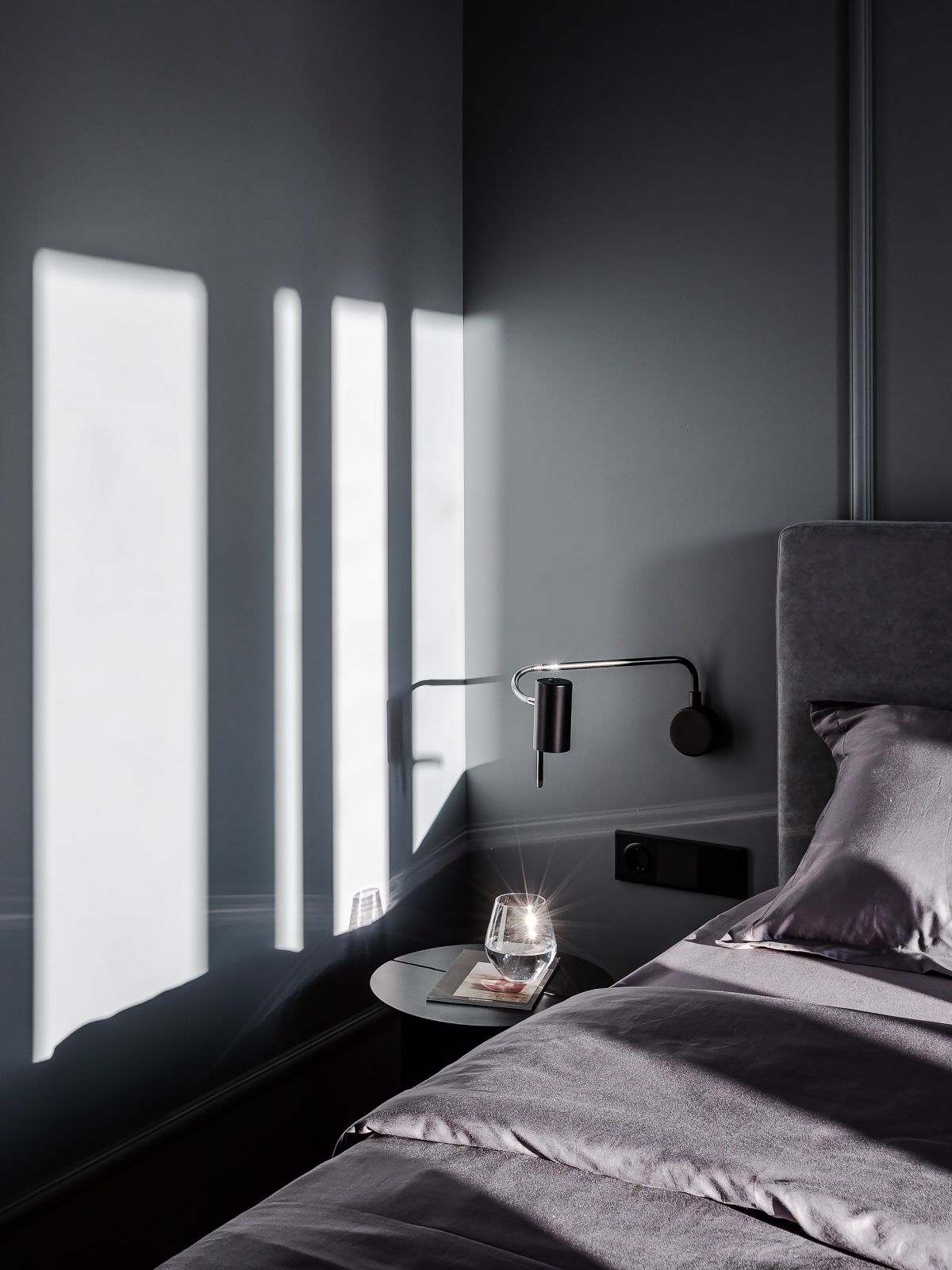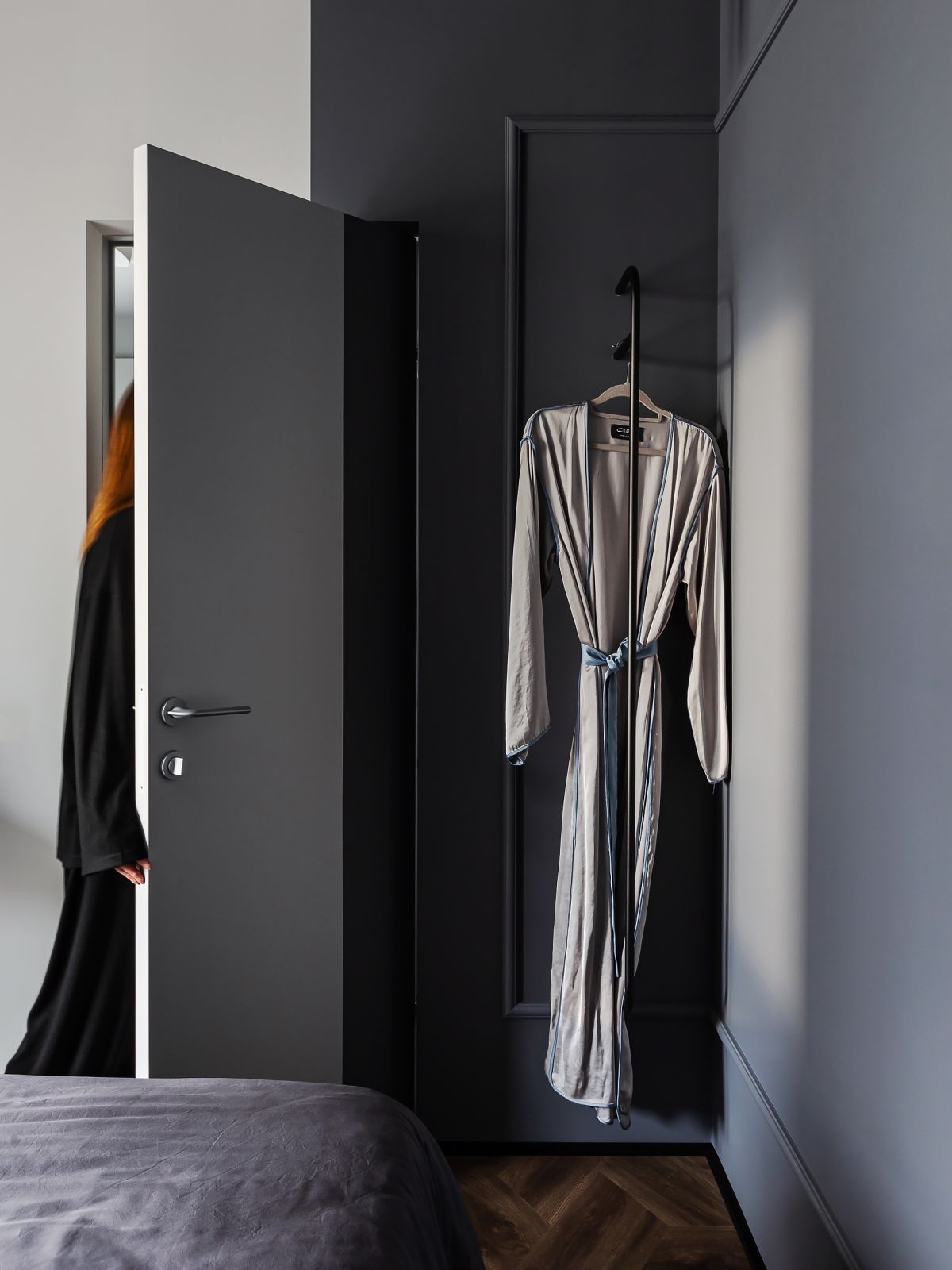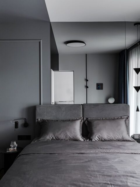Спальня небольшая, выполнена в более темных тонах. Она как будто обволакивает своим уютом. Главный акцент — это огромное зеркало за изголовьем кровати, которое добавляет глубину пространства. За это зеркало пришлось серьезно повоевать с мамой хозяйки квартиры, но мы очень рады, что отстояли это решение. Шкаф в спальню не вместился, но нашлось место для стильной металлической вешалки и туалетного столика.