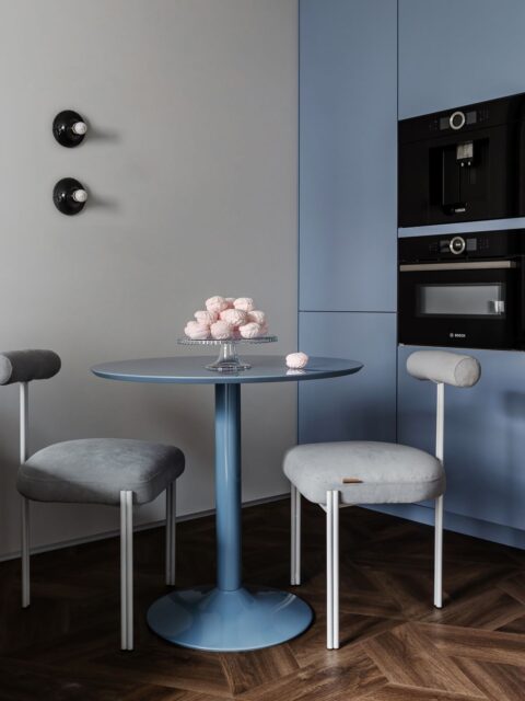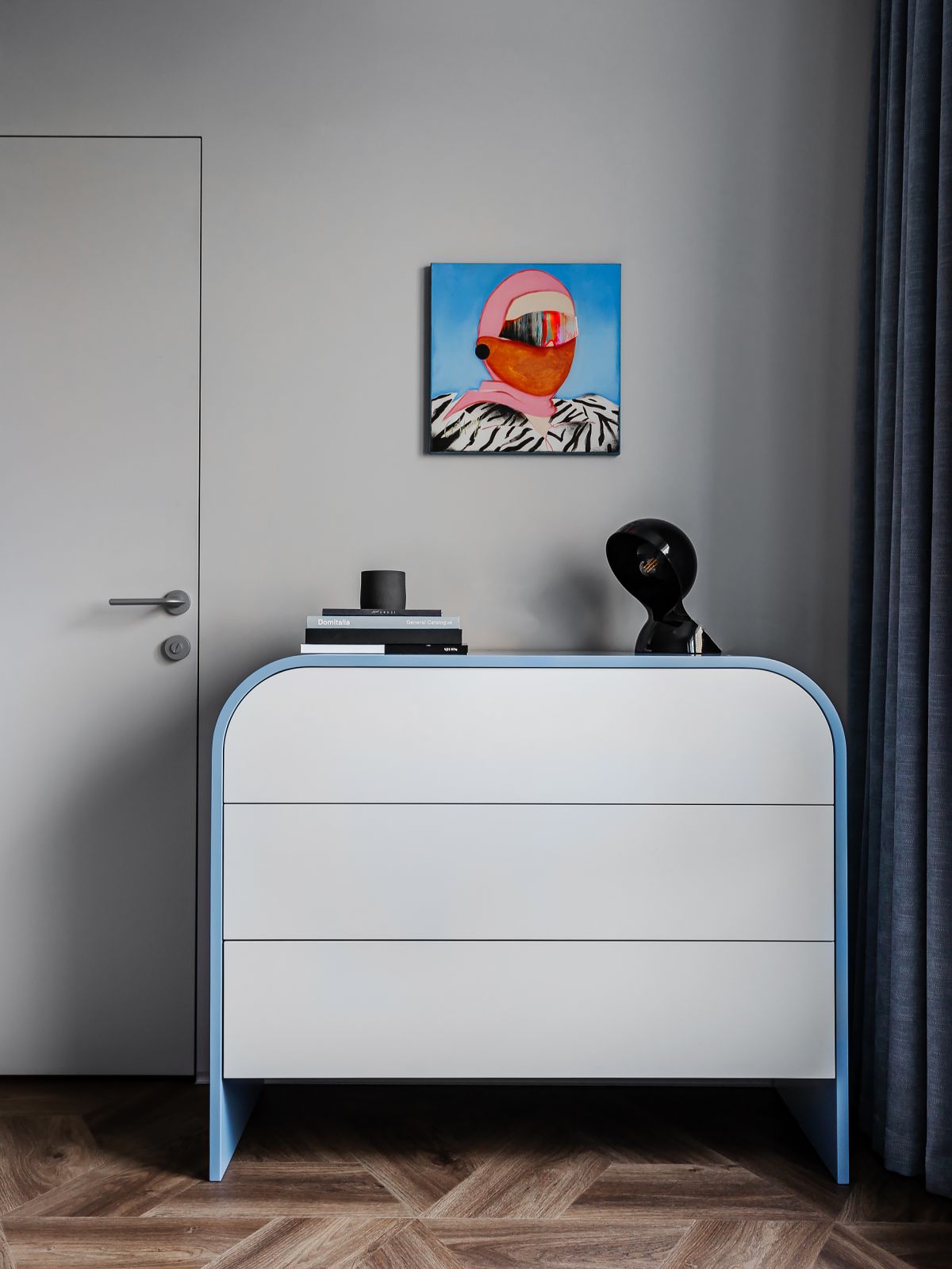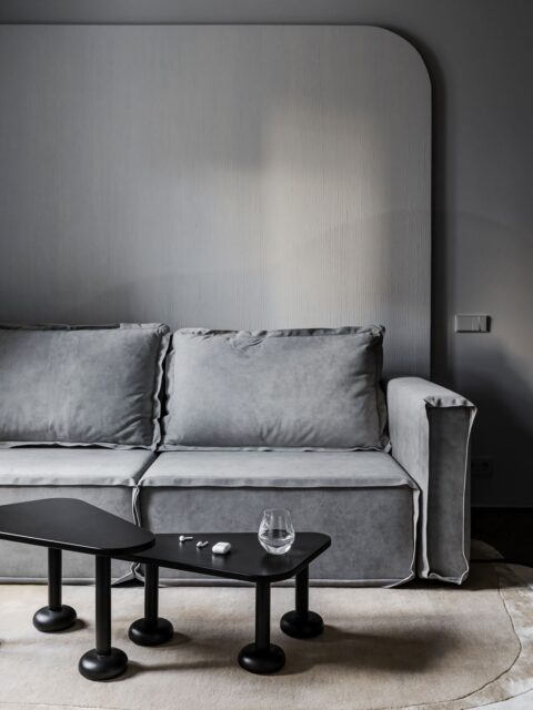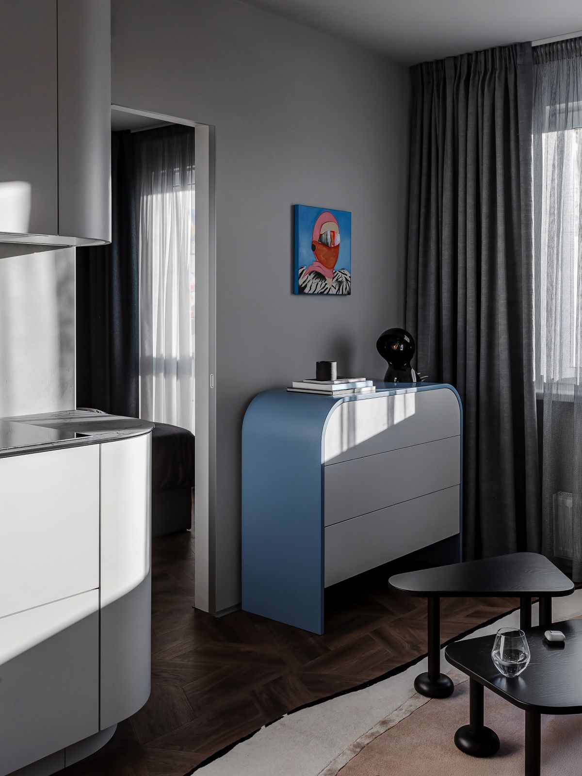 Вся квартира выполнена в холодных серых оттенках, в качестве цветового акцента у нас добавлены оттенки голубого и синего. Для того что бы скрыть углы и не рубить пространство острыми и грубыми прямоугольниками, в мебели и стенах мы добавили скругленные формы. В этой геометрии можно увидеть аккуратные отсылки к стилю Мемфис, которые поддерживаются формой декоративной стены, авторского комода, журнальных столиков и узора на ковре.