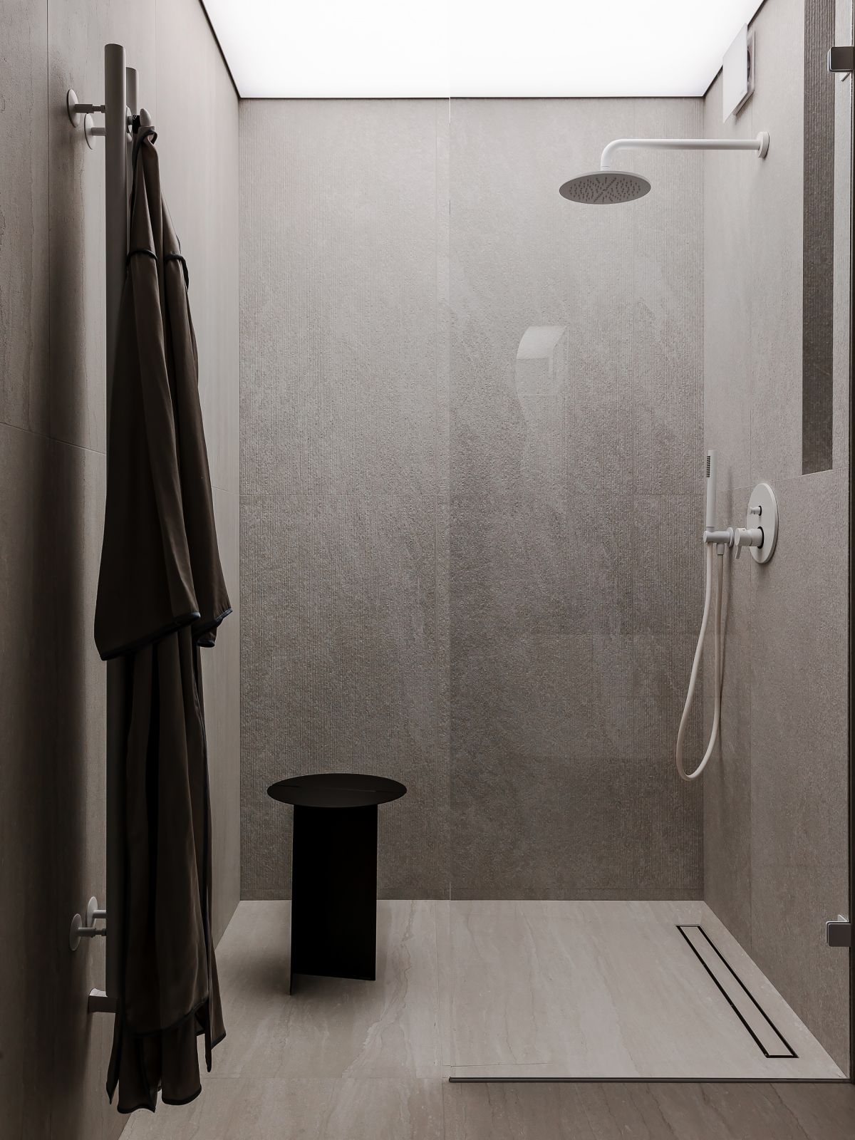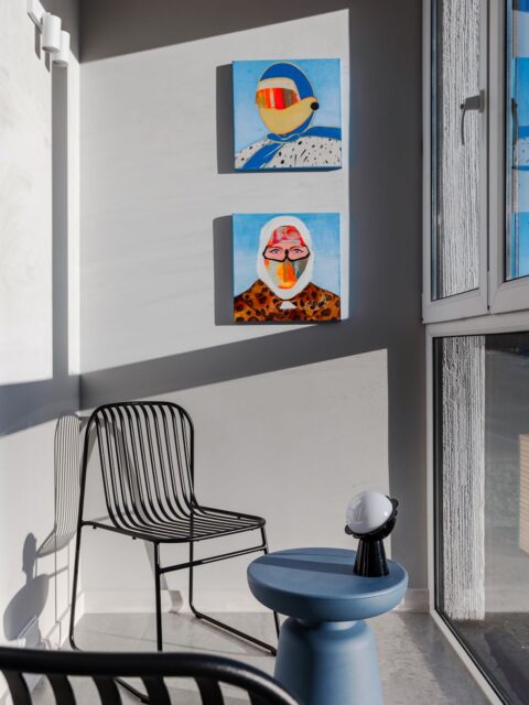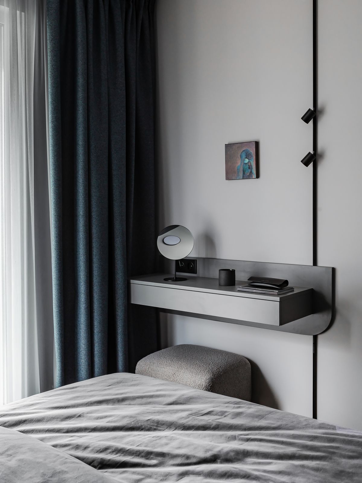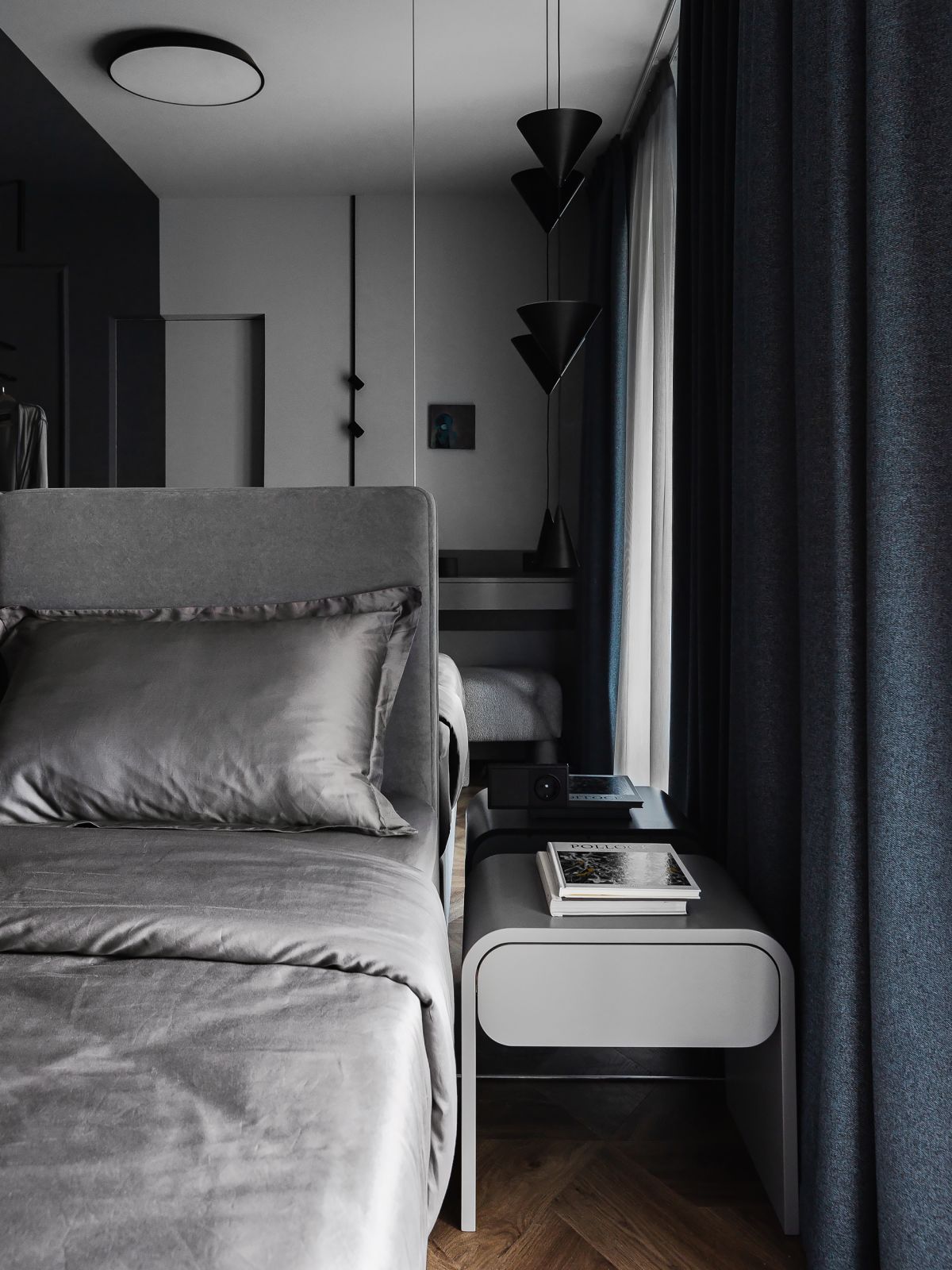 Вся квартира выполнена в холодных серых оттенках, в качестве цветового акцента у нас добавлены оттенки голубого и синего. Для того что бы скрыть углы и не рубить пространство острыми и грубыми прямоугольниками, в мебели и стенах мы добавили скругленные формы. В этой геометрии можно увидеть аккуратные отсылки к стилю Мемфис, которые поддерживаются формой декоративной стены, авторского комода, журнальных столиков и узора на ковре.