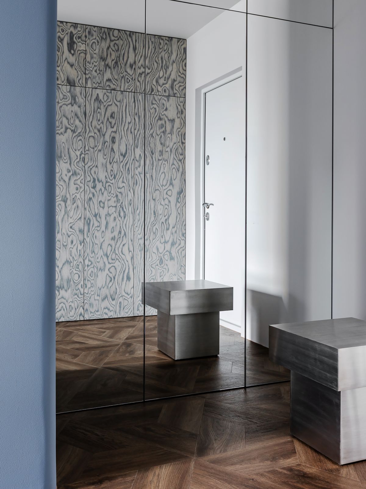 Все хранение мы вынесли в коридор (а его Василина просила много), расположив два больших шкафа друг напротив друга. Один шкаф у нас полностью зеркальный, для увеличения пространства, и чтобы делать селфи, а шкаф напротив из трендового шпона стал прекрасным фоном для фото.