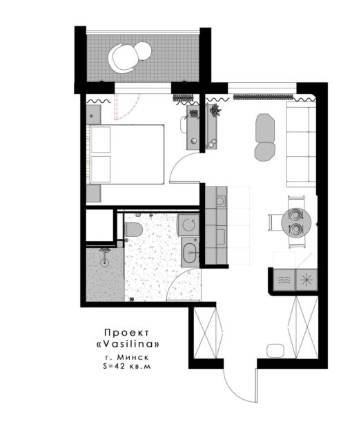 Несмотря на скромную площадь стандартной мапидовской однушки, нам удалось, путем небольшой перепланировки, выделить отдельную спальню и кухню-гостиную.