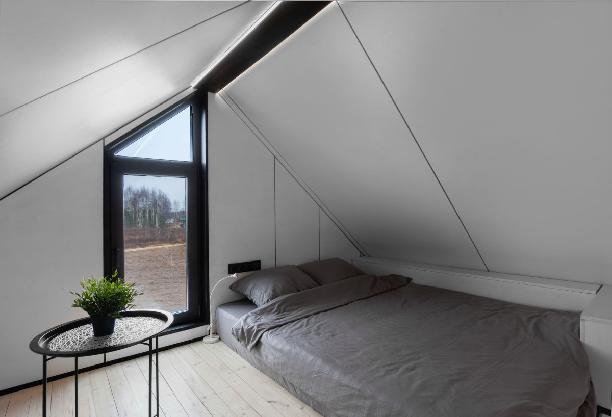 Крутая двускатная кровля помимо дополнительного объема и второго света в гостиной, позволила организовать дополнительные спальные места на антресоли над банной частью.