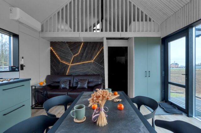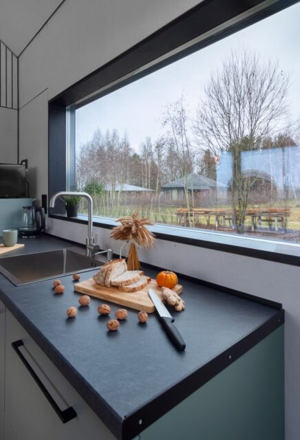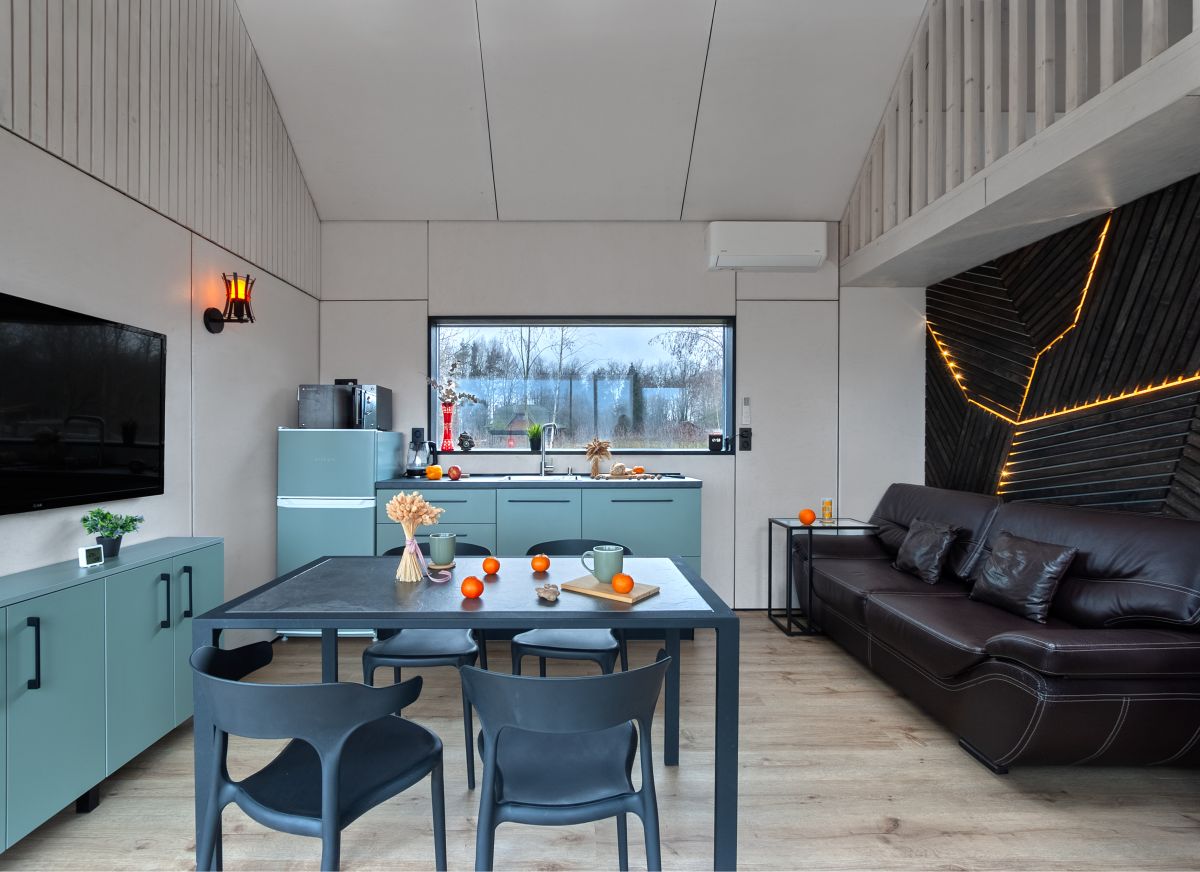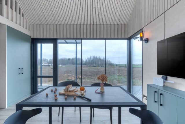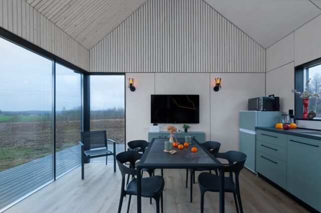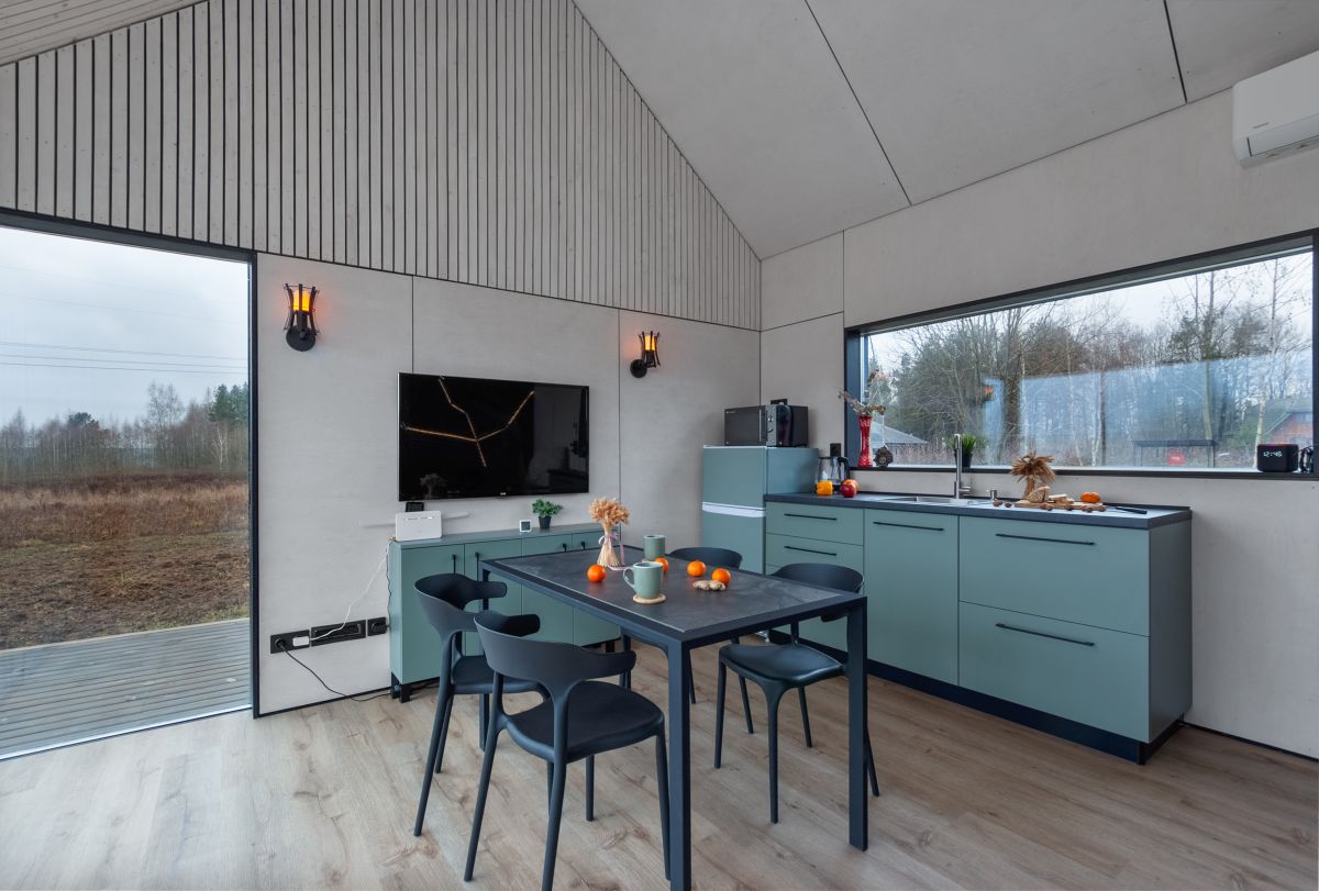 Внутренняя отделка сочетает фанеру и рейку. Мебель собрана из ДСП Egger «Зелёный эвкалипт» и фанеры, толщиной 18 мм. Холодильник перекрашен в цвет кухни, обеденный стол изготовлен под заказ из металлической профильной трубы и керамогранита, уложенного в душе и санузле. Панорамное остекление в пол выполнено безрамным способом, стёкла с зеркальным эффектом частично отражают солнечные лучи, что уменьшает перегрев внутренних поверхностей солнечным светом. Кроме того, дом сориентирован таким образом, что полуденное солнце направлено в торцевую стену, а в окна солнце попадает на восходе и на закате. Панорамные окна в пол визуально расширяют комнату на террасу, открывая вид на бескрайние поля.