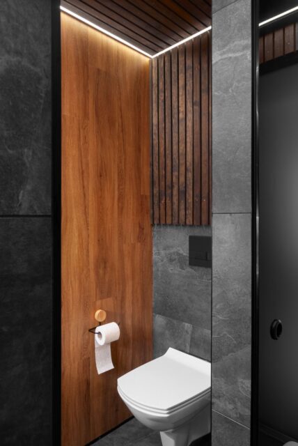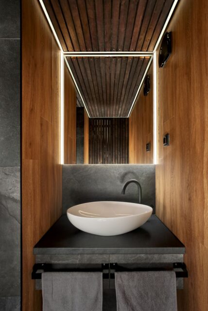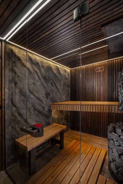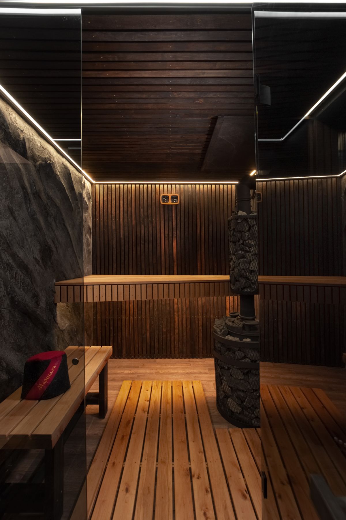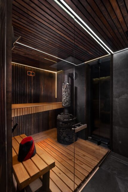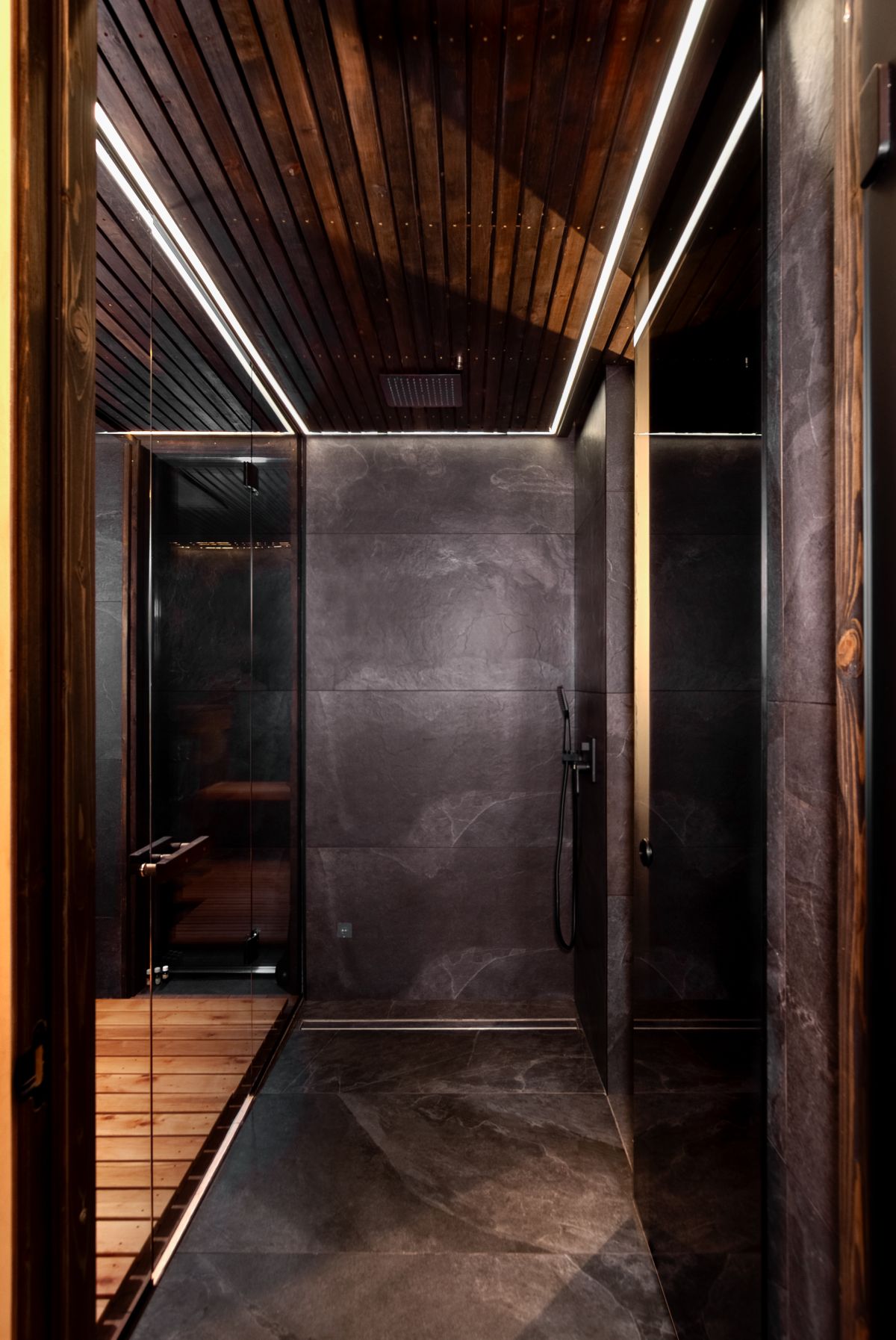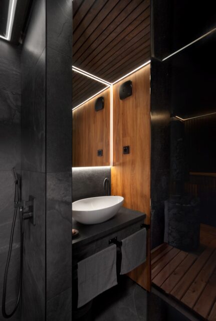 Изюминкой данного проекта стала банная часть, состоящая непосредственно из бани, душевой с тропическим душем и санузла, оборудованного инсталляцией и умывальником в виде чаши. Над умывальником расположено зеркало во всю стену с дополнительной подсветкой для макияжа. Весь банный комплекс выполнен в темных тонах со светодиодным освещением по периметру потолка. На двух стенах санузла применен клеевой кварцвинил с текстурой шпона дорогих пород дерева. Всё это создает спокойную, уютную обстановку в которой хочется задержаться подольше, чтобы отдохнуть от быстрого ритма мегаполиса. Дровяная печь с закрытой каменкой долго держит температуру и даёт мягкий пар.