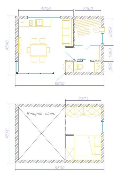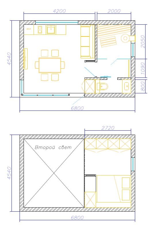 В соответствии с техзаданием надо было создать модульный домик выходного дня для семьи из 4-х человек с баней-сауной и вторым светом в гостиной. При этом общая площадь должна быть не более 30 м2.