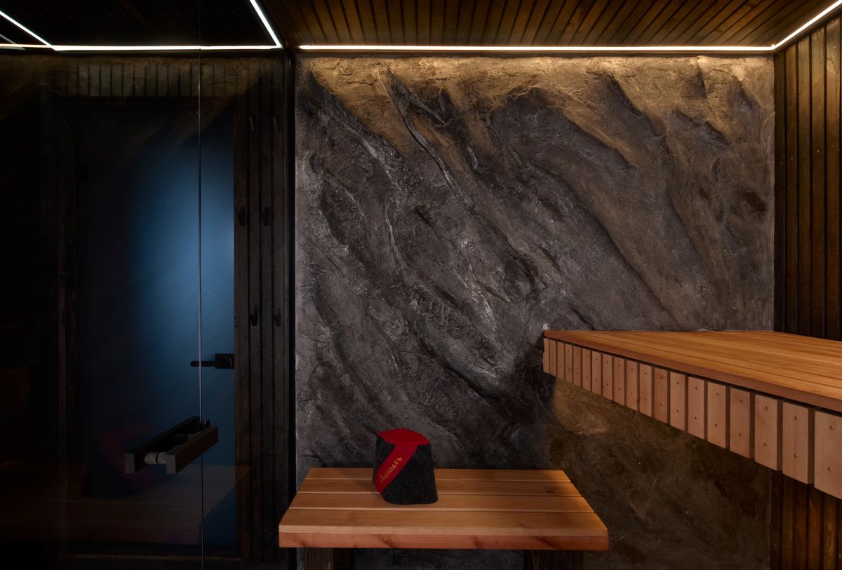 Отдельно хочется отметить декоративную стену в бане, выполненную в виде скалы, которая помимо декоративной функции является дополнительным аккумулятором тепла. Ещё одной особенностью данной бани является окно в пол, расположенное возле топки.