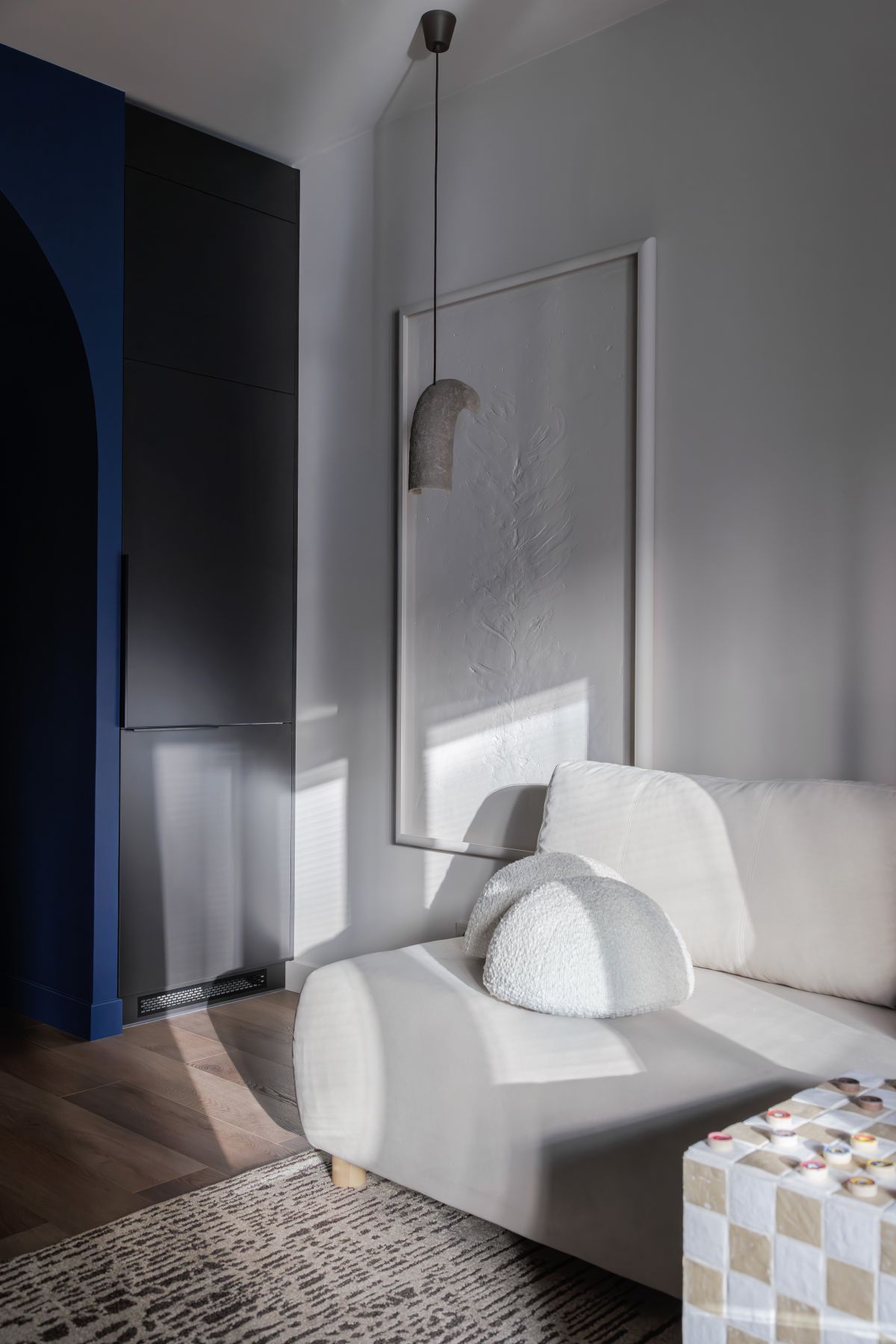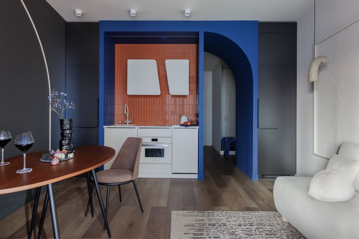 На кухне мы словно в ночное время видим дом В.Кандинского в Мурнау. Вокруг черное небо, любимым синим цветом художника окантована черепичная крыша и два мансардных окна в ней. Акцент смещен на форму подвесных шкафов неправильной округлой формы. Мы фактически не видим присутствие кухни в небольшой гостиной, мы видим композицию из геометрических форм и цветовых акцентов.