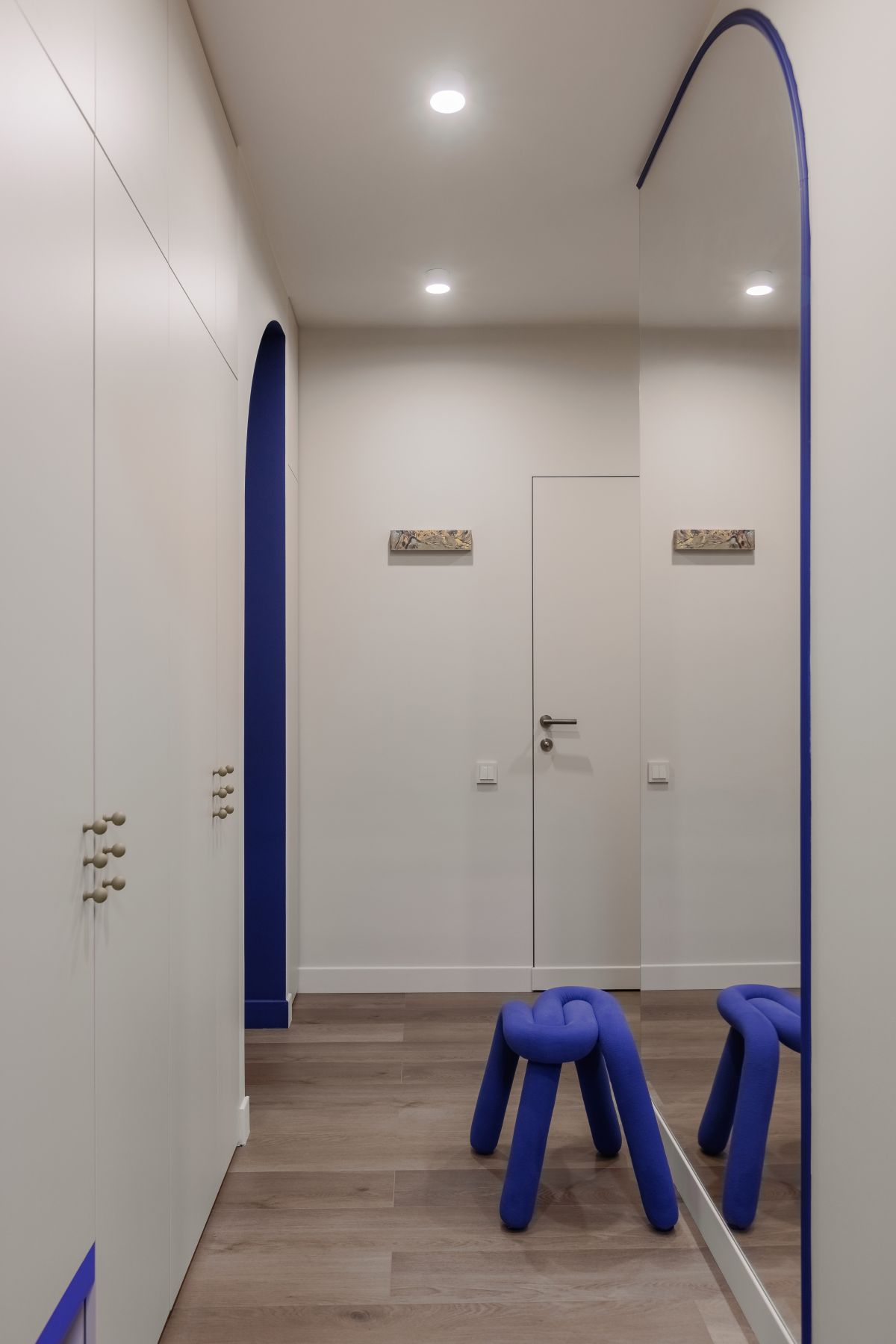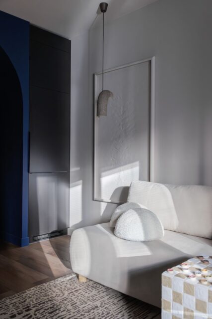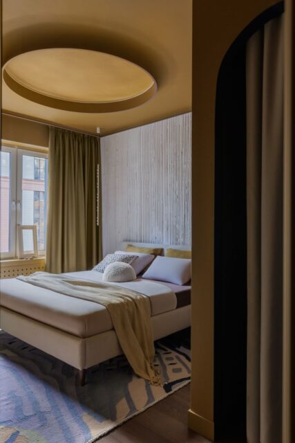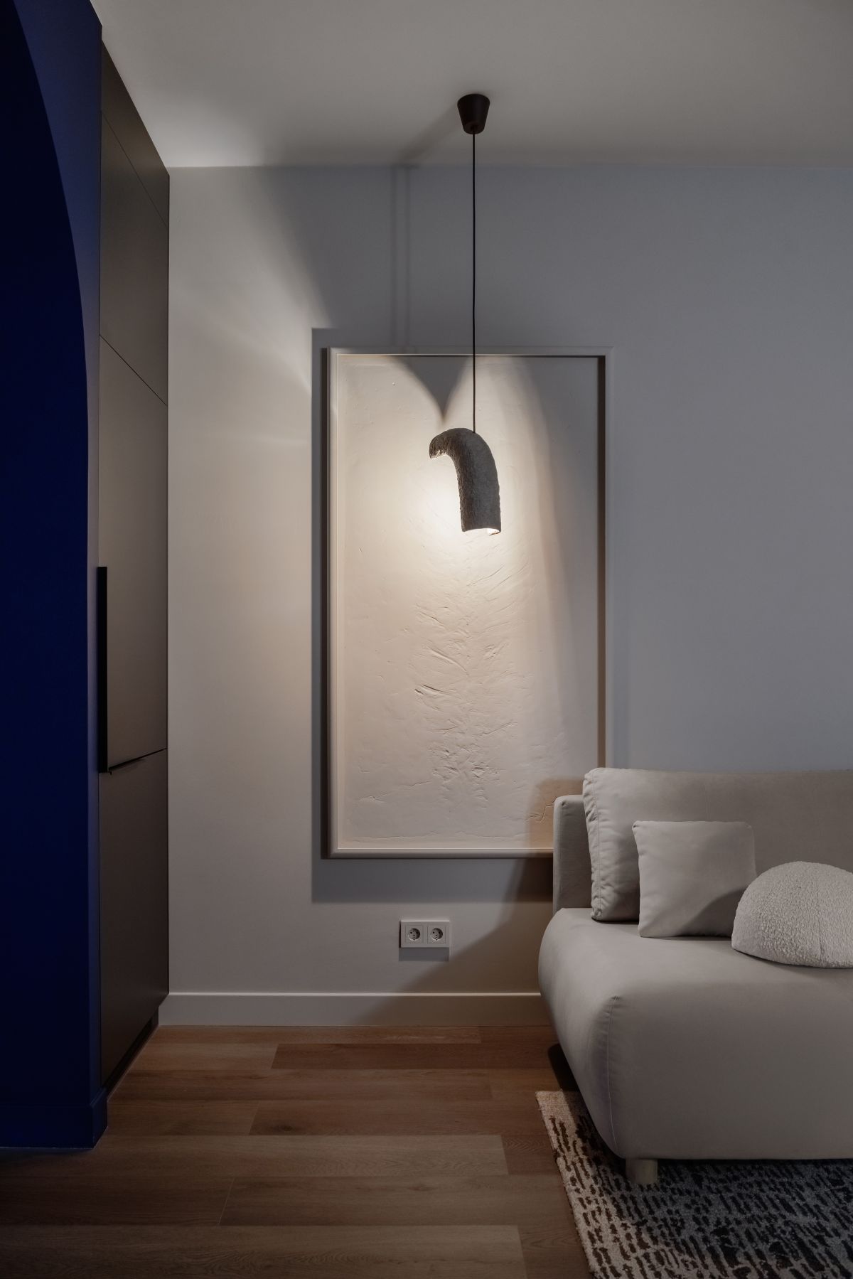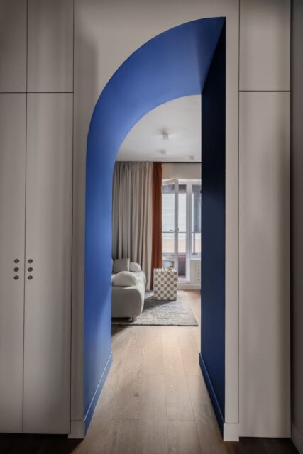 Плавные формы, разнообразие фактур, не идеально ровных матовых поверхностей стен, потолка и даже мебели, светильников, которые свойственны стилю ваби-саби, мы окрасили красками и впустили игривый яркий постмодернизм, взламывающий все шаблоны.