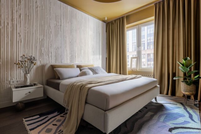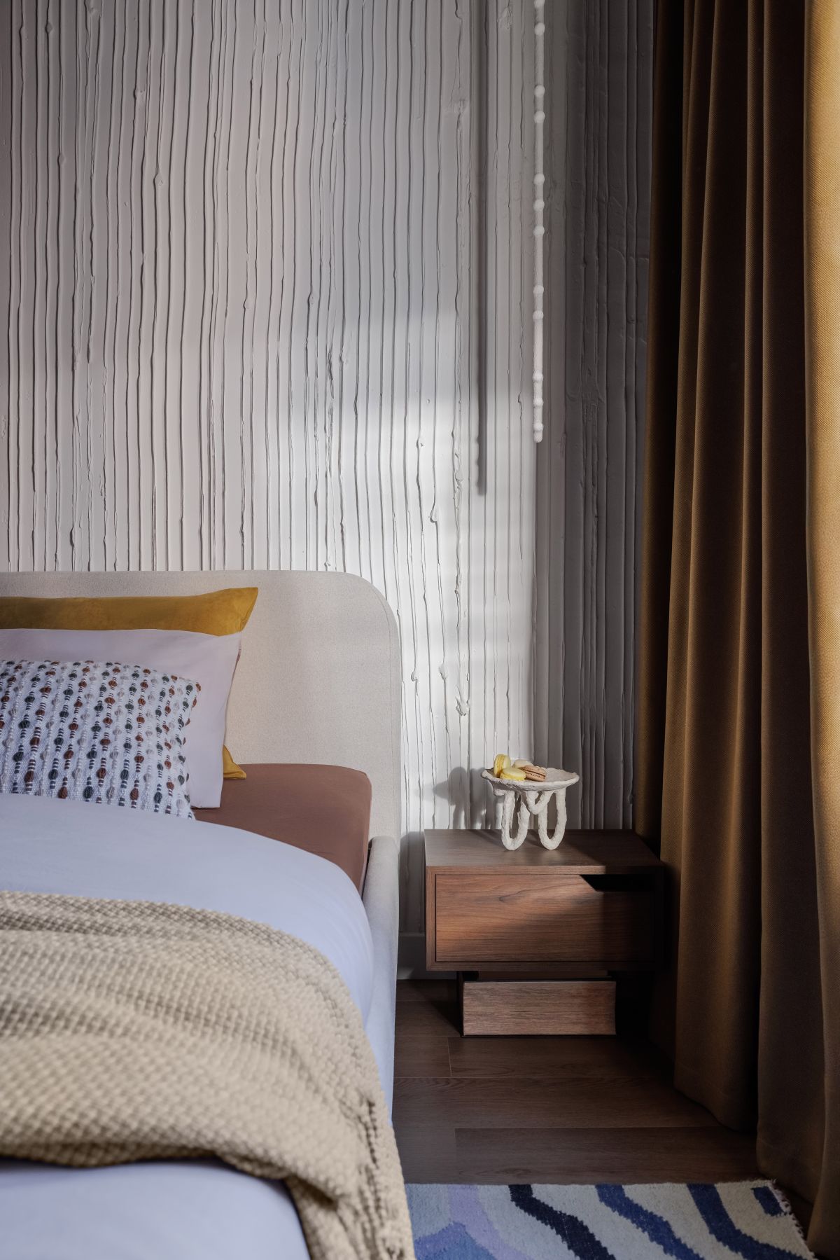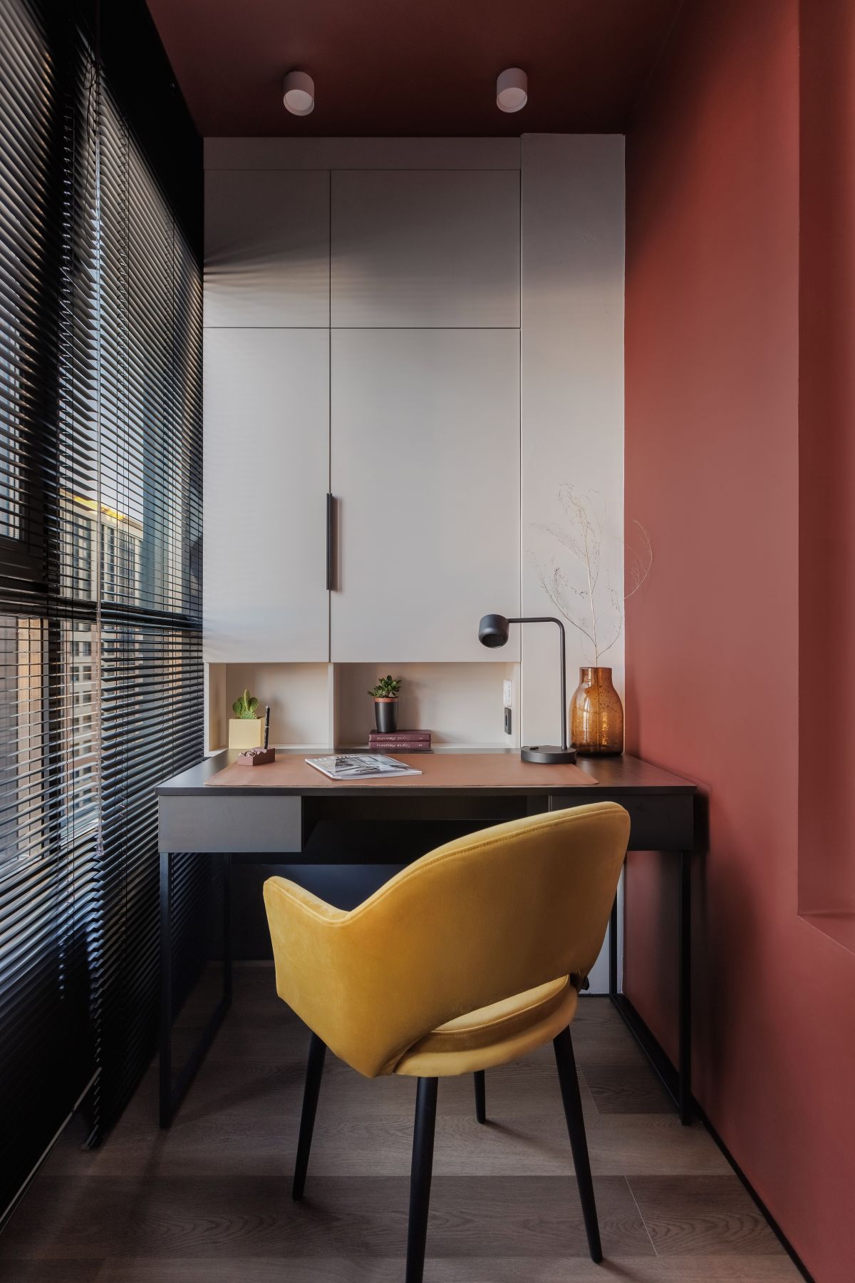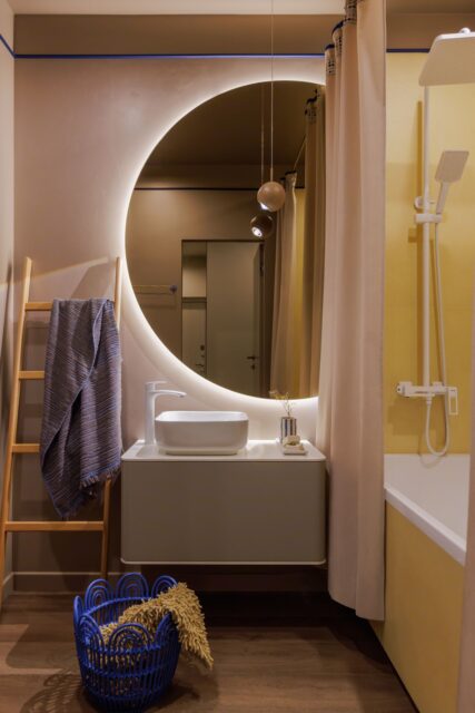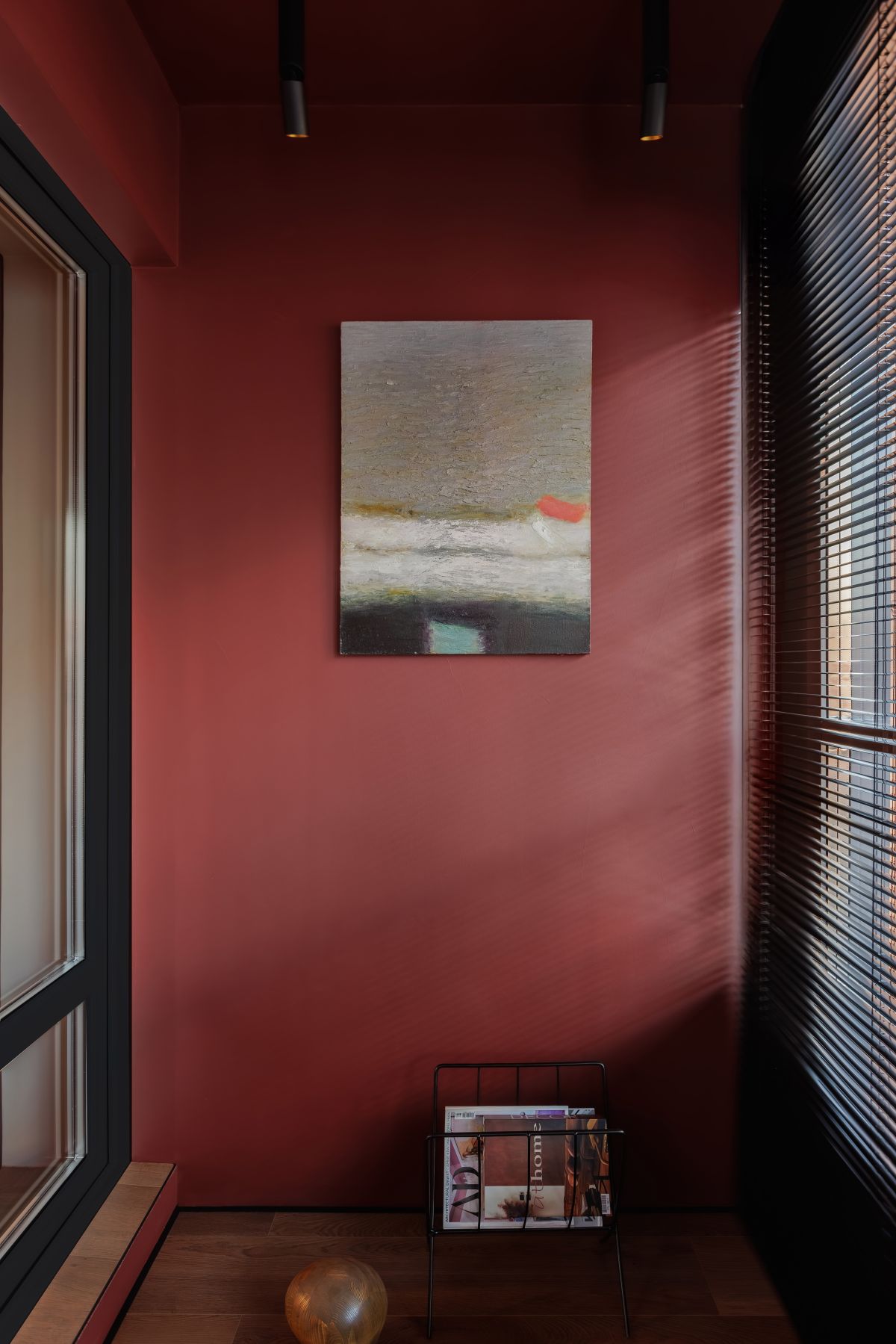 Плавные формы, разнообразие фактур, не идеально ровных матовых поверхностей стен, потолка и даже мебели, светильников, которые свойственны стилю ваби-саби, мы окрасили красками и впустили игривый яркий постмодернизм, взламывающий все шаблоны.