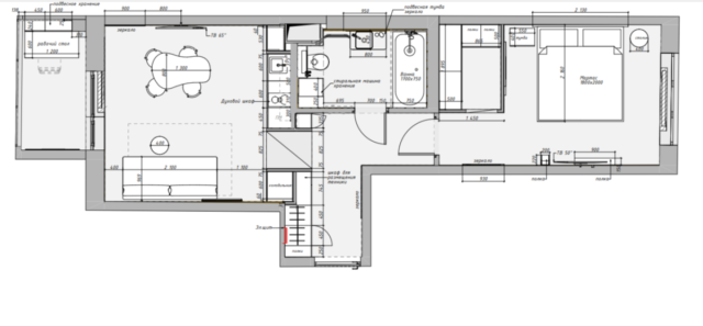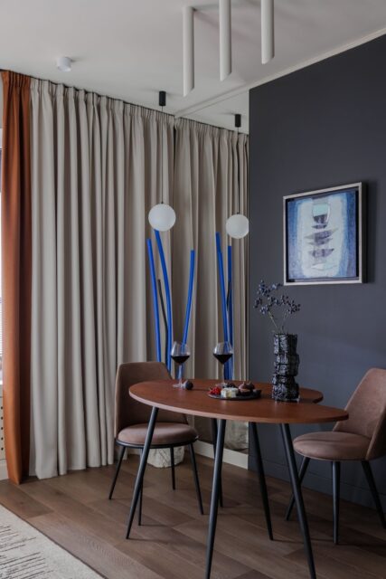 Обеденный стол- это отдельный арт объект в концепции всего интерьера и с учетом основного рода деятельности хозяина квартиры. Множество ног стола под разным углом будто сошли с картины «Пейзаж», а столешница сделана в форме палитры художника.