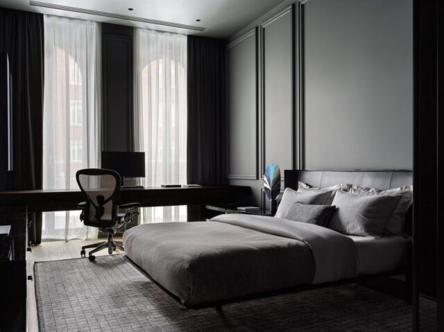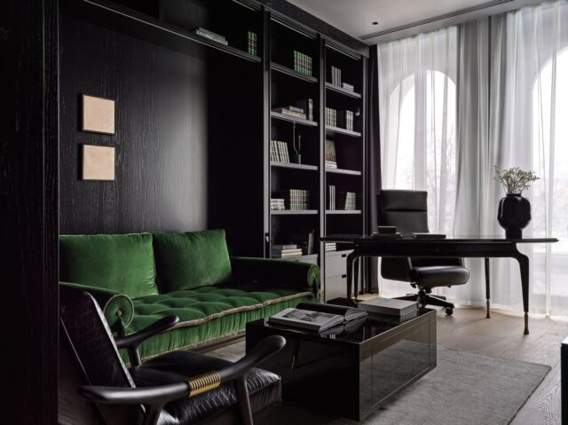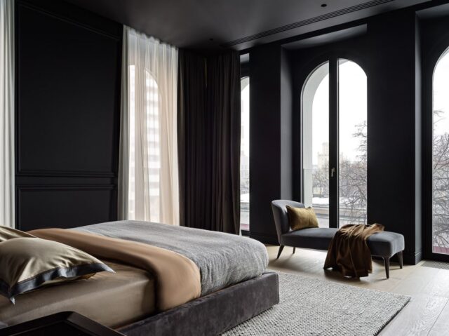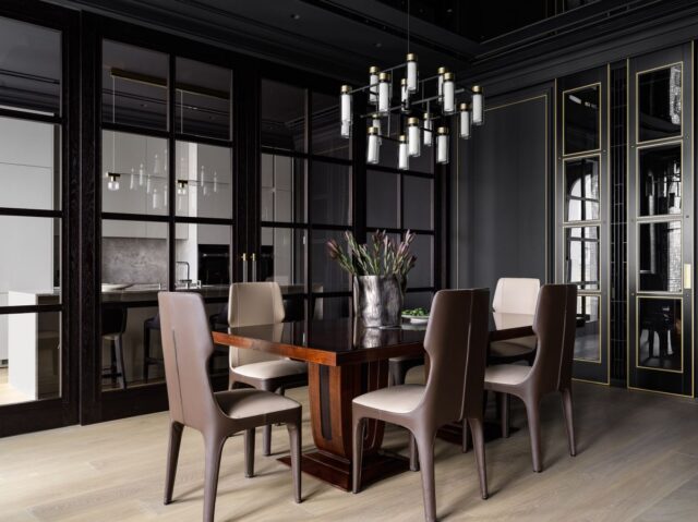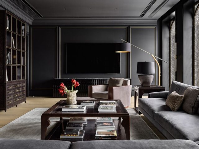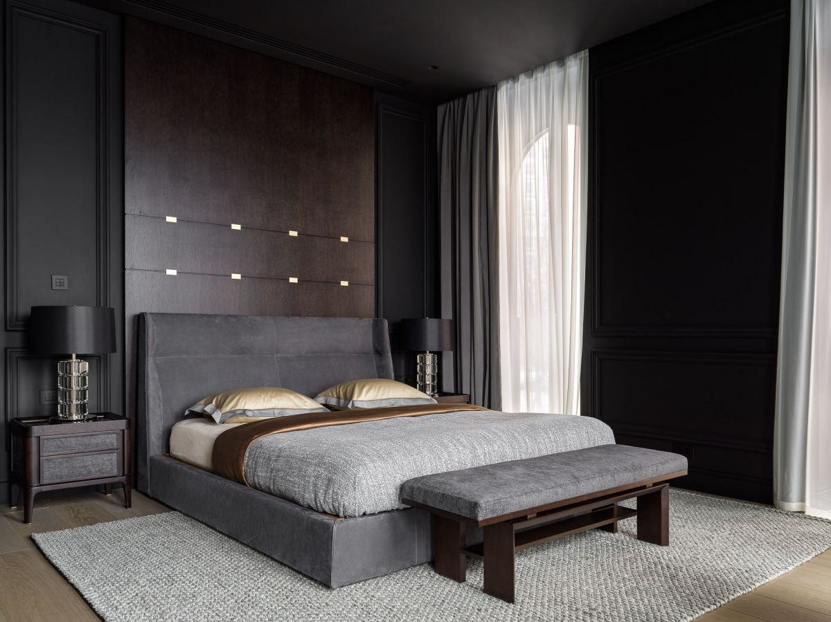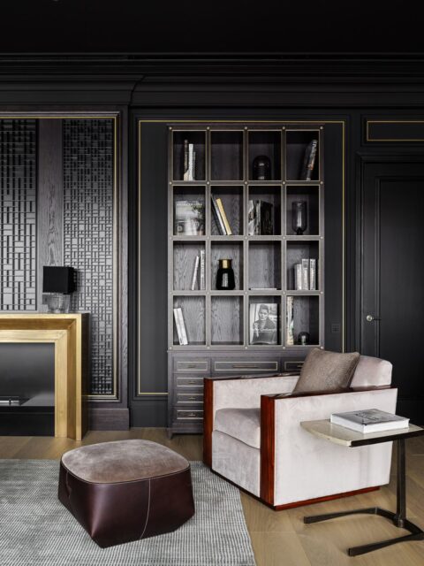 Интерьер создан с помощью сочетания нескольких декоративных приемов: большие заливки плоскостей, геометрия форм, высокое качество отделочных материалов и работ, которые обеспечили безупречность линий, узлов и примыканий. Темная цветовая гамма требовала особого внимания к подбору мебели и декора, поэтому предпочтение мы отдали английским и американским брендам: Baker, Ralph Lauren Home, а также добавили к ним итальянской классики — Minotti, Etro, Giorgetti, Baxter.