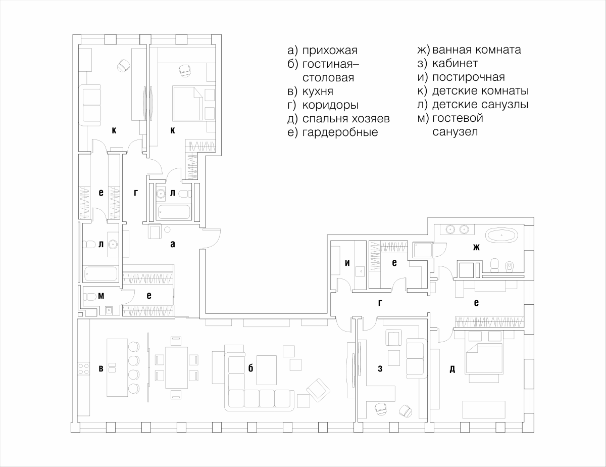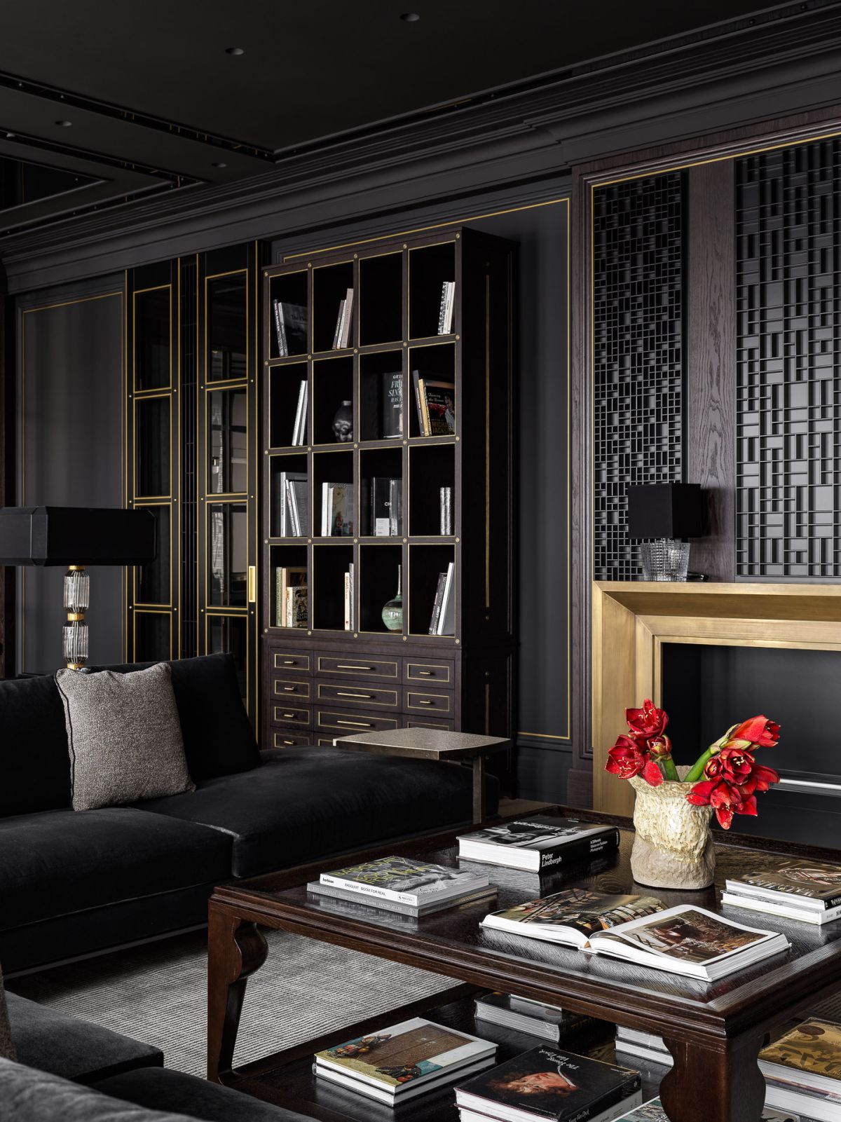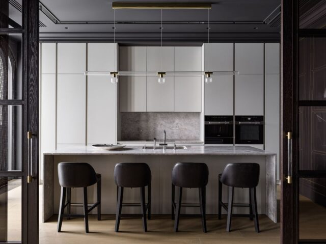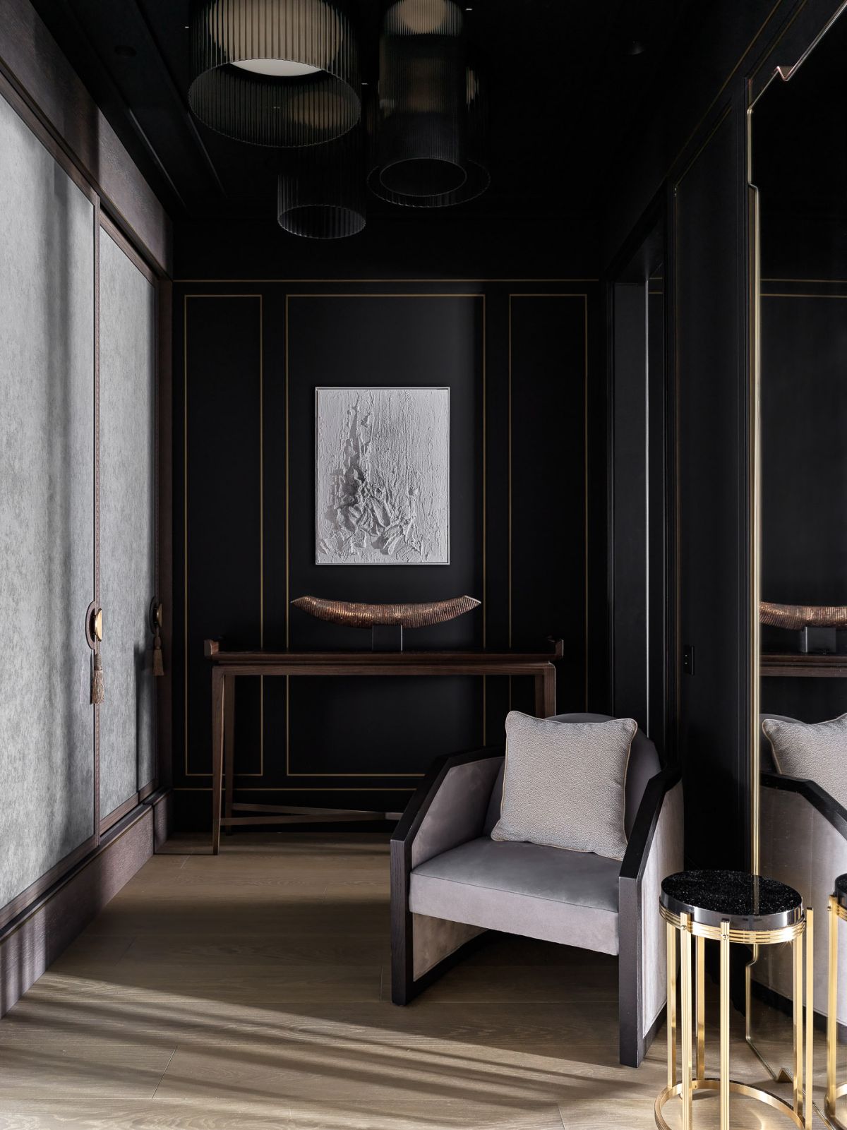 Интерьер создан с помощью сочетания нескольких декоративных приемов: большие заливки плоскостей, геометрия форм, высокое качество отделочных материалов и работ, которые обеспечили безупречность линий, узлов и примыканий. Темная цветовая гамма требовала особого внимания к подбору мебели и декора, поэтому предпочтение мы отдали английским и американским брендам: Baker, Ralph Lauren Home, а также добавили к ним итальянской классики — Minotti, Etro, Giorgetti, Baxter.