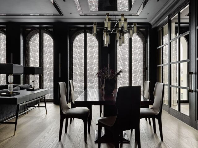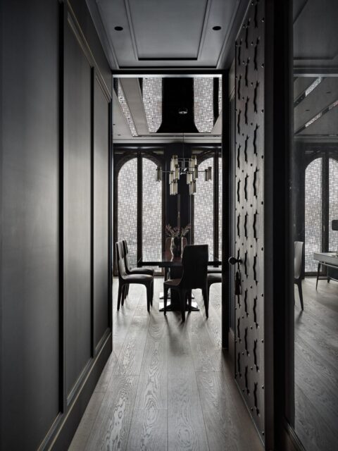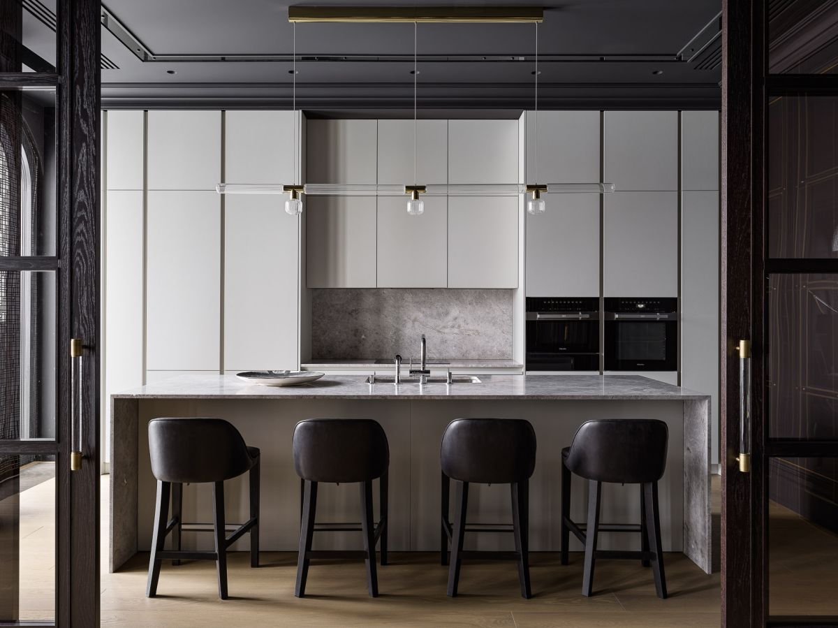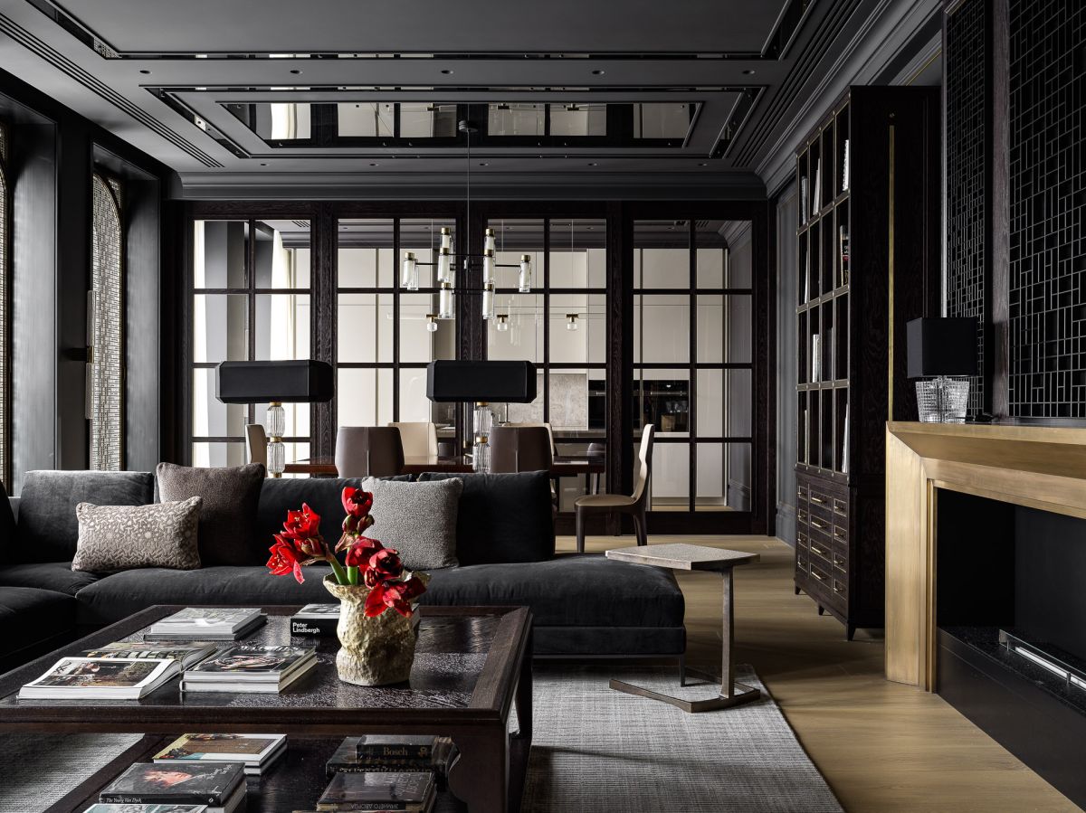 Учитывая пожелания хозяев, минималистичный дизайн в светлых тонах был трансформирован в сдержанно-торжественную классику, которая вобрала в себя ориентальные мотивы, современный декор и элементы ар-деко. В итоге получился глубокий практически монохромный интерьер с брутальными фактурами и нестандартными решениями. Например, необычным акцентом в гостиной стали ставни из латуни с ажурным геометрическим узором, выполненным лазерной резкой.