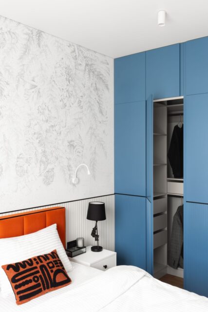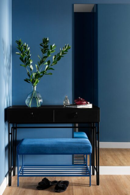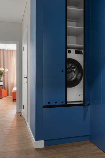 Ключевым решением стало использование глубокого синего цвета в сочетании с теплым терракотовым, что придаёт пространству характер и индивидуальность. Белые и светло-серые стены служат фоном, позволяя цветным деталям раскрыться в полной мере.