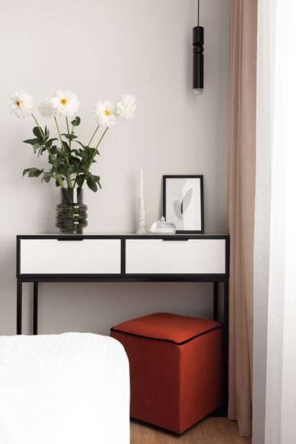 Спальня оформлена в сочетании текстур: мягкое изголовье кровати, деревянный пол, рельефные фасады мебели. Элегантные детали – изящный чёрный светильник, скульптурный декор и графичный текстиль – добавляют интерьеру стильности.