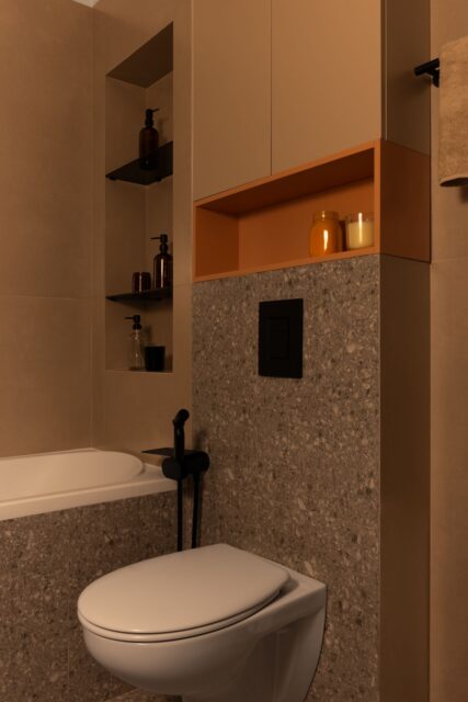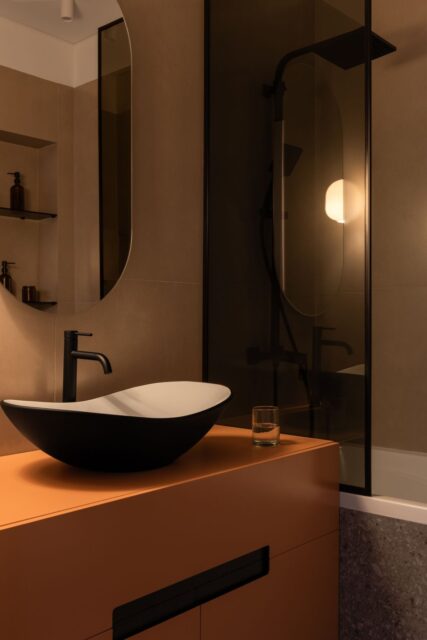 Ванная комната продолжает общую концепцию: контрастные формы, матовые и глянцевые поверхности, игра света и отражений. Необычная раковина и насыщенный цвет тумбы делают пространство не просто функциональным, но и дизайнерским.