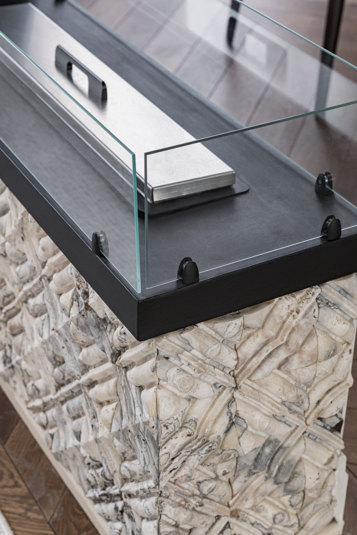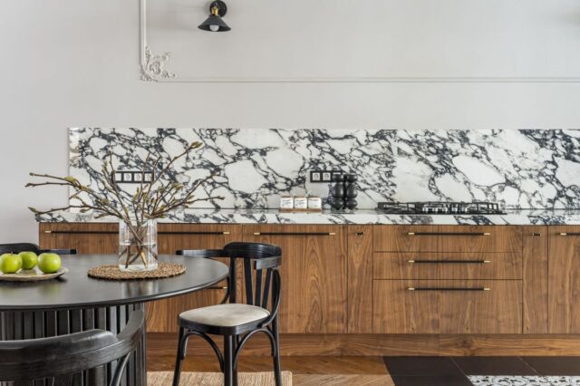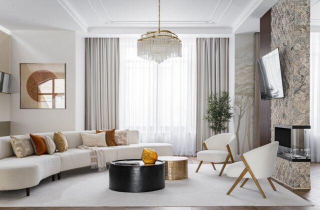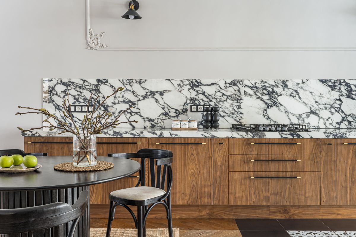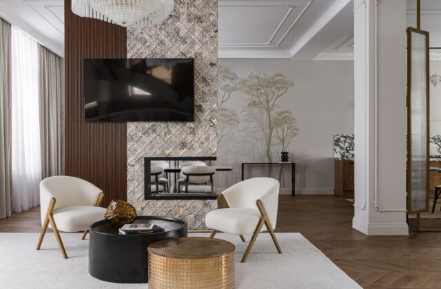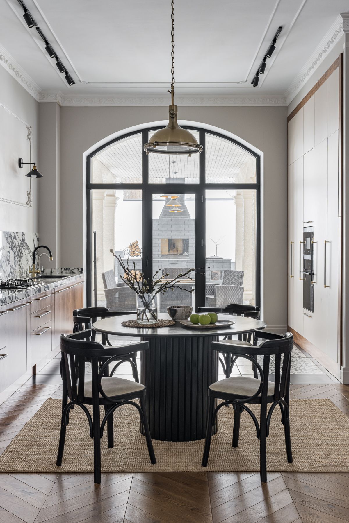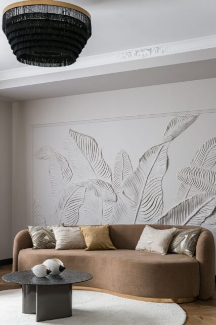 Интерьер строился на натуральных материалах: дерево, мрамор, камень и тёплые природные оттенки создавали баланс. Барельефы и ручная роспись на стенах добавили пространству индивидуальность, а кухня в парижском стиле стала стильным и функциональным акцентом. Часть мебели была адаптирована из старого дома, а остальная выполнена местными мастерами.