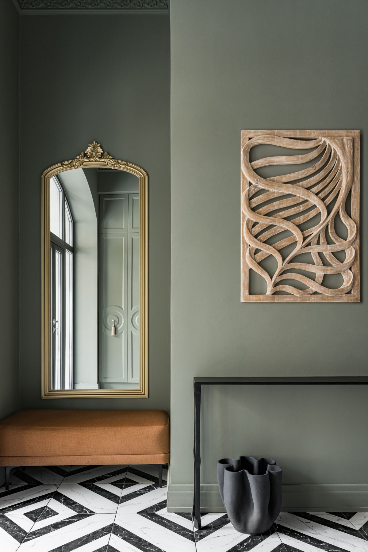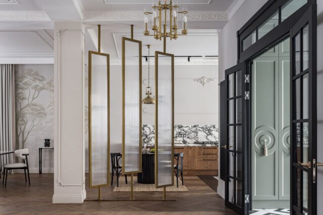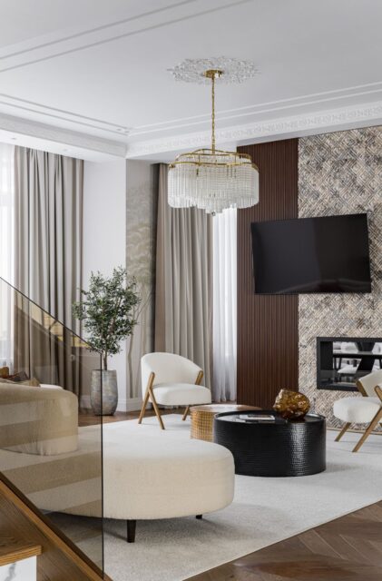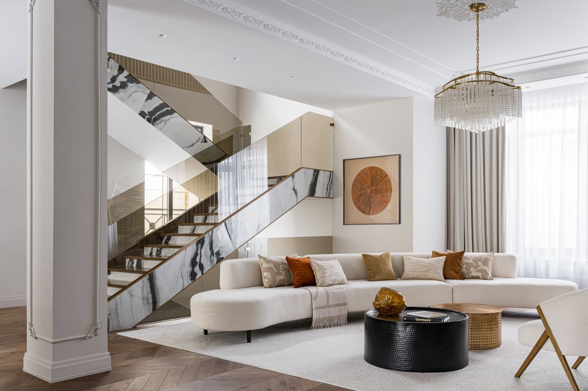 Когда мы вошли в проект, здание уже имело основную форму. Пространство с высокими потолками выглядело впечатляюще, но требовало доработки, чтобы стать уютным и функциональным. Нам предстояло адаптировать его под ритм жизни заказчиков — семьи, где хозяйка, профессиональный психолог и многодетная мать, ценила гармонию, а её муж, человек тонкого вкуса, стремился к утончённому, но комфортному интерьеру. Их дом должен был отражать их путешествия и духовные поиски.