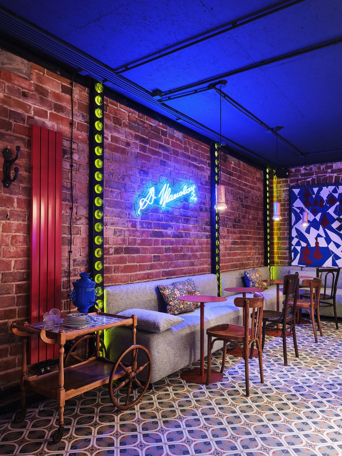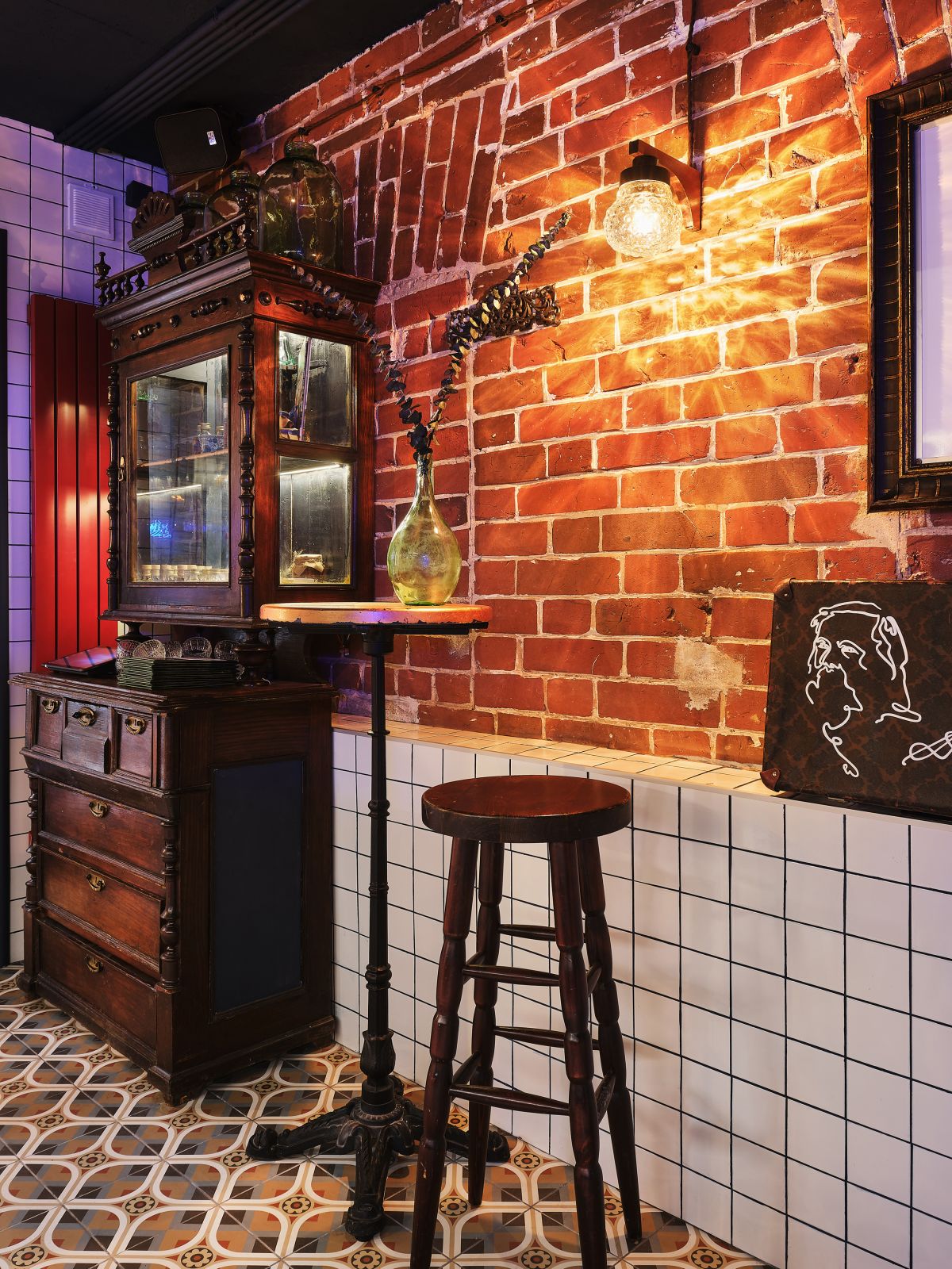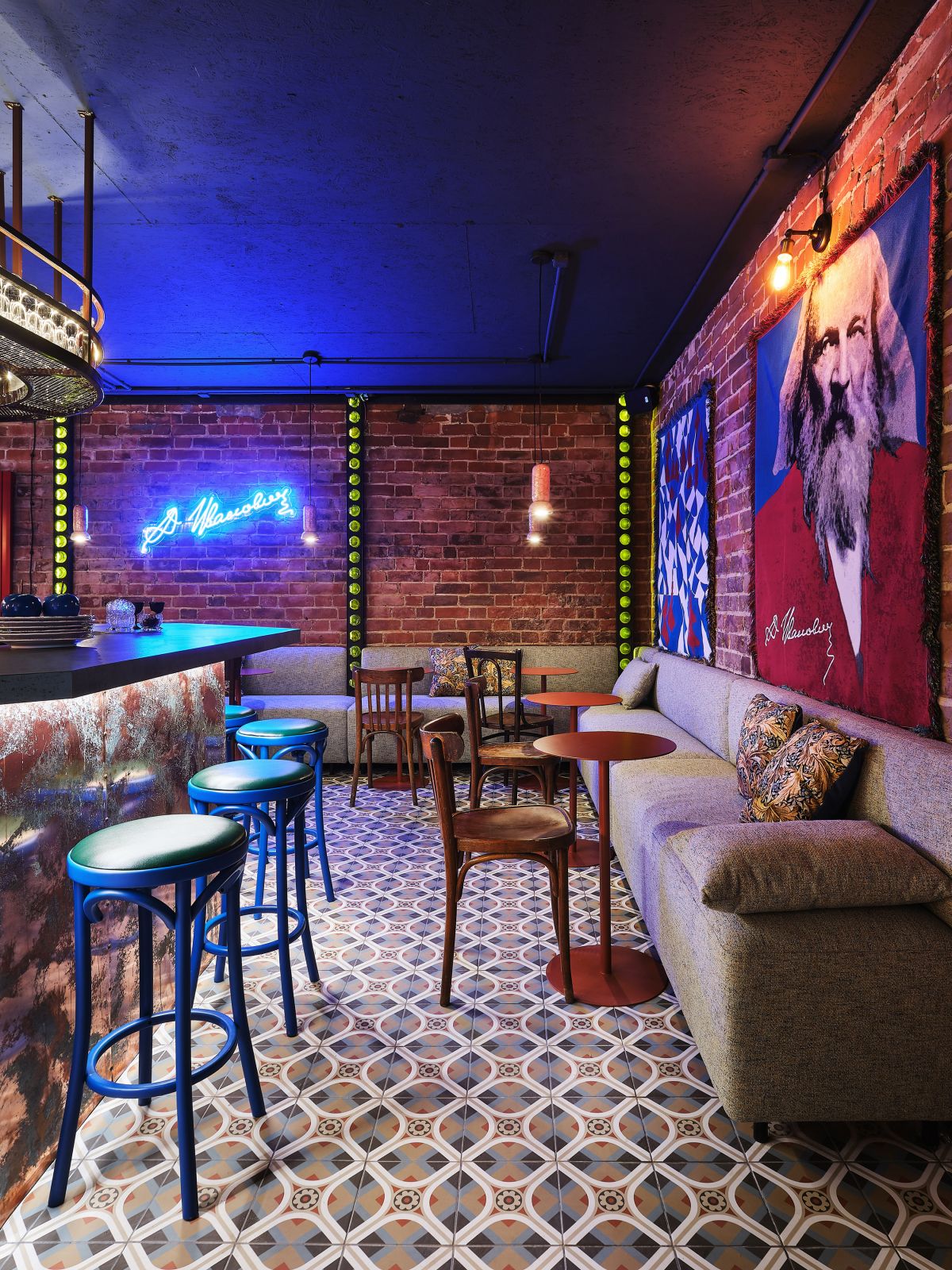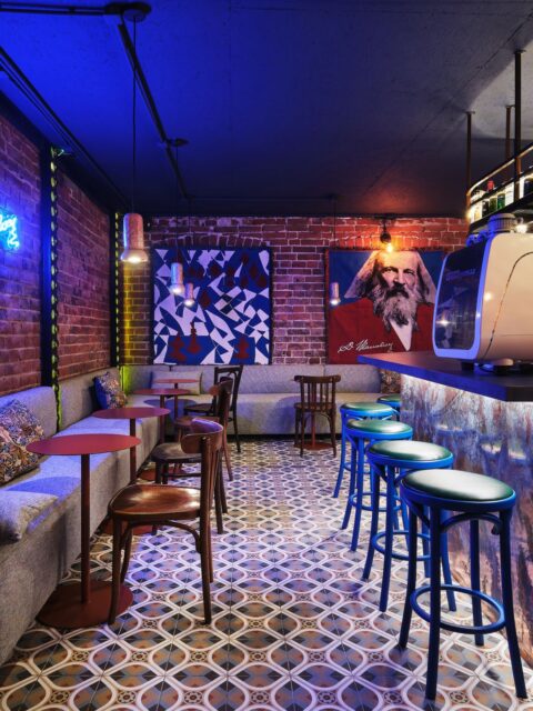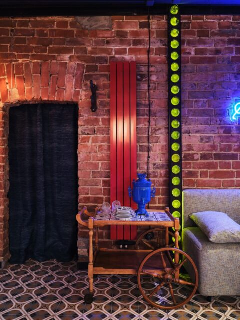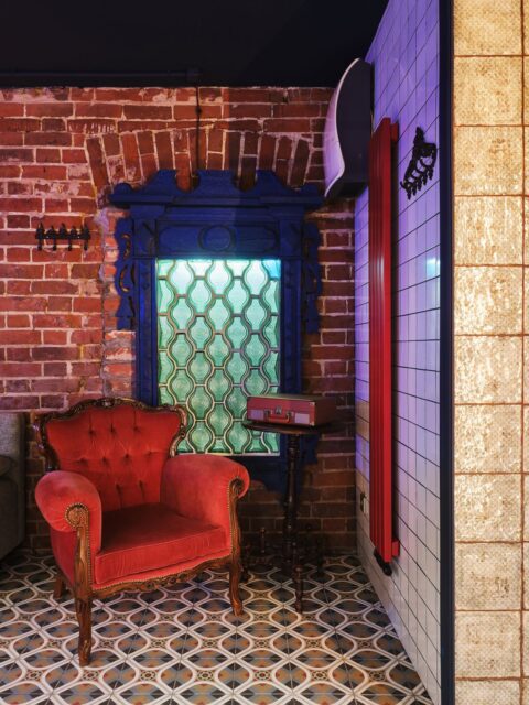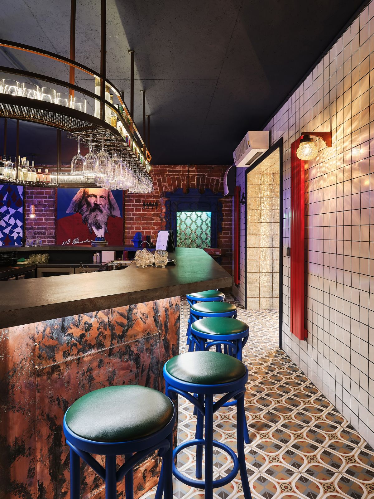 Идеи использованные в интерьере: Синий цвет — как цвет глаз Менделеева, стеклоблоки Фальконье в декоре, точно такие же, как были в детстве Менделеева в доме его матери — мы нашли современных производителей, которые смогли изготовить такие же. Чемоданы тоже не зря заняли свое место в интерьере, ведь знаменитый химик любил их делать, по словам его жены – так он отдыхал от умственного напряжения.