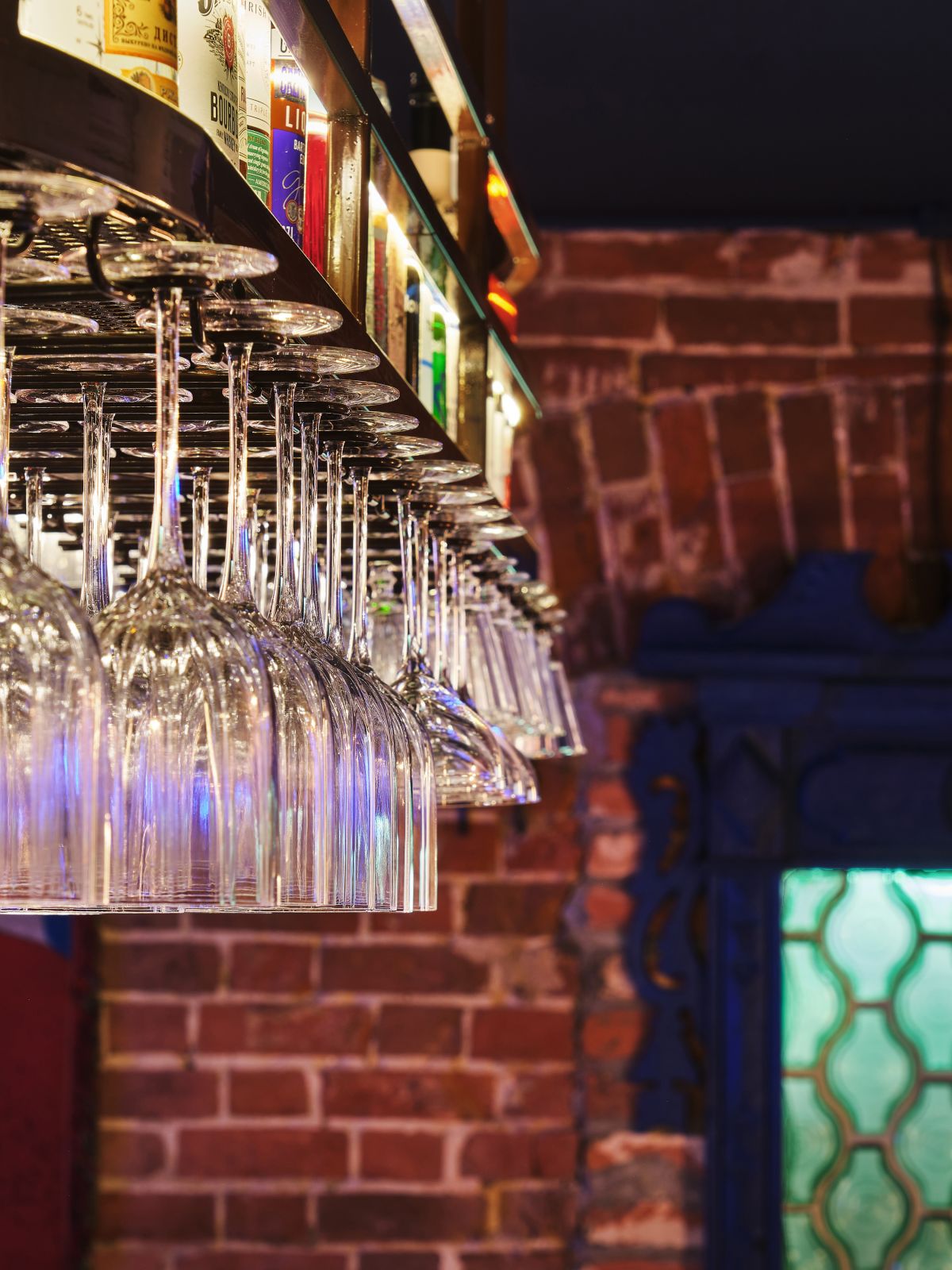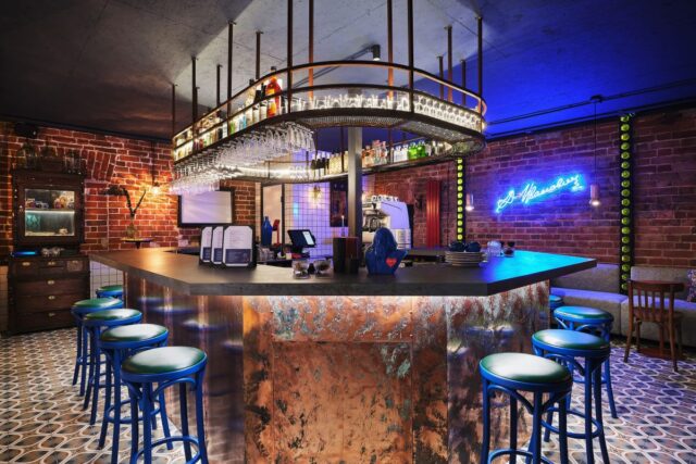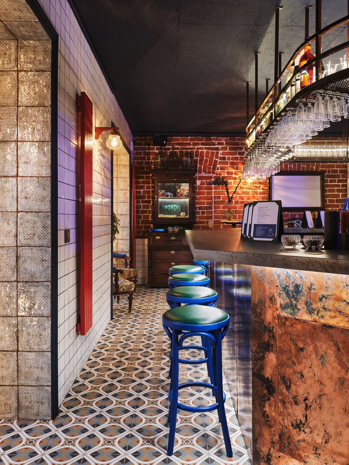 Барная стойка покрыта медными листами; Благодаря травлению на нем получались необычные, красивые узоры.