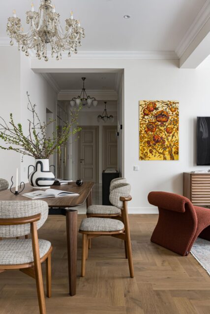 Именно поэтому, интерьер сочетает в себе известные европейские предметы декора с узнаваемыми формами и графическим рисунком, а так же картины местных авторов, как например, картина Сауле Медиевой исполненная в технике войлок на тему Родко.