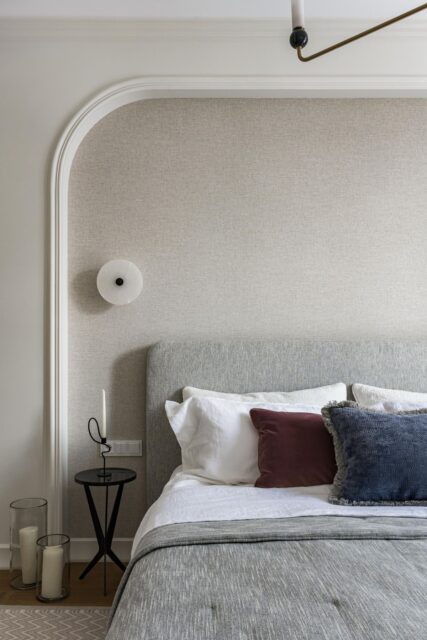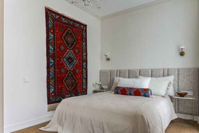 Тему востока передает ковер, который является наследием семьи и особенно красиво звучит в светлой современной спальне.