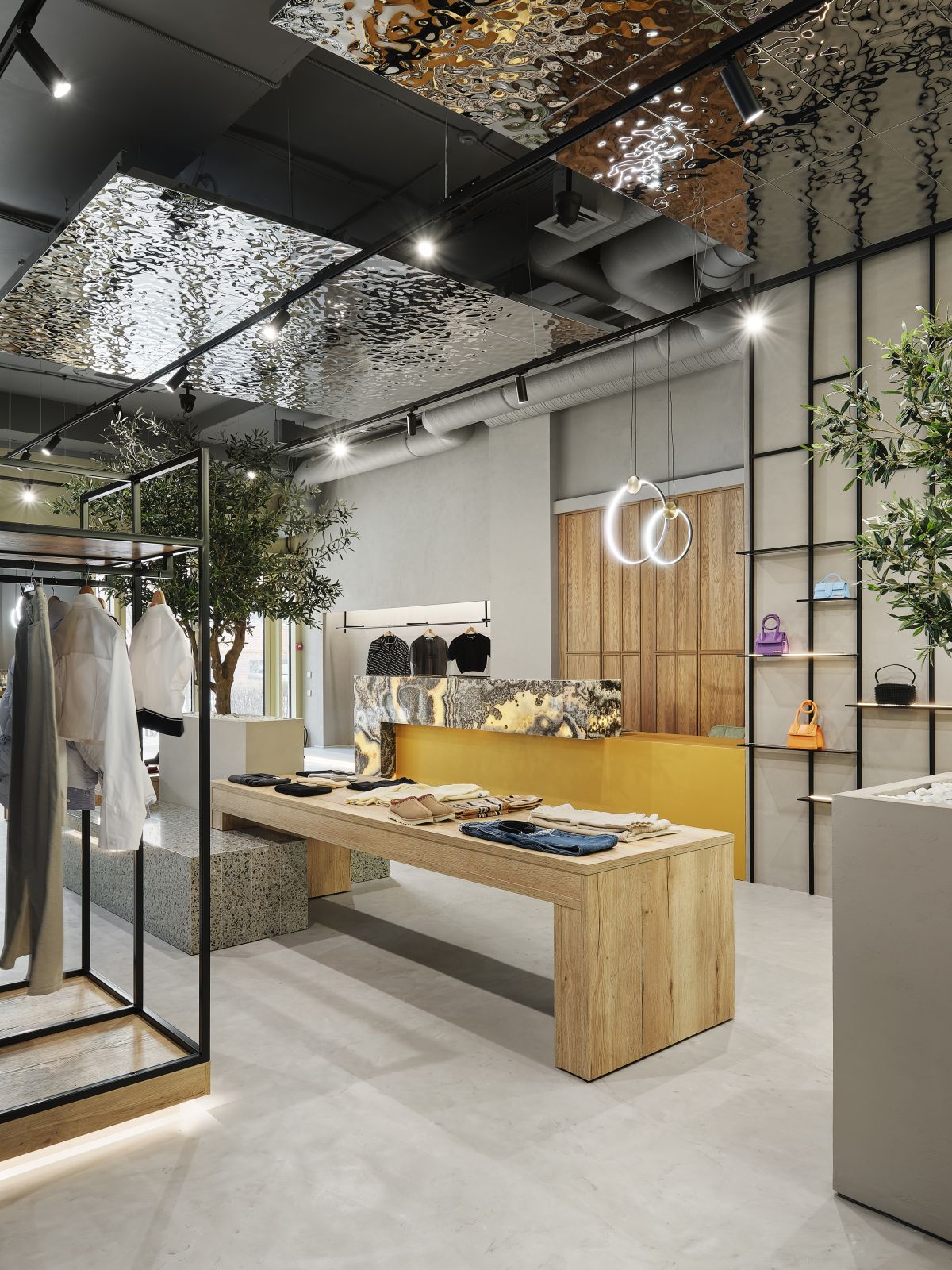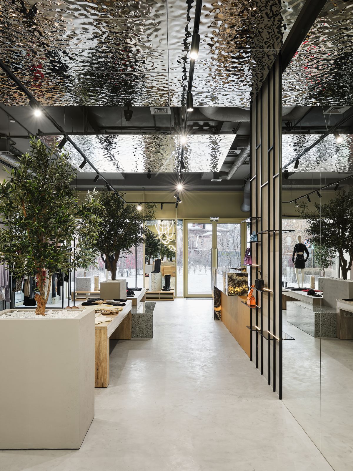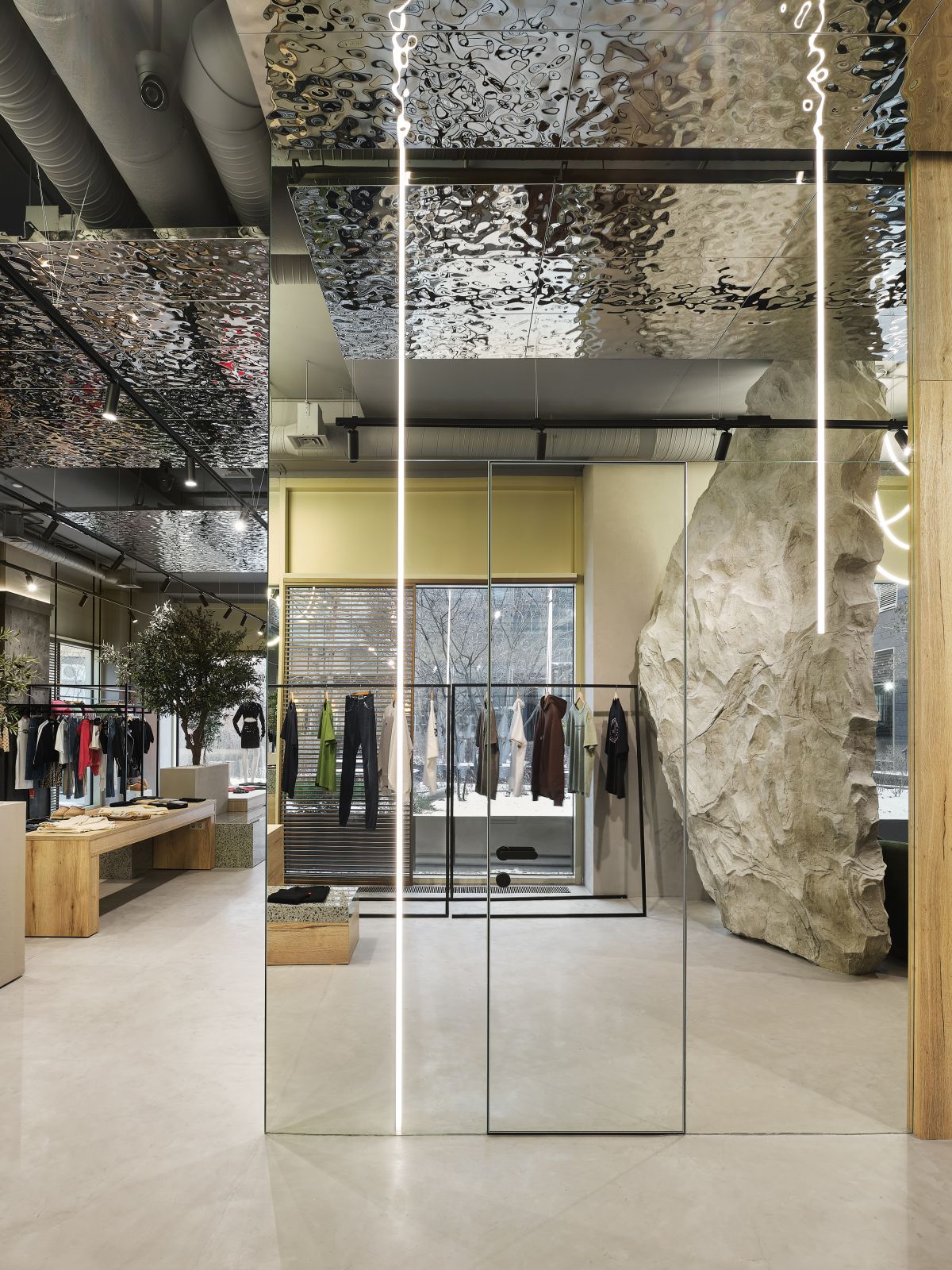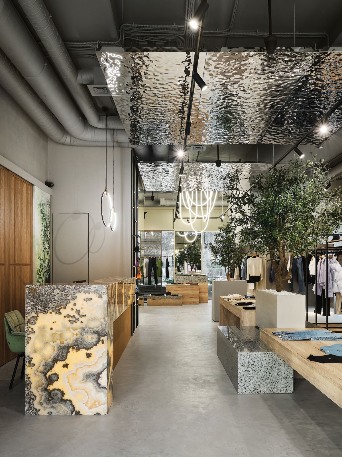 В центре бутика мы высадили оливковые деревья и установили специальные тумбы, декорированные керамогранитом с эффектом терраццо, где можно отдохнуть и зарядить телефон. Зона ожидания у примерочных обозначена декоративной скалой, которая выглядит внушительно и необычно, как настоящий арт-объект. Стойка ресепшн сделана из великолепного натурального оникса, пленяющего выразительным рисунком. Потрескавшаяся штукатурка на черных полуколоннах, нейтральный бетонный пол, панели «Рябь на воде», украшающие потолок (разве не похоже на озеро Комо?), – в этих деталях «вшито» так много параллелей, метафор, ассоциаций, что интерьер см