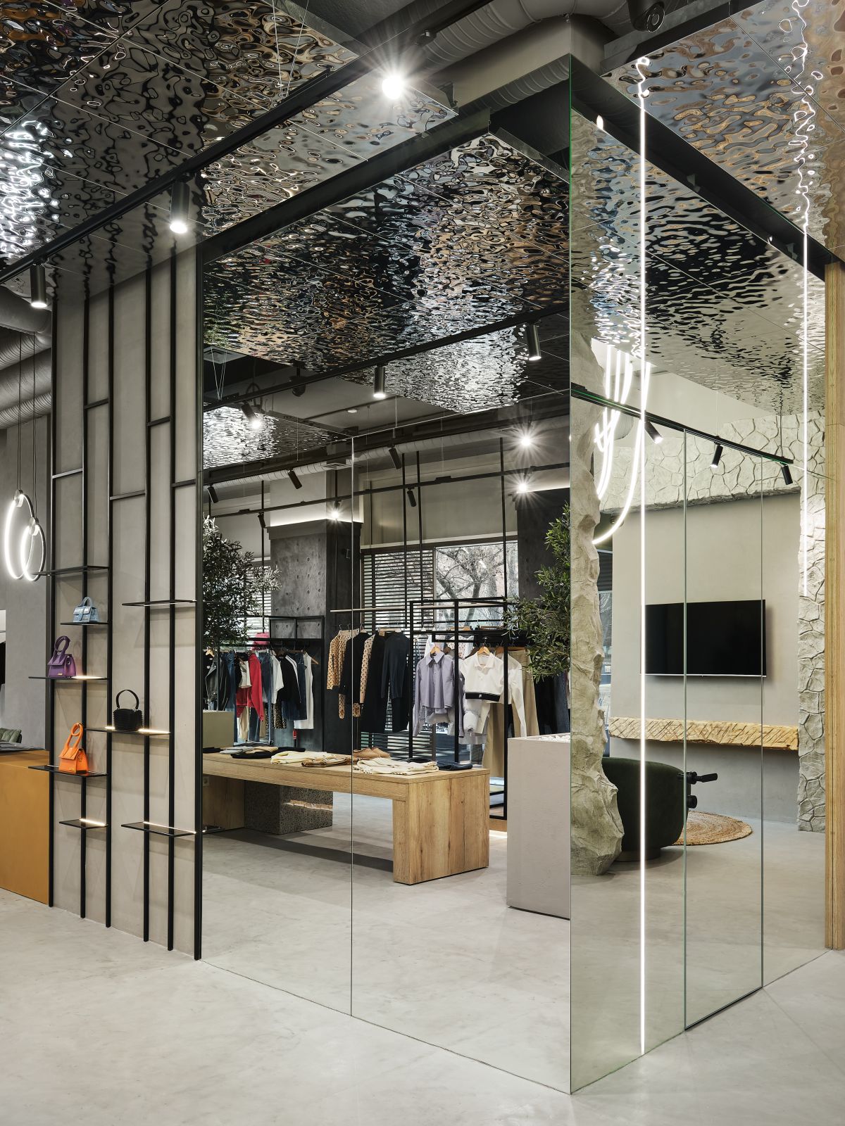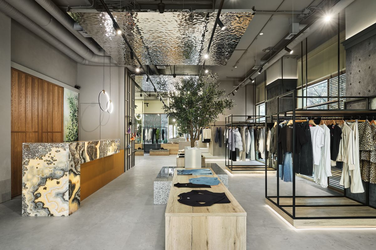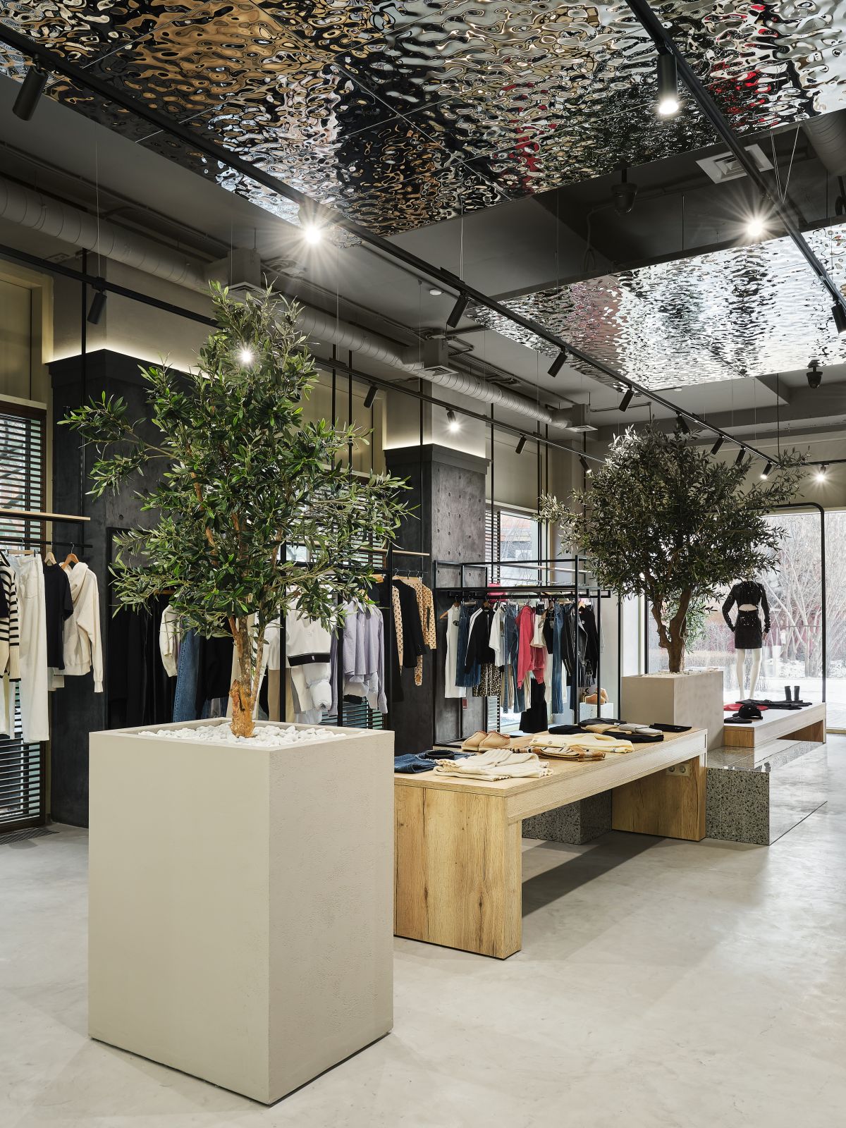 В центре бутика мы высадили оливковые деревья и установили специальные тумбы, декорированные керамогранитом с эффектом терраццо, где можно отдохнуть и зарядить телефон. Зона ожидания у примерочных обозначена декоративной скалой, которая выглядит внушительно и необычно, как настоящий арт-объект. Стойка ресепшн сделана из великолепного натурального оникса, пленяющего выразительным рисунком. Потрескавшаяся штукатурка на черных полуколоннах, нейтральный бетонный пол, панели «Рябь на воде», украшающие потолок (разве не похоже на озеро Комо?), – в этих деталях «вшито» так много параллелей, метафор, ассоциаций, что интерьер см