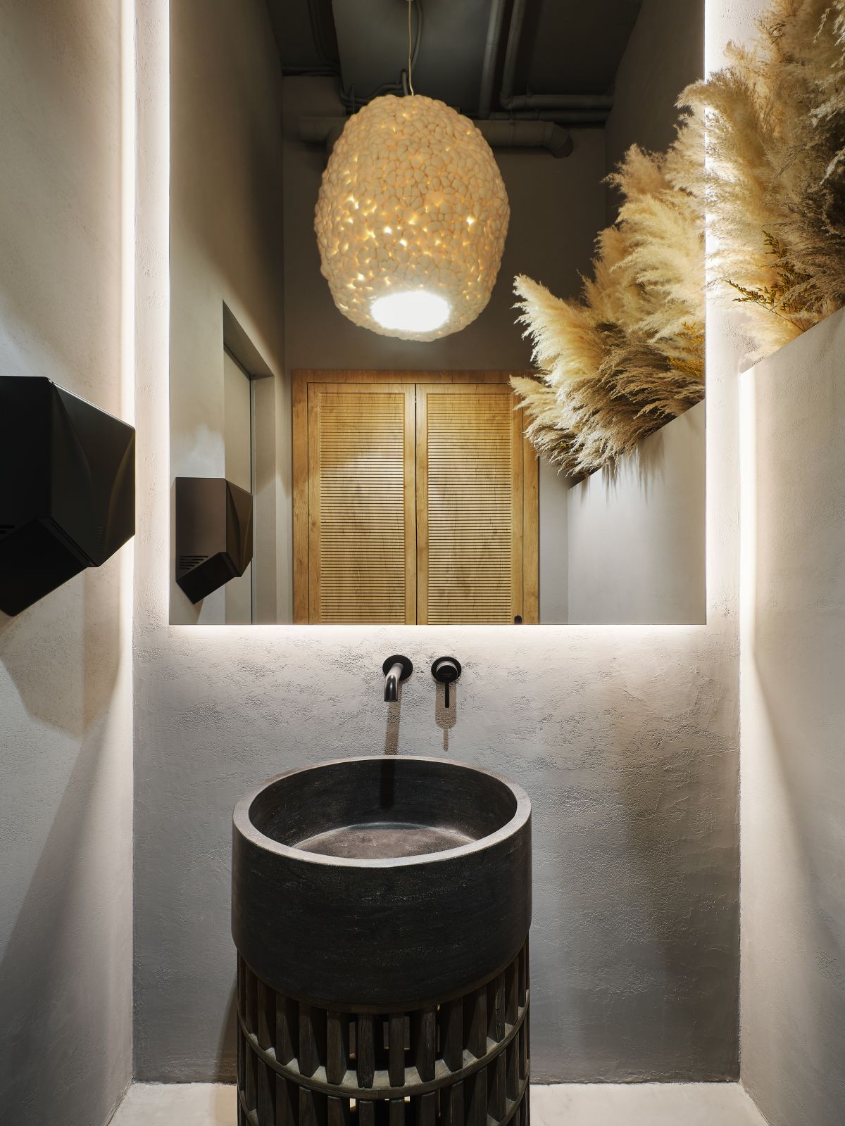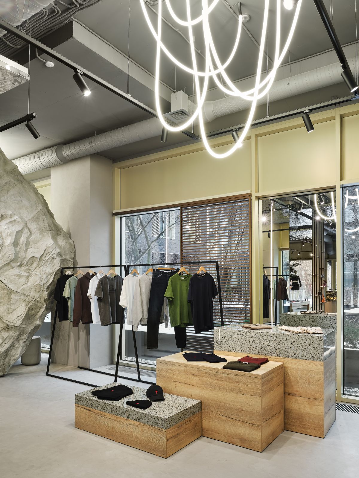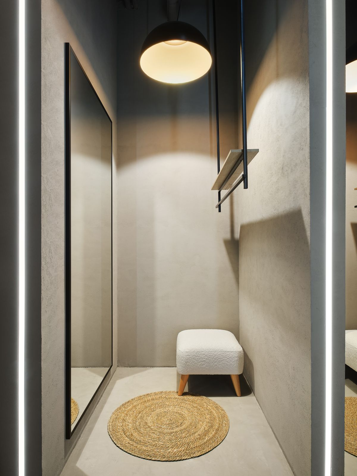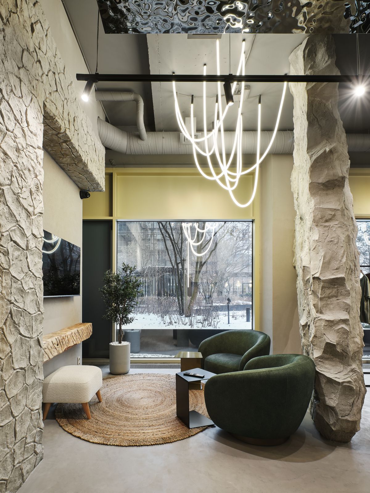 В центре бутика мы высадили оливковые деревья и установили специальные тумбы, декорированные керамогранитом с эффектом терраццо, где можно отдохнуть и зарядить телефон. Зона ожидания у примерочных обозначена декоративной скалой, которая выглядит внушительно и необычно, как настоящий арт-объект. Стойка ресепшн сделана из великолепного натурального оникса, пленяющего выразительным рисунком. Потрескавшаяся штукатурка на черных полуколоннах, нейтральный бетонный пол, панели «Рябь на воде», украшающие потолок (разве не похоже на озеро Комо?), – в этих деталях «вшито» так много параллелей, метафор, ассоциаций, что интерьер см