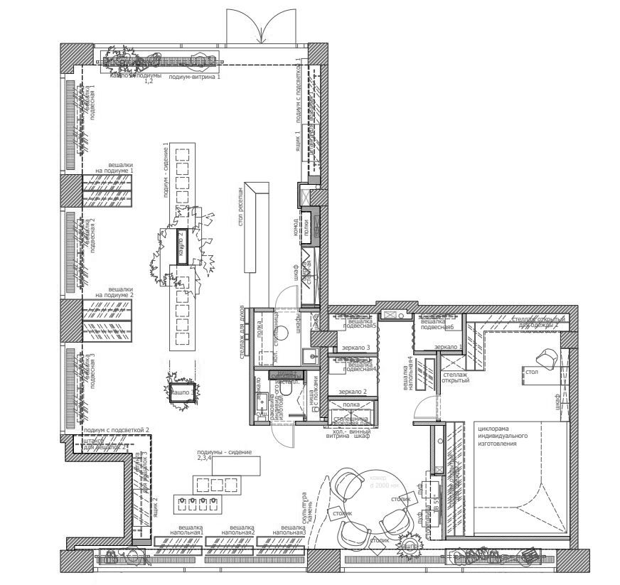 Функциональное пространство, которое должно привлекать посетителей, отображать стиль представленных брендов — основная задача, которую поставили Заказчики, при проектировании бутика.