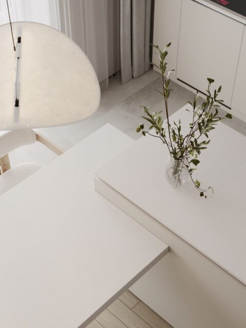 При проектировании интерьера была произведена перепланировка входной зоны, что позволило гармонично зонировать пространство квартиры. Входная зона получила доступ к естественному освещению, при этом сохранив свою изолированность и избегая ощущения транзитного пространства. Просторная объединенная столовая с обеденной зоной создает удобное дополнение к кухне, где компактная и организованная рабочая зона отвечает всем требованиям функциональности. Небольшая, но уютная гостиная с TV-зоной непосредственно примыкает к входной части, обеспечивая удобный доступ. Связка зон — гостиной, столовой и кухни — формирует кольцевое движение, что добавляет пространству динамичности. Также в квартире предусмотрены детская комната и спальня родителей с лоджией, где оборудована зона кабинета.